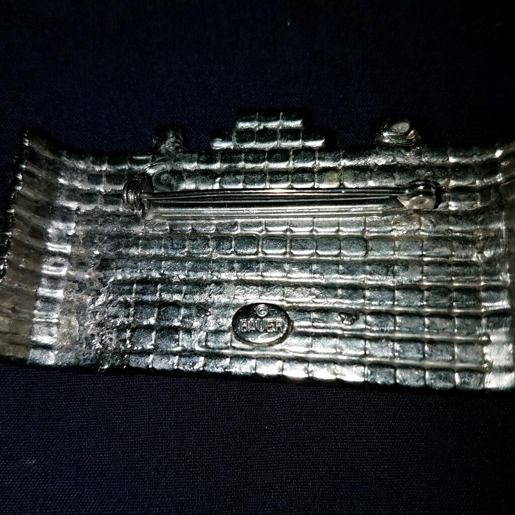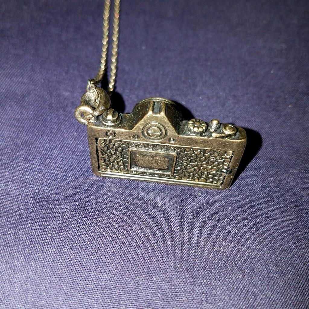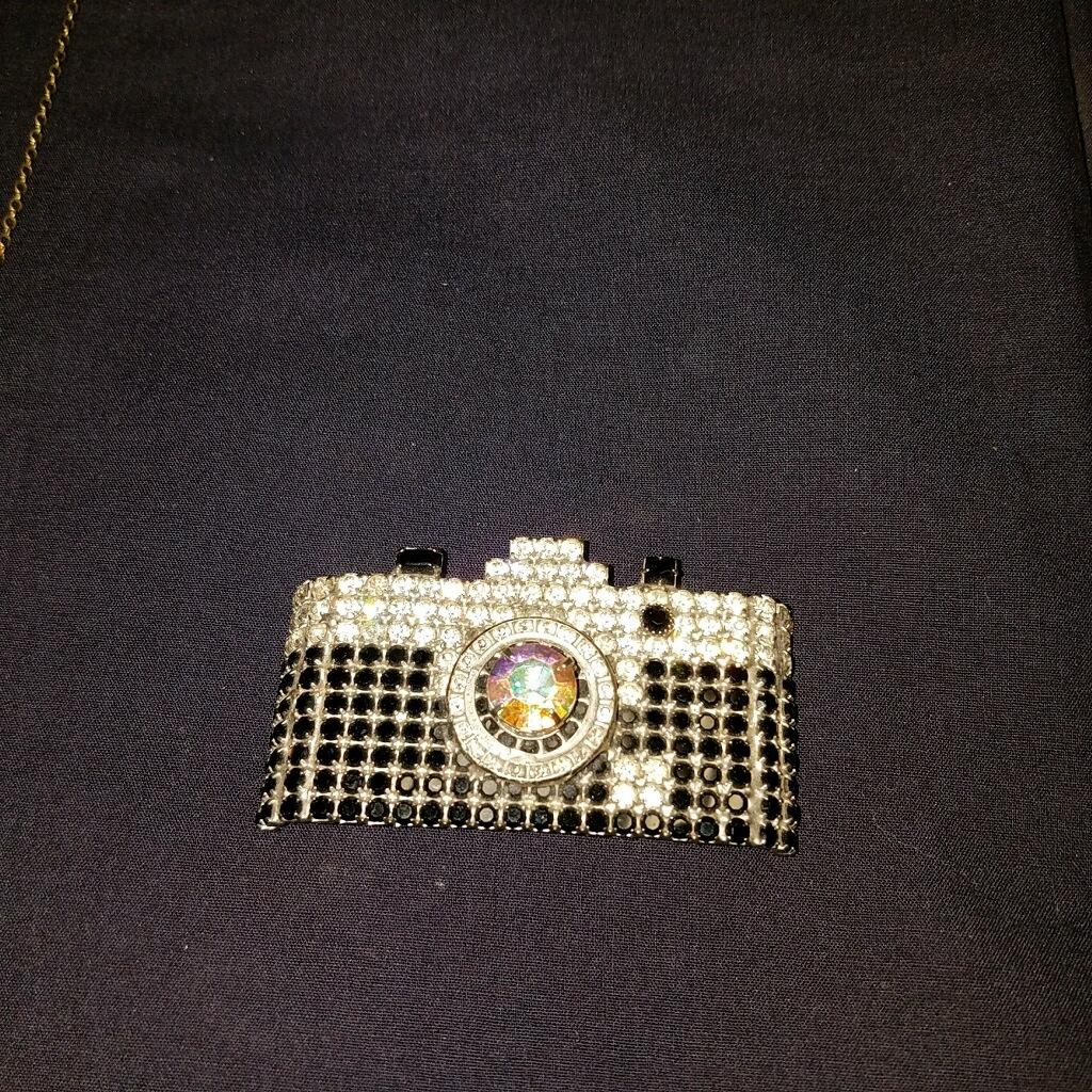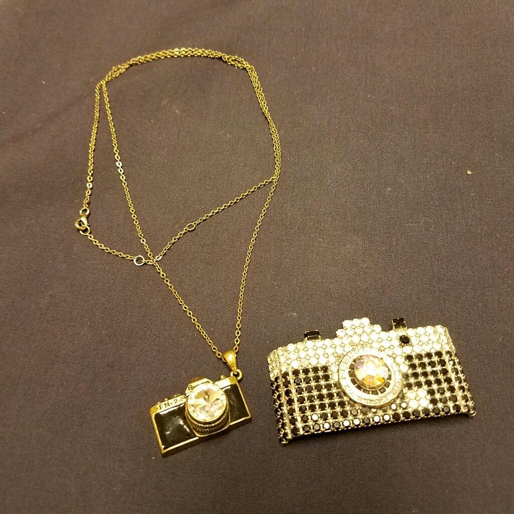 Jewelry Lot B. Camera necklace and pin. Very good condition, no missing stones. Pin marked Bauer