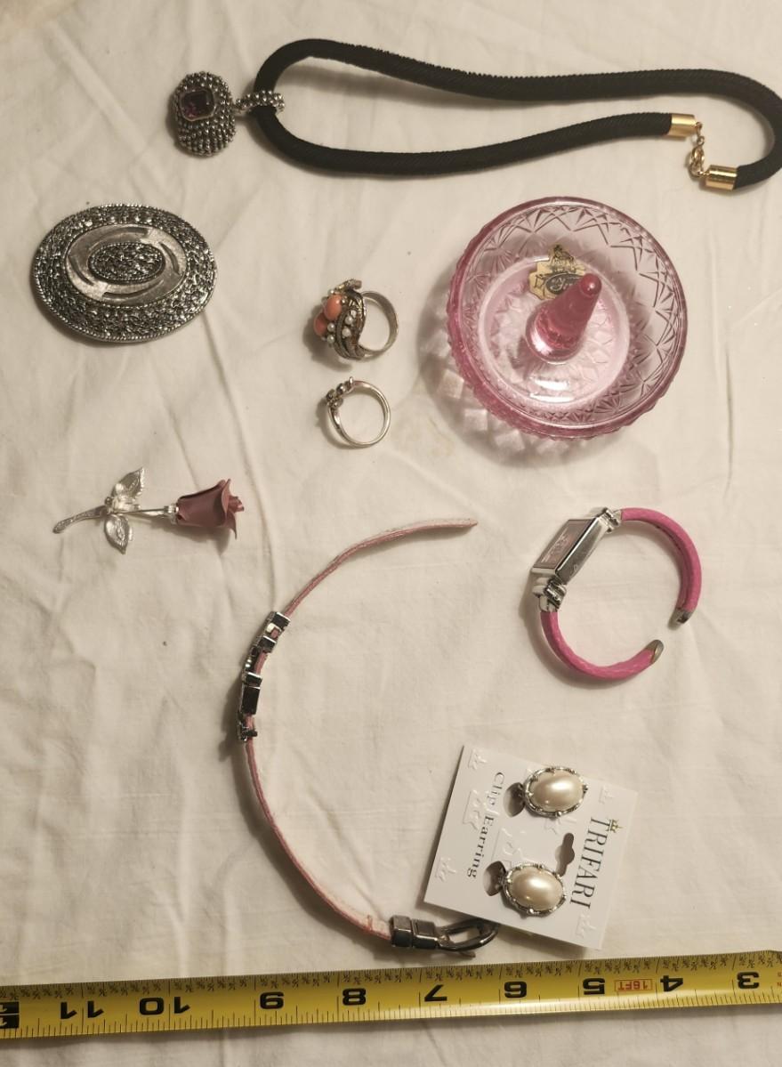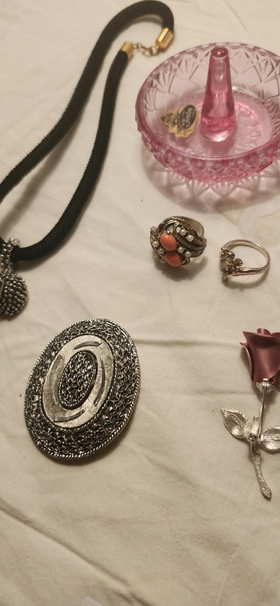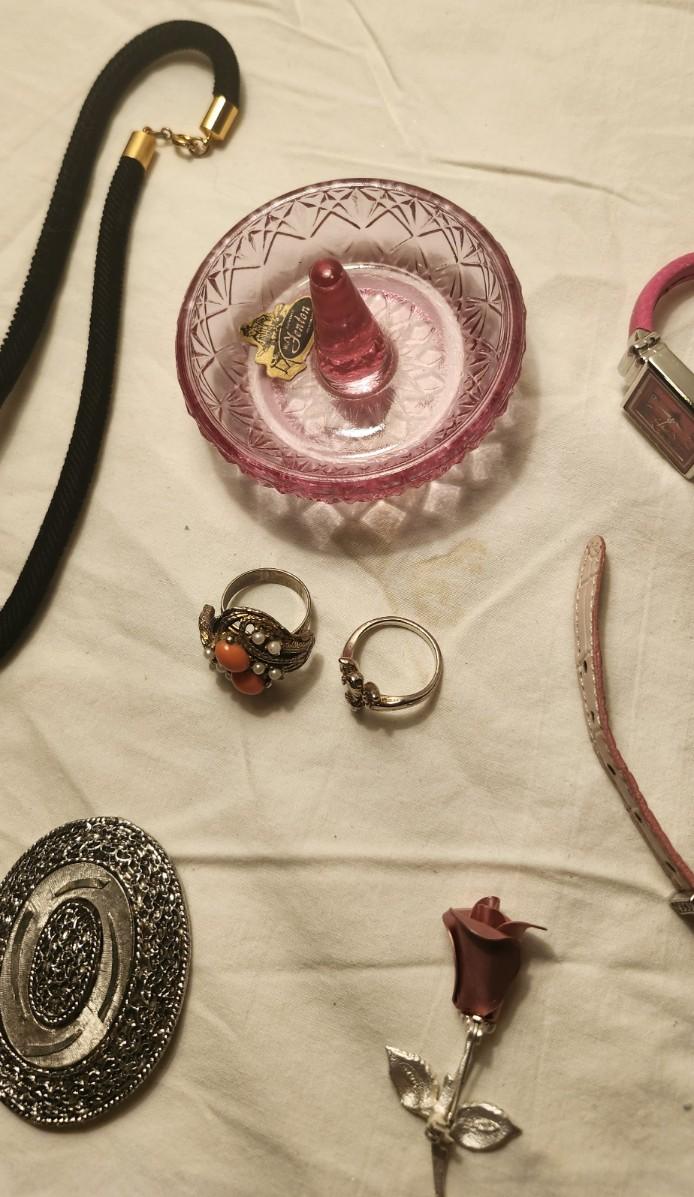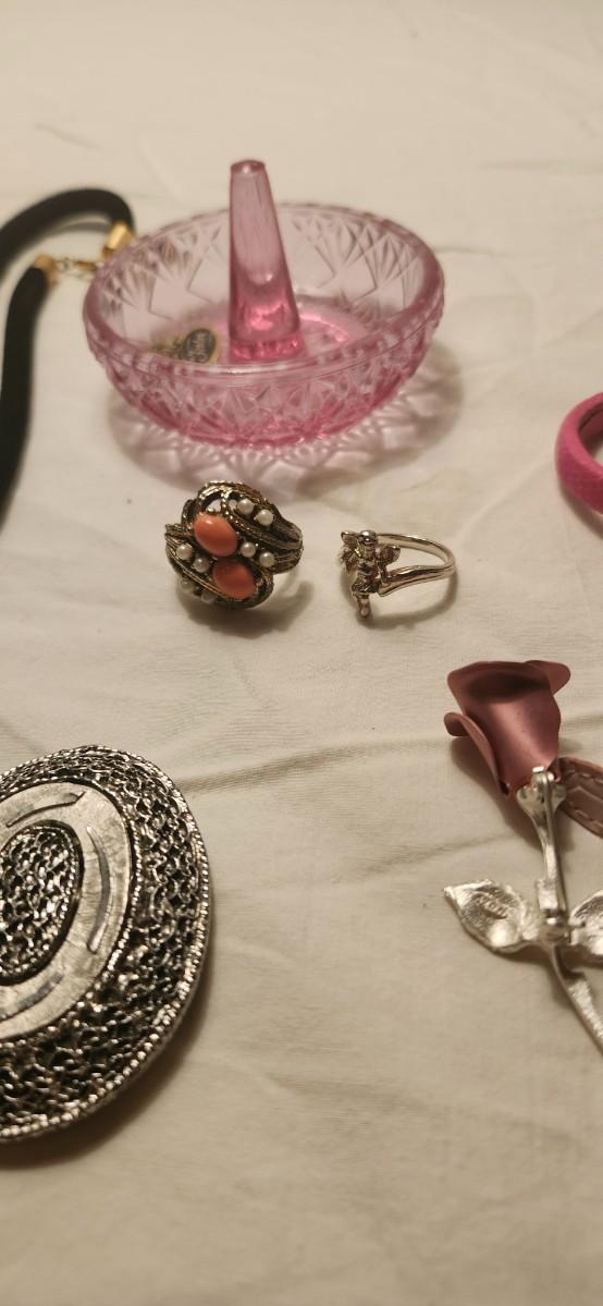 Jewelry lot including Some Vintage Jewelry, Fenton Pink Dusty Rose Color Round Ring Holder