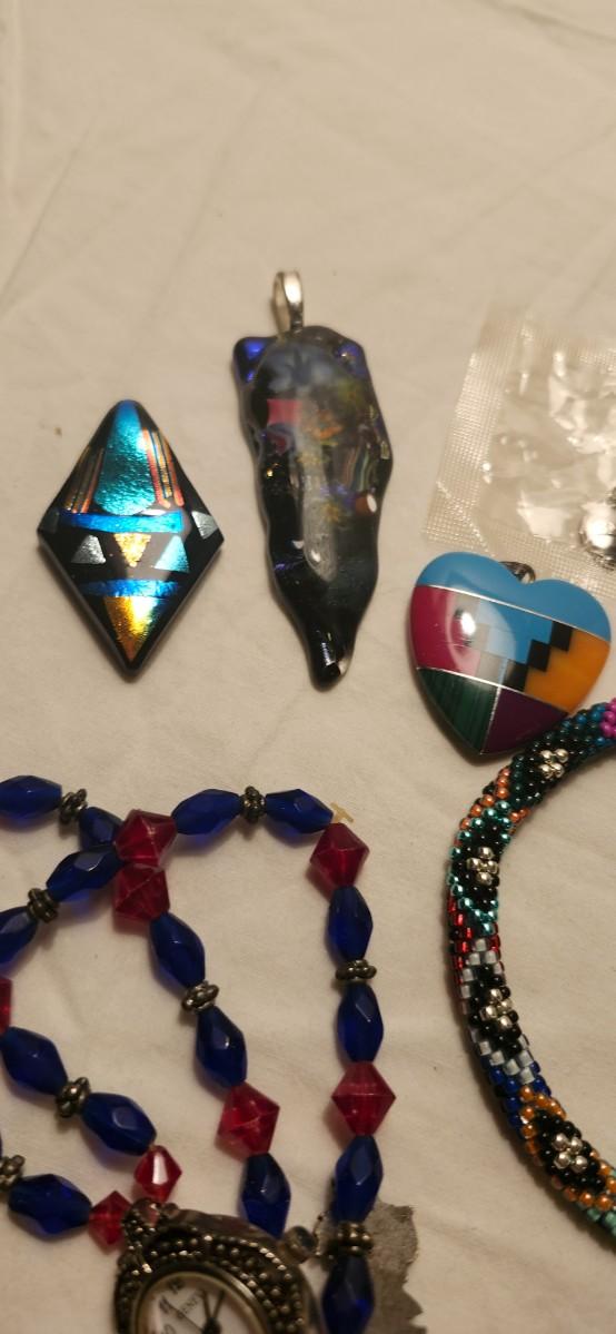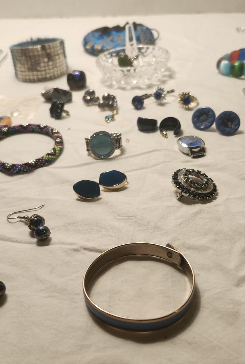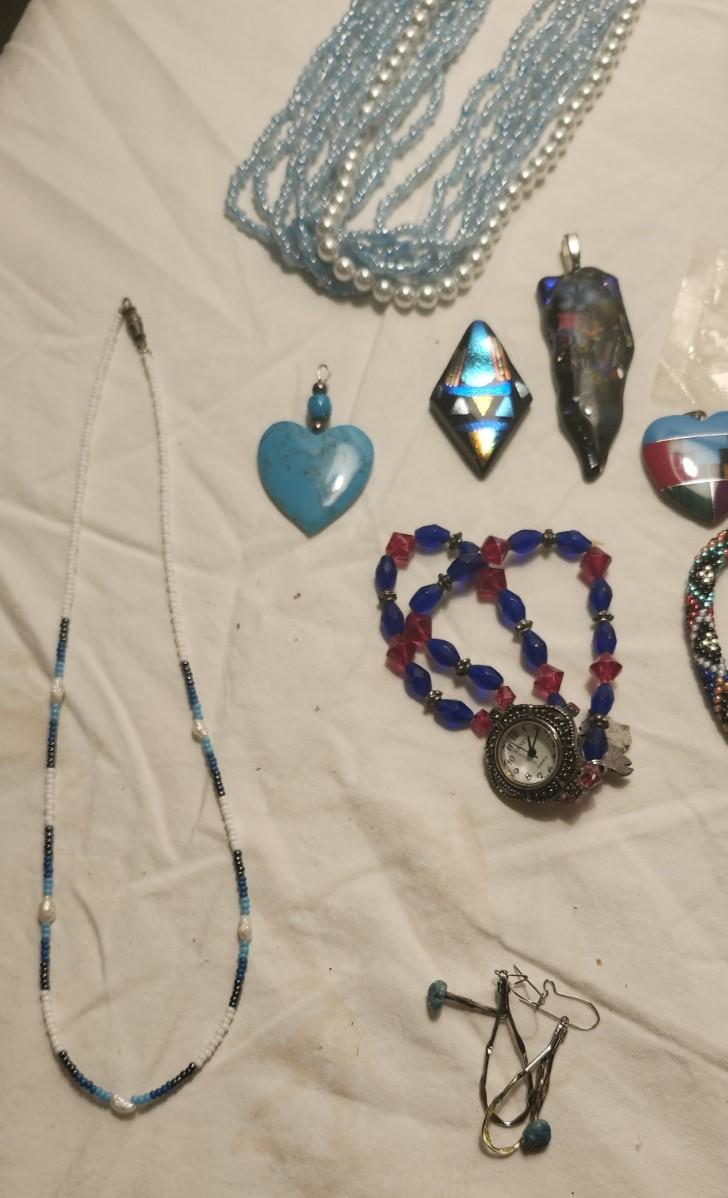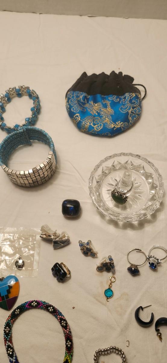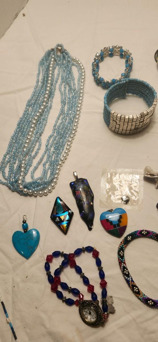 Jewelry lot including Some Vintage Jewelry including Fuse Glass, Blue Aqua Cluster Bracelet