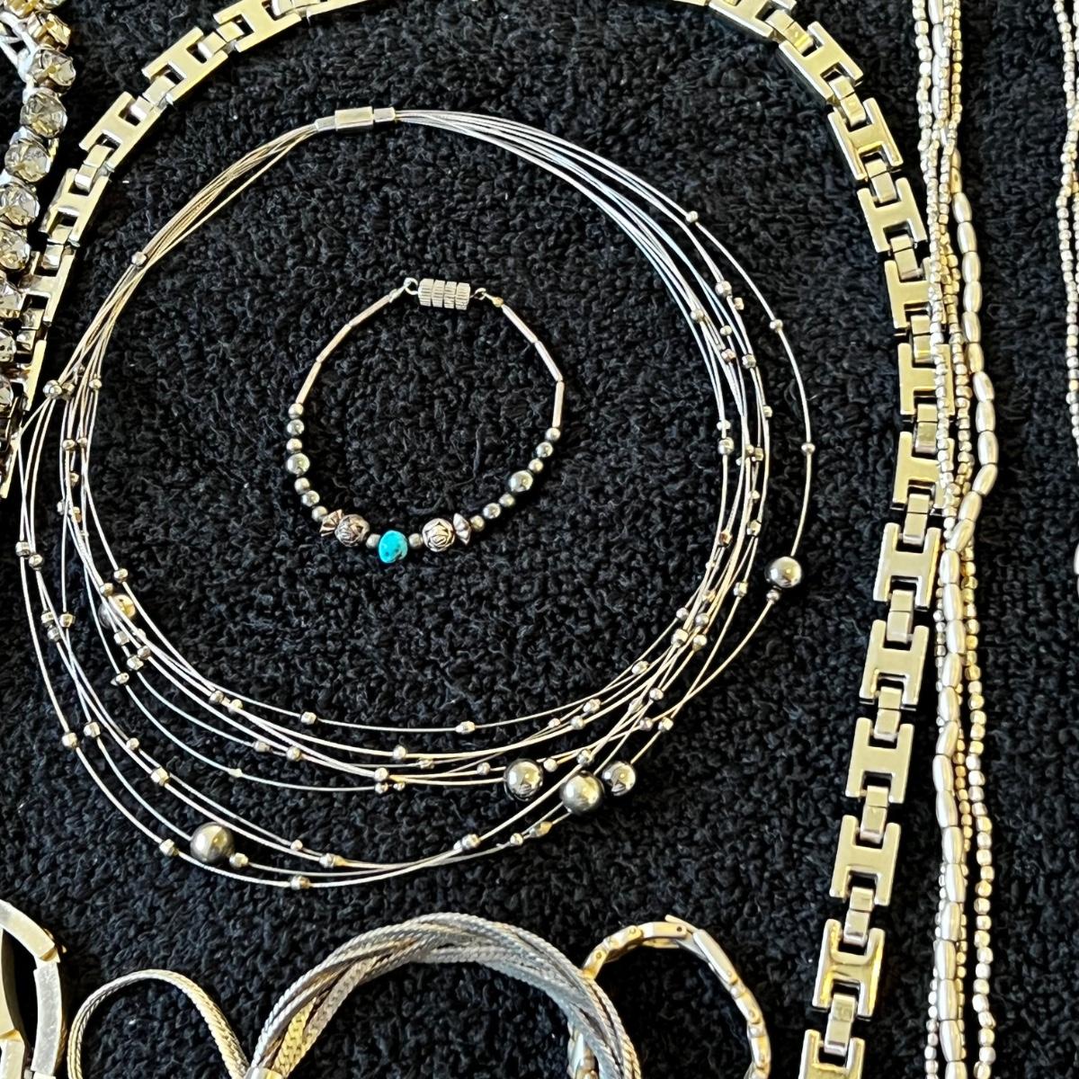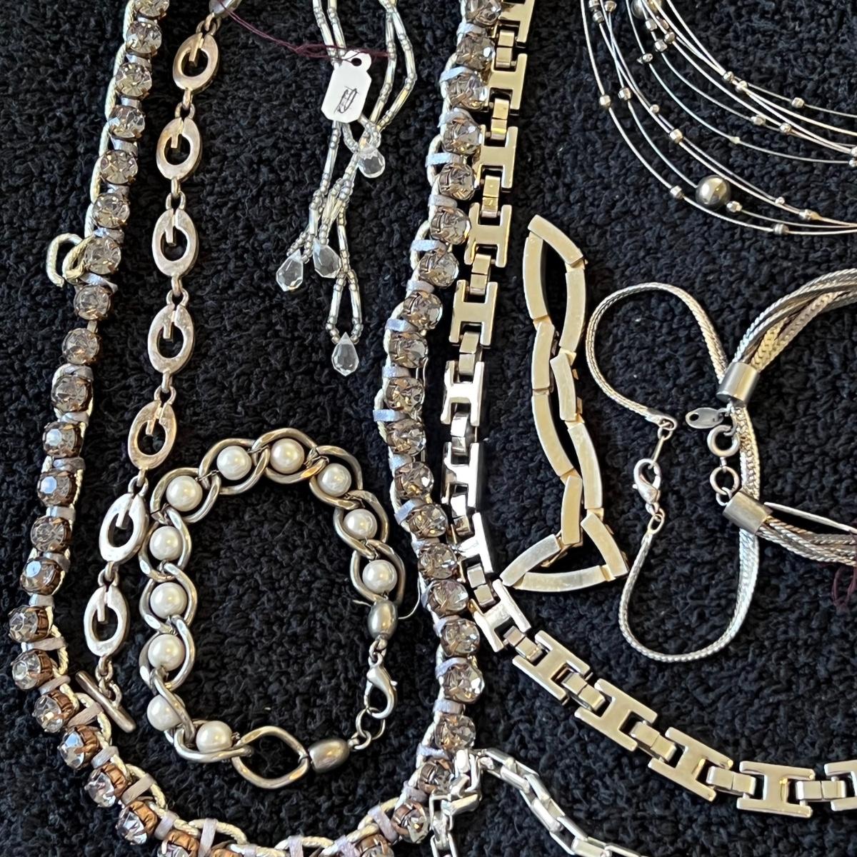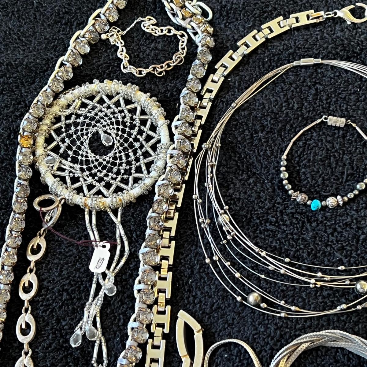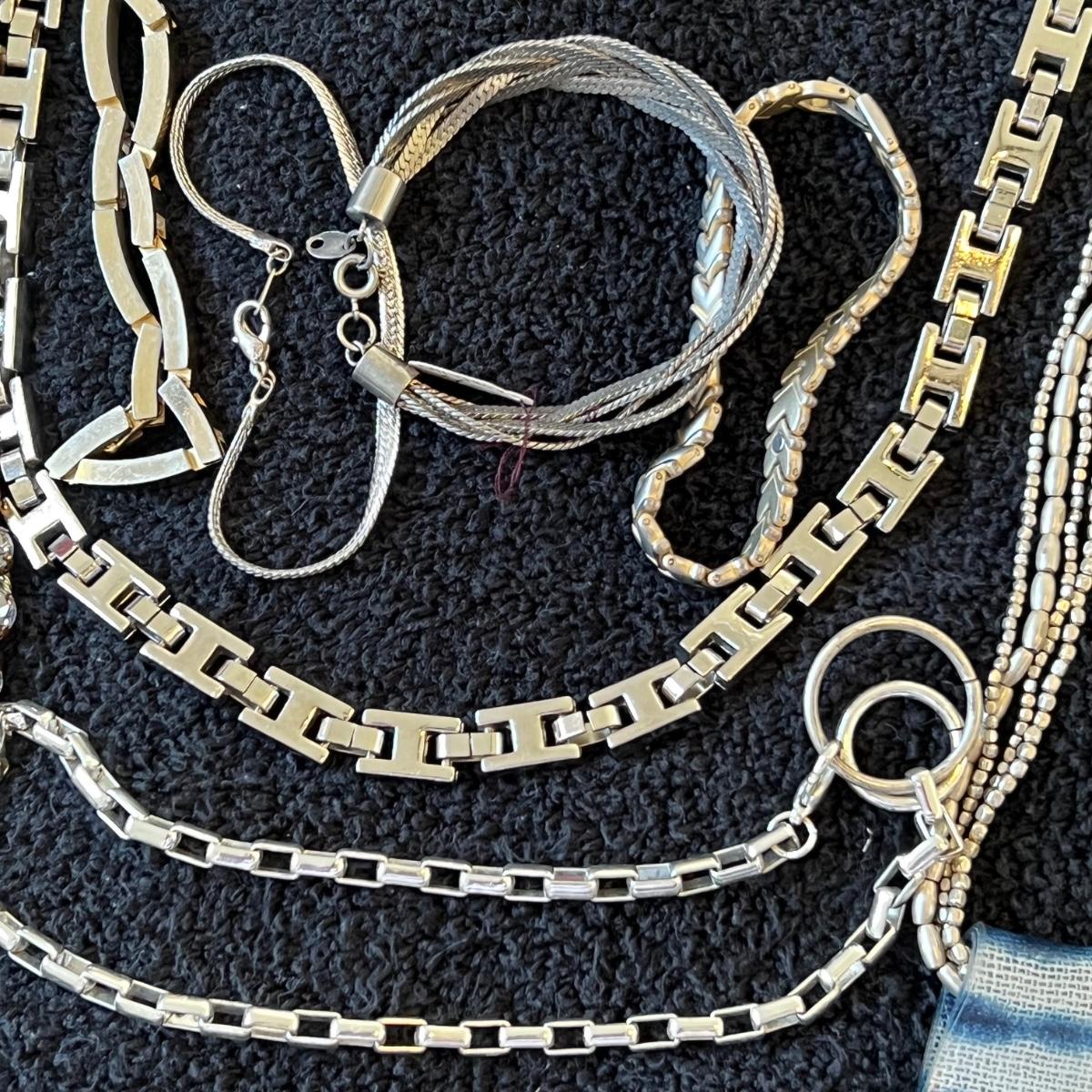 Not 925. Lot of various silver toned jewelry. Necklaces and bracelets. All have been worn.