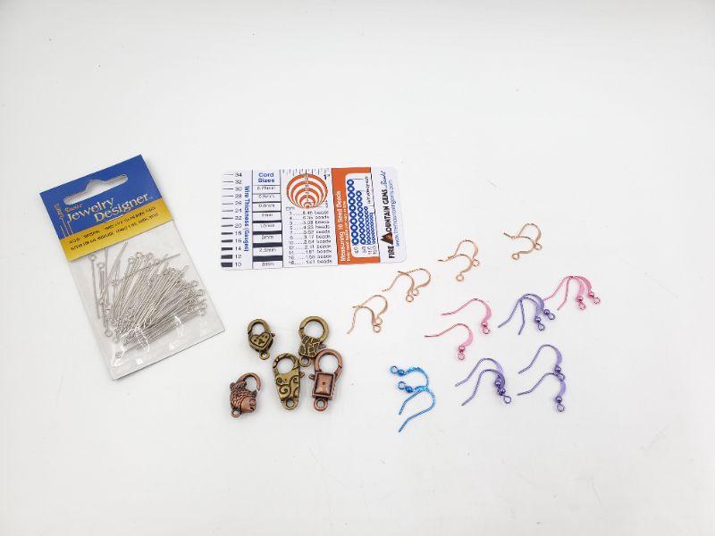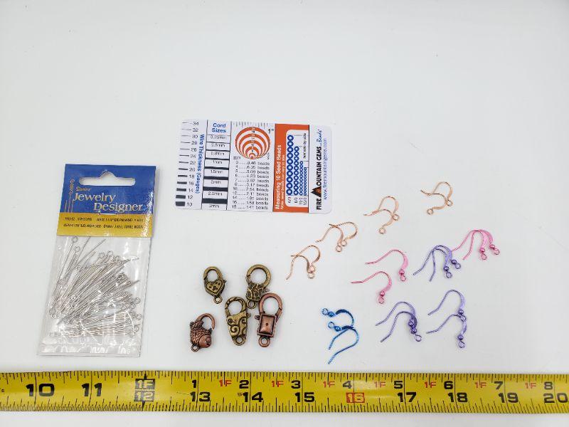 10 sets of fish hooks for earrings, 5 various clasps and a package of Darice 50pc brass 1-1/4" eye pin nickel plated new in package and a measuring tool/card