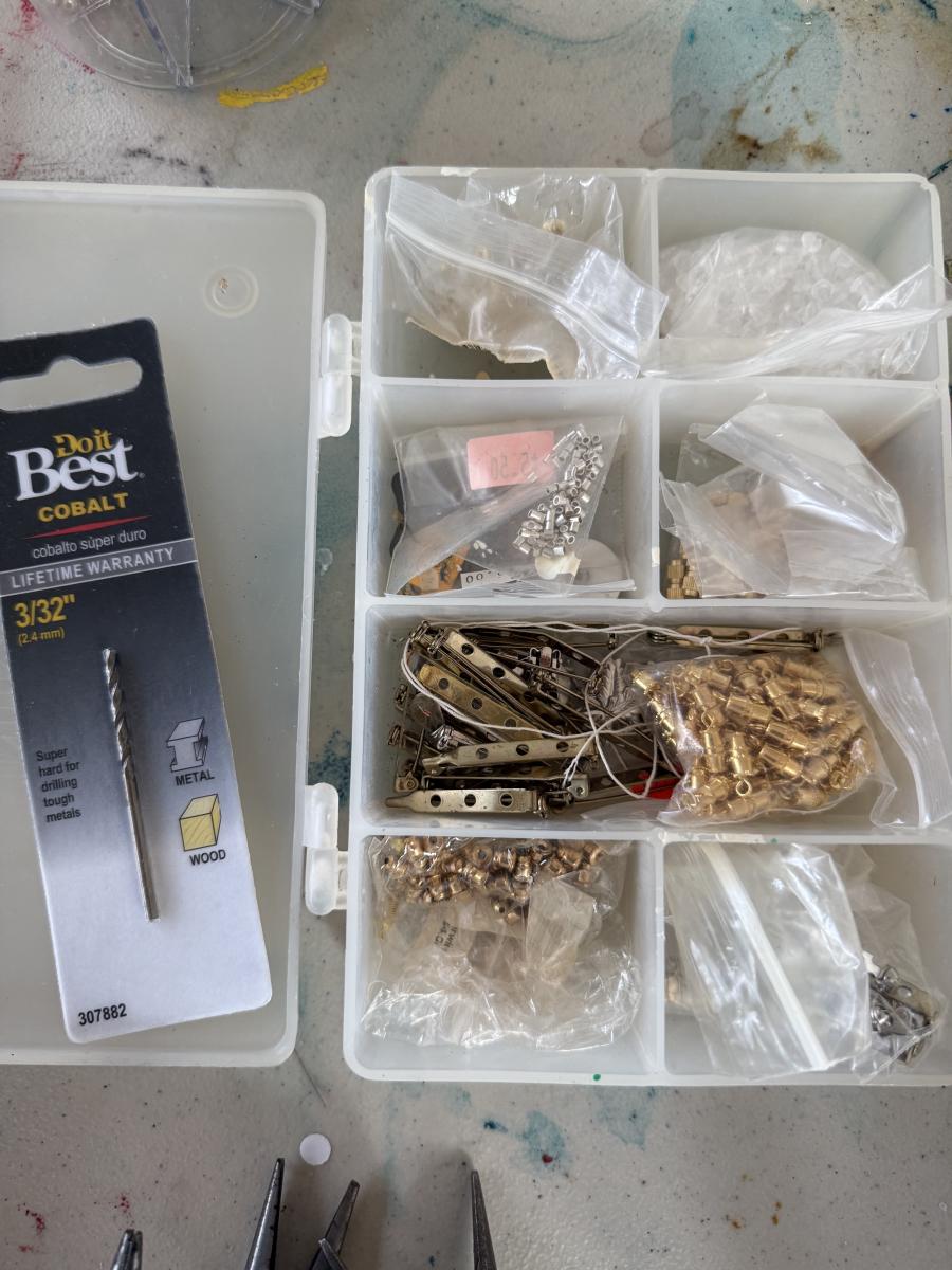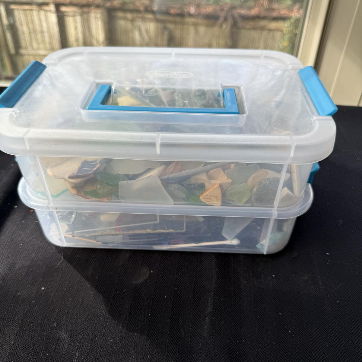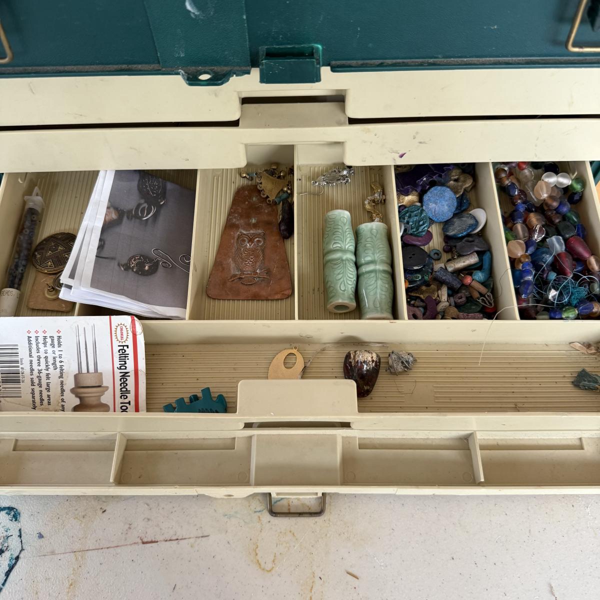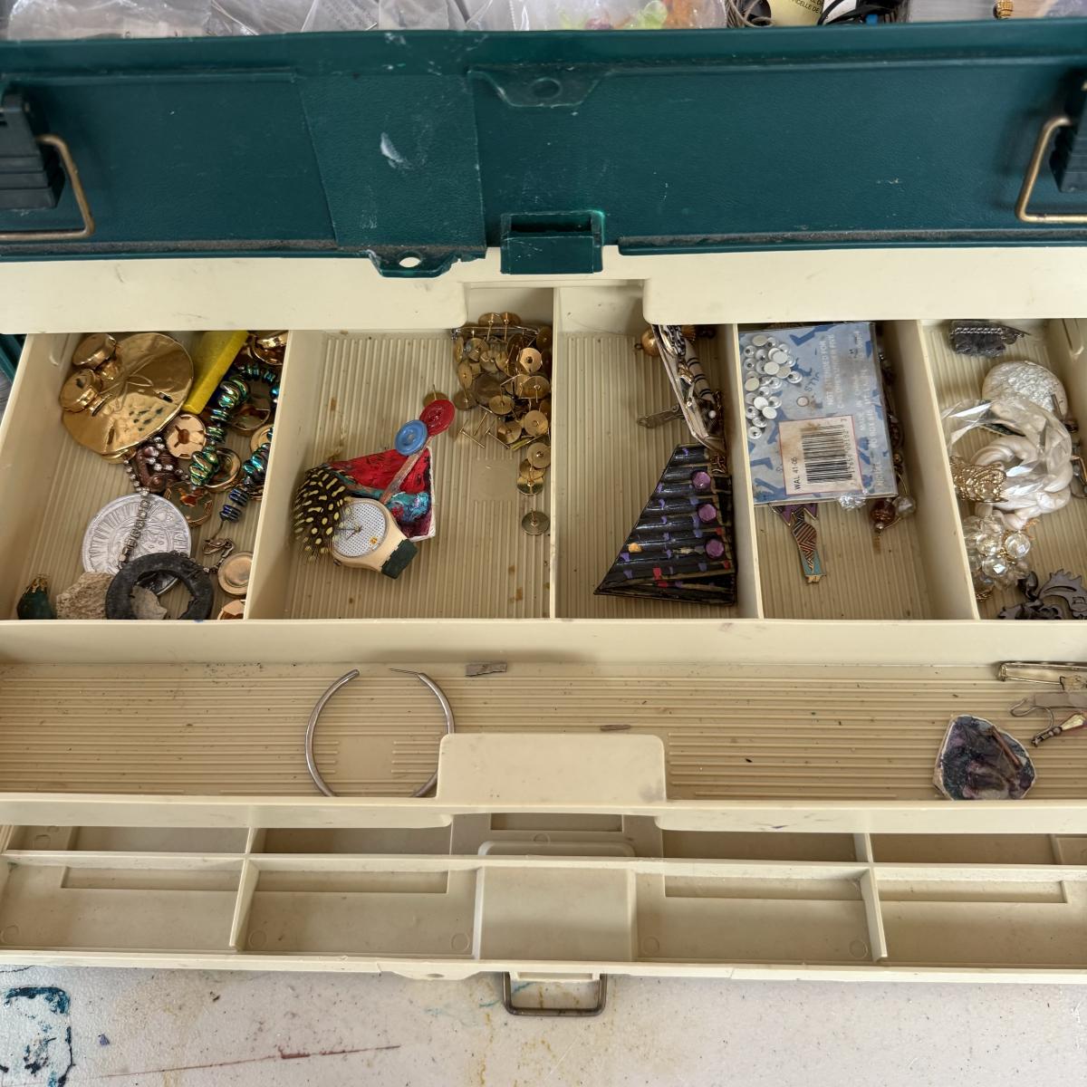 An extensive selection of crafting materials, jewelry making materials and supplies including craft mats, T-Squares and fasteners. Fourteen various types of pliers, collection of clay working tools, over six trays of crafting supplies including beads, shells, buttons, and other miscellaneous elements. Four bags of rings, eight miscellaneous spools of wire, solder and plastic line as well leather and cotton cord, beading and elastic thread. A wide assortment of clasps as shown in photos. Two bins each 7” X 9.5” X 2.5” filled with miscellaneous stained glass and frosted sea glass pieces that lock together and become a carrying case. Four sizes of plastic jewelry bags as shown in photos. A large assortment rubber stamps as well as Hebrew letters assembled in a 14” X 11” X 3.5”H plastic case and large bin as shown. A large assortment of poetic/memorable “expressions”. Two 6”X6” white tiles and six 4.25” X 4.25” square tiles. Lot includes the large 16.5” X 8.5”X 12”H plastic case.
