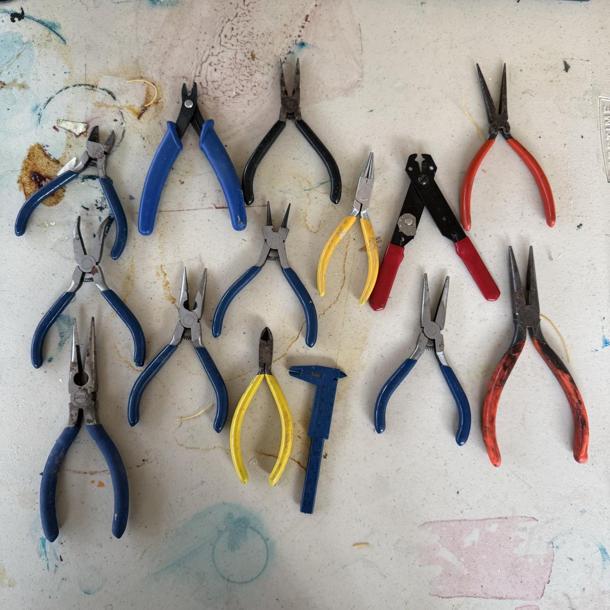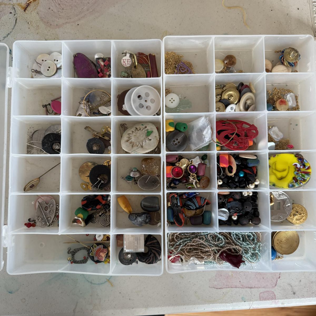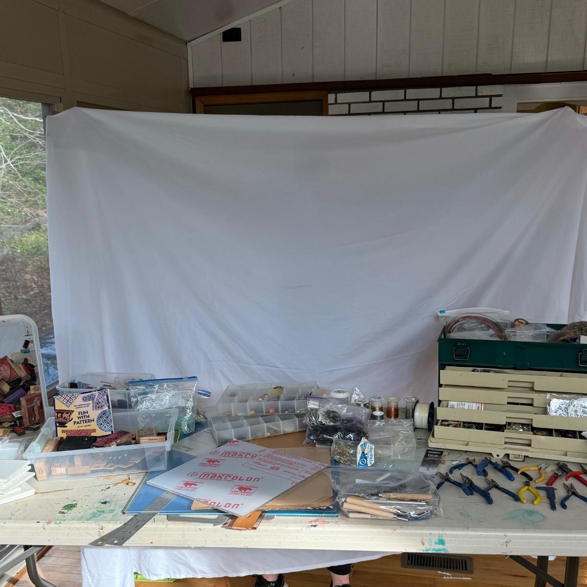 An extensive selection of crafting materials, jewelry making materials and supplies including craft mats, T-Squares and fasteners. Fourteen various types of pliers, collection of clay working tools, over six trays of crafting supplies including beads, shells, buttons, and other miscellaneous elements. Four bags of rings, eight miscellaneous spools of wire, solder and plastic line as well leather and cotton cord, beading and elastic thread. A wide assortment of clasps as shown in photos. Two bins each 7” X 9.5” X 2.5” filled with miscellaneous stained glass and frosted sea glass pieces that lock together and become a carrying case. Four sizes of plastic jewelry bags as shown in photos. A large assortment rubber stamps as well as Hebrew letters assembled in a 14” X 11” X 3.5”H plastic case and large bin as shown. A large assortment of poetic/memorable “expressions”. Two 6”X6” white tiles and six 4.25” X 4.25” square tiles. Lot includes the large 16.5” X 8.5”X 12”H plastic case.