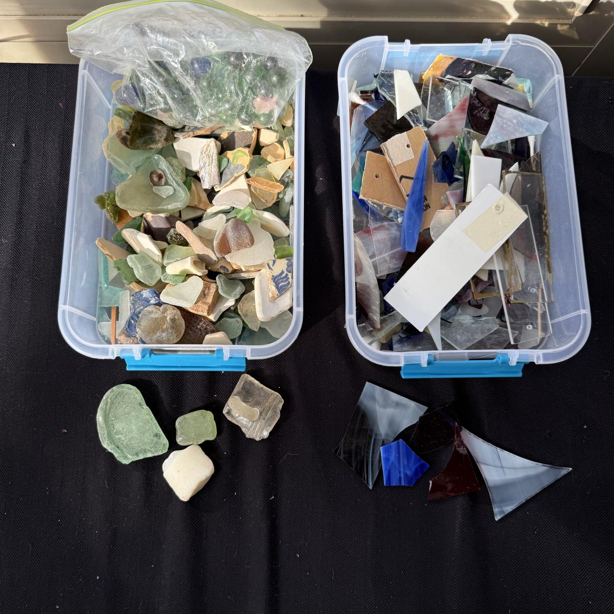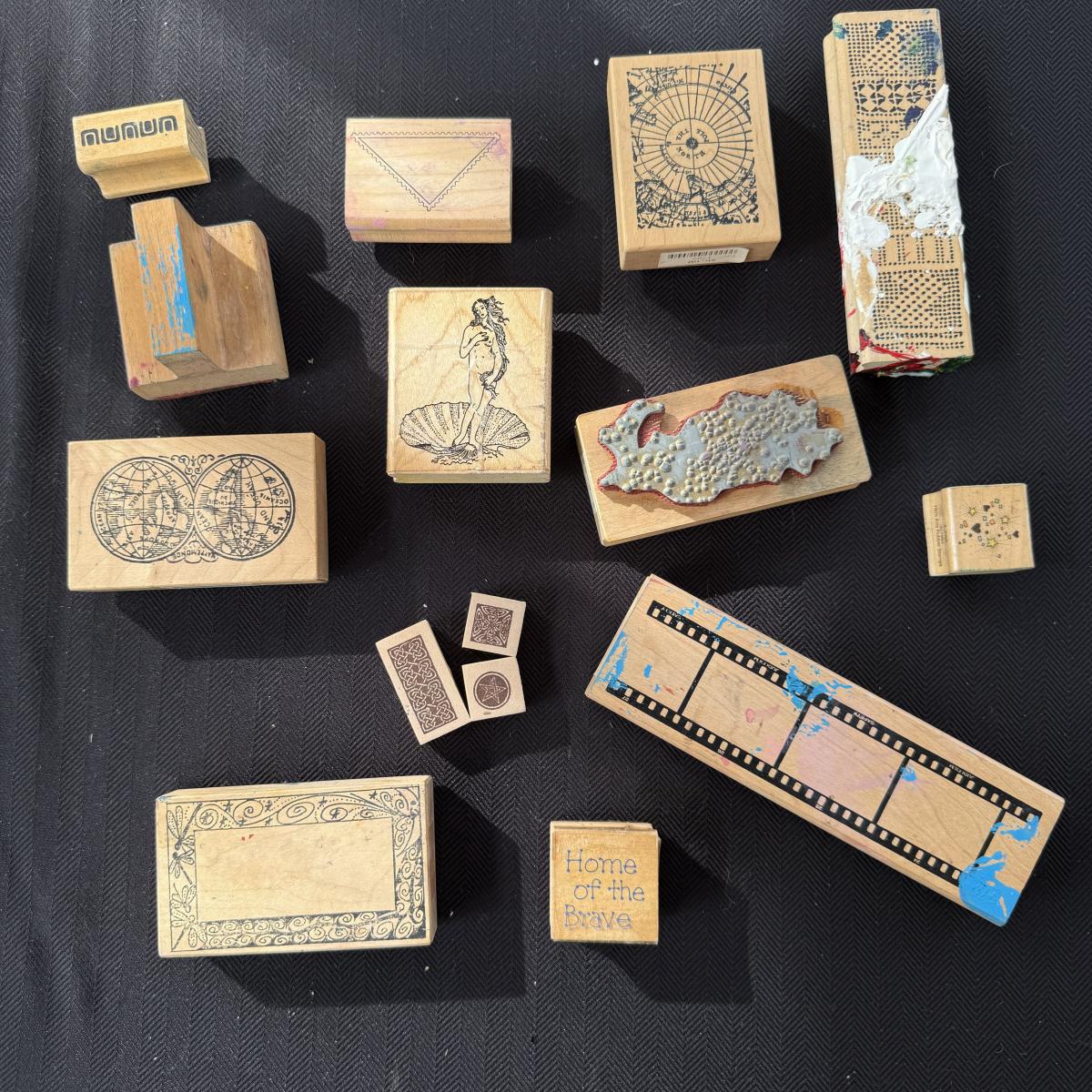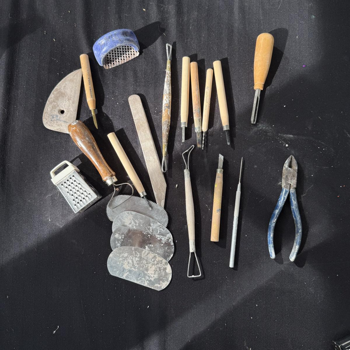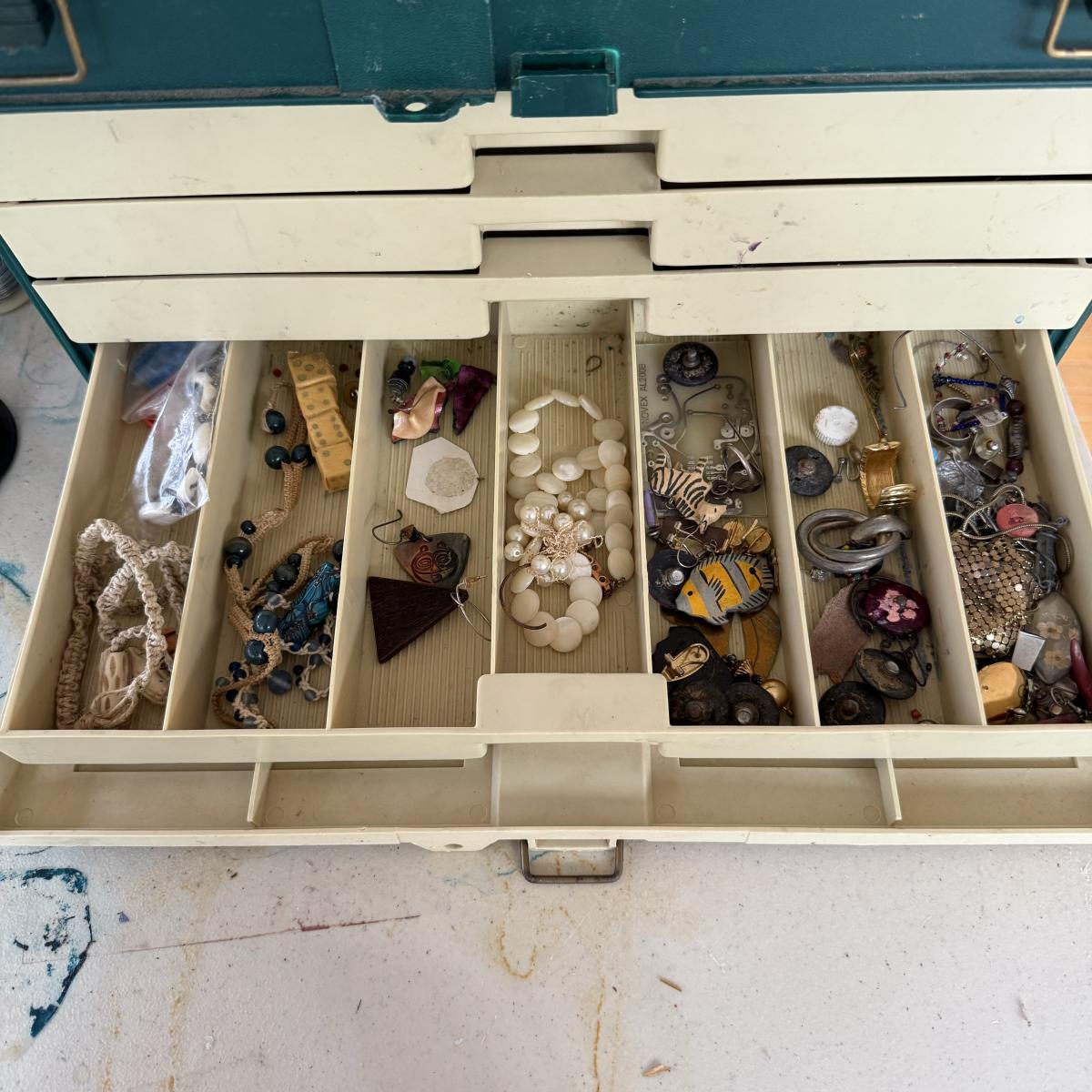 An extensive selection of crafting materials, jewelry making materials and supplies including craft mats, T-Squares and fasteners. Fourteen various types of pliers, collection of clay working tools, over six trays of crafting supplies including beads, shells, buttons, and other miscellaneous elements. Four bags of rings, eight miscellaneous spools of wire, solder and plastic line as well leather and cotton cord, beading and elastic thread. A wide assortment of clasps as shown in photos. Two bins each 7” X 9.5” X 2.5” filled with miscellaneous stained glass and frosted sea glass pieces that lock together and become a carrying case. Four sizes of plastic jewelry bags as shown in photos. A large assortment rubber stamps as well as Hebrew letters assembled in a 14” X 11” X 3.5”H plastic case and large bin as shown. A large assortment of poetic/memorable “expressions”. Two 6”X6” white tiles and six 4.25” X 4.25” square tiles. Lot includes the large 16.5” X 8.5”X 12”H plastic case.