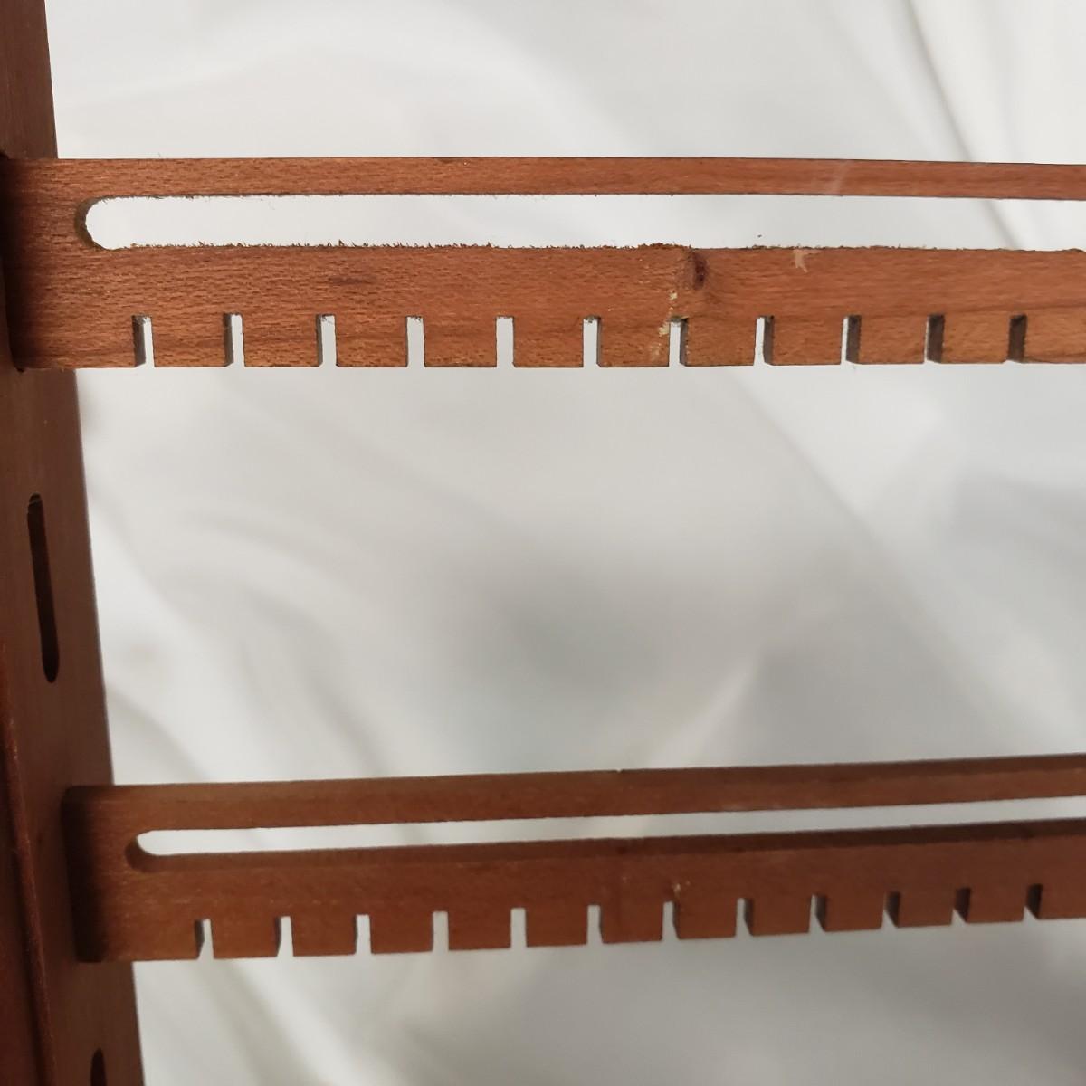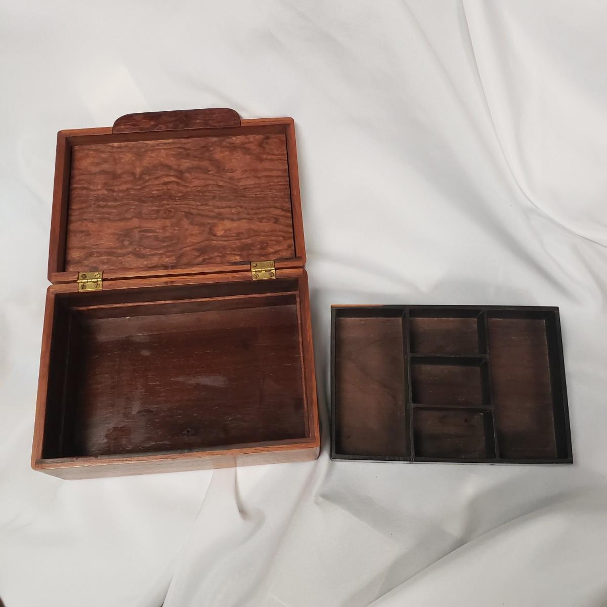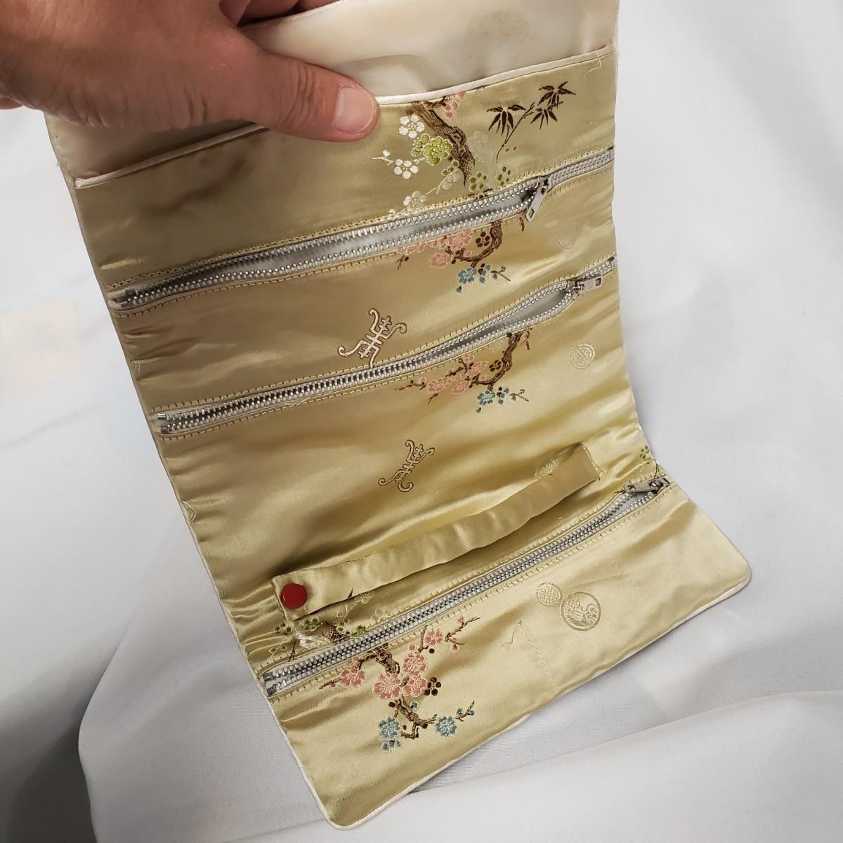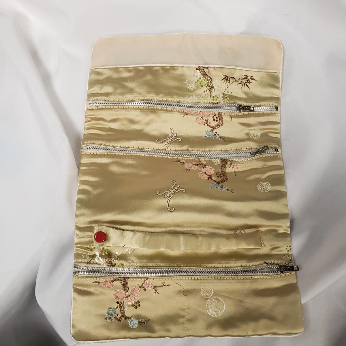 There are two wire racks that can also hang. The silk like material bag with oriental design can roll up for when you travel. The wooden earring rack measures 13" x 1" x 17"H. Finally, is a wooden jewelry box with a removable tray.