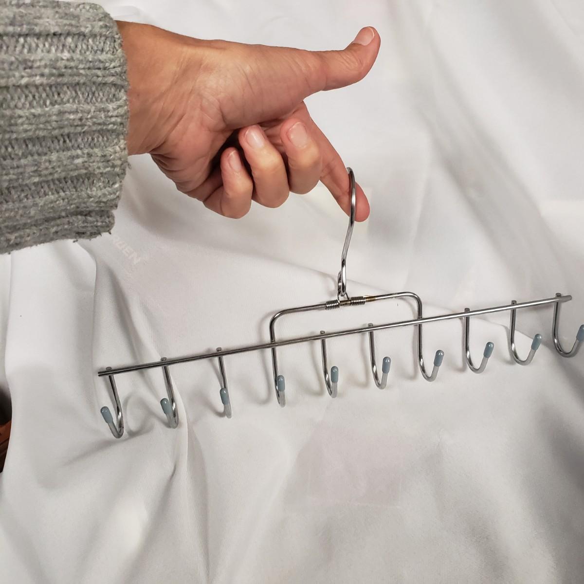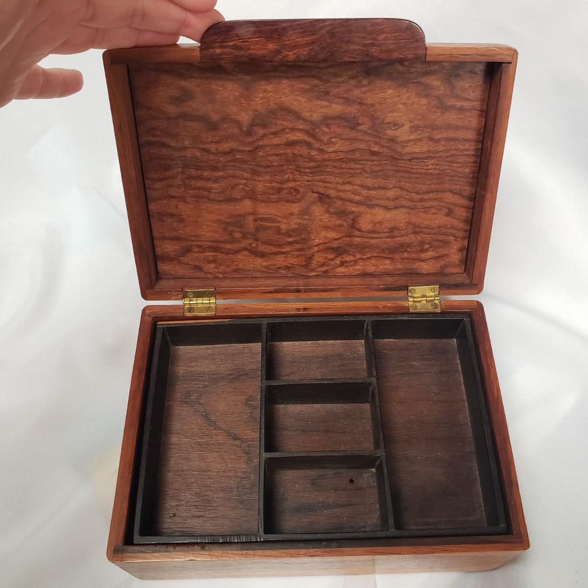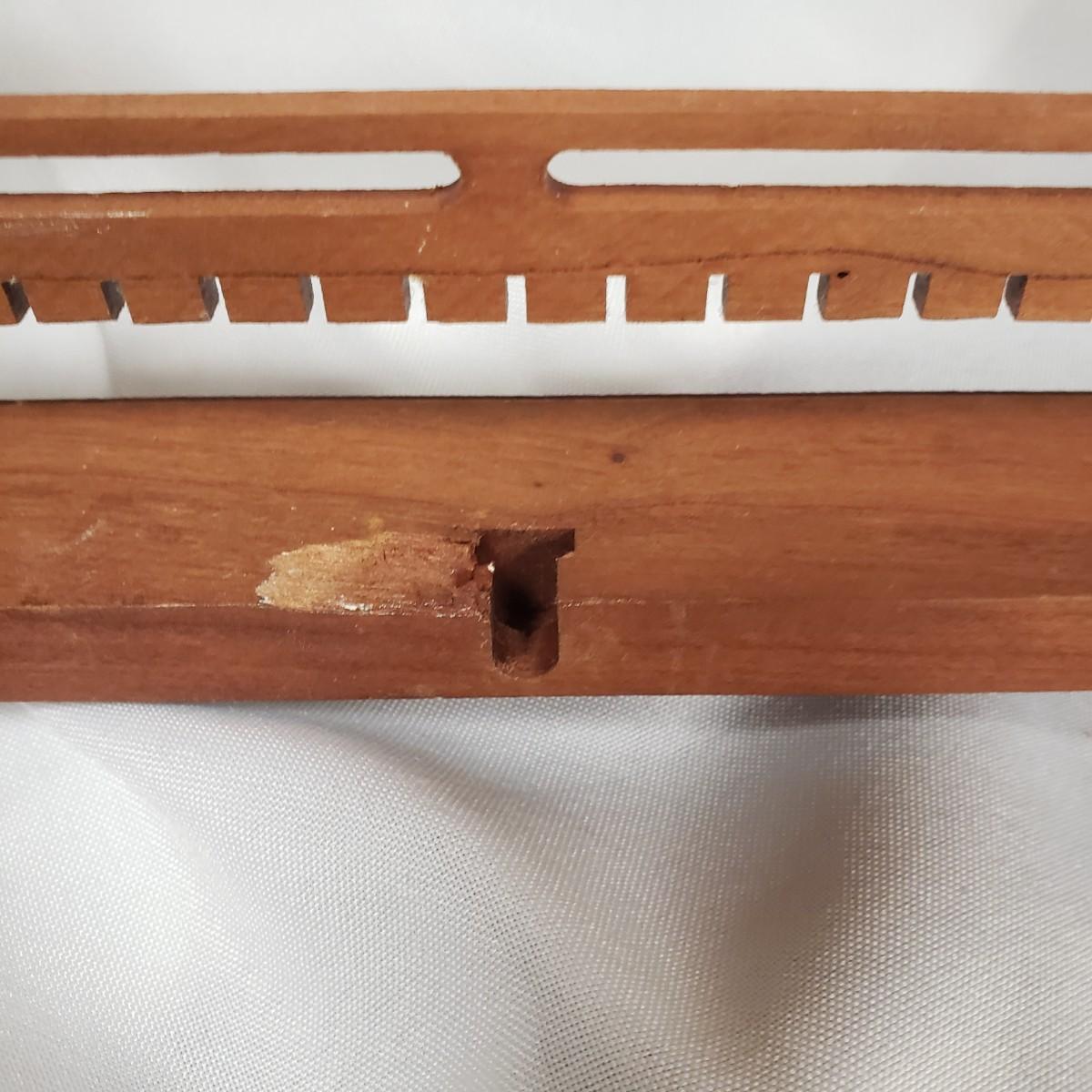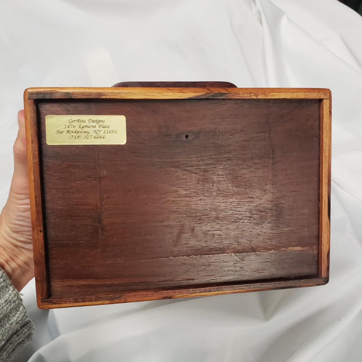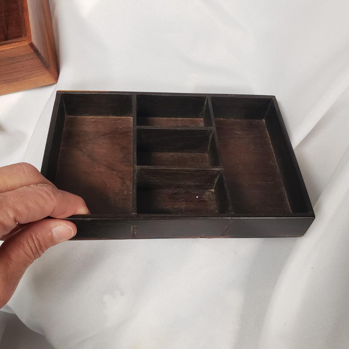 There are two wire racks that can also hang. The silk like material bag with oriental design can roll up for when you travel. The wooden earring rack measures 13" x 1" x 17"H. Finally, is a wooden jewelry box with a removable tray.