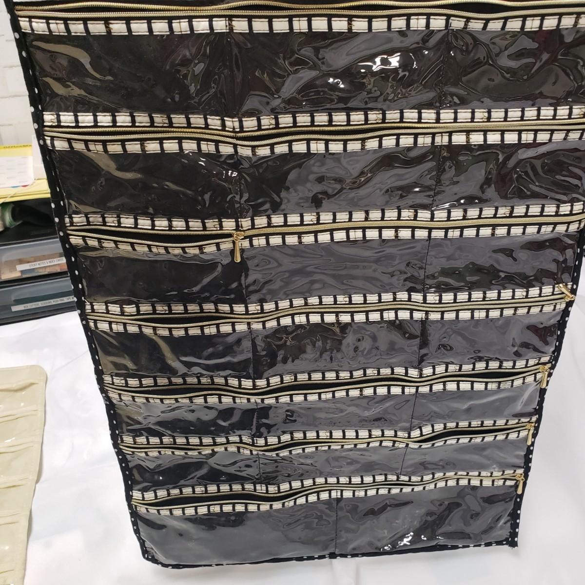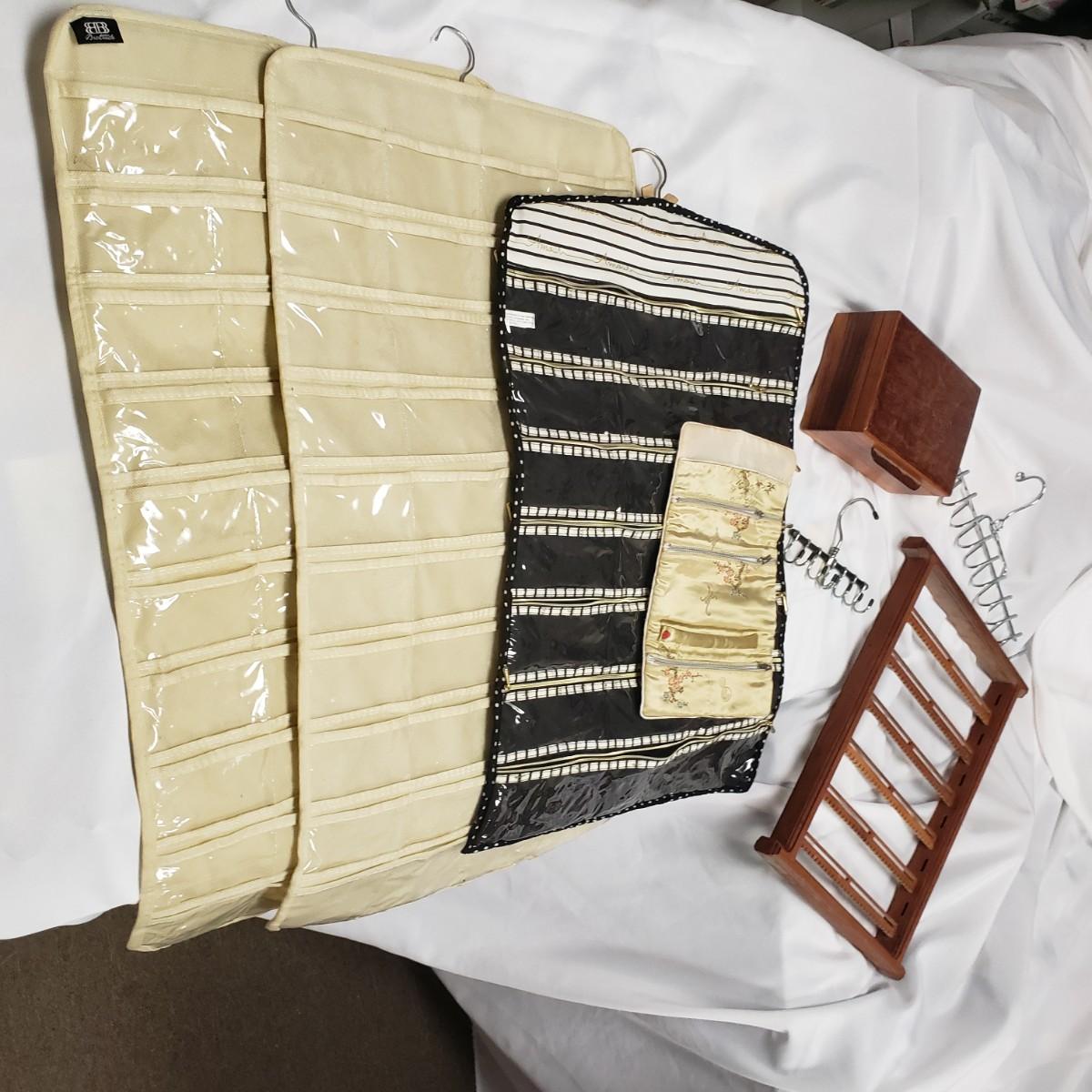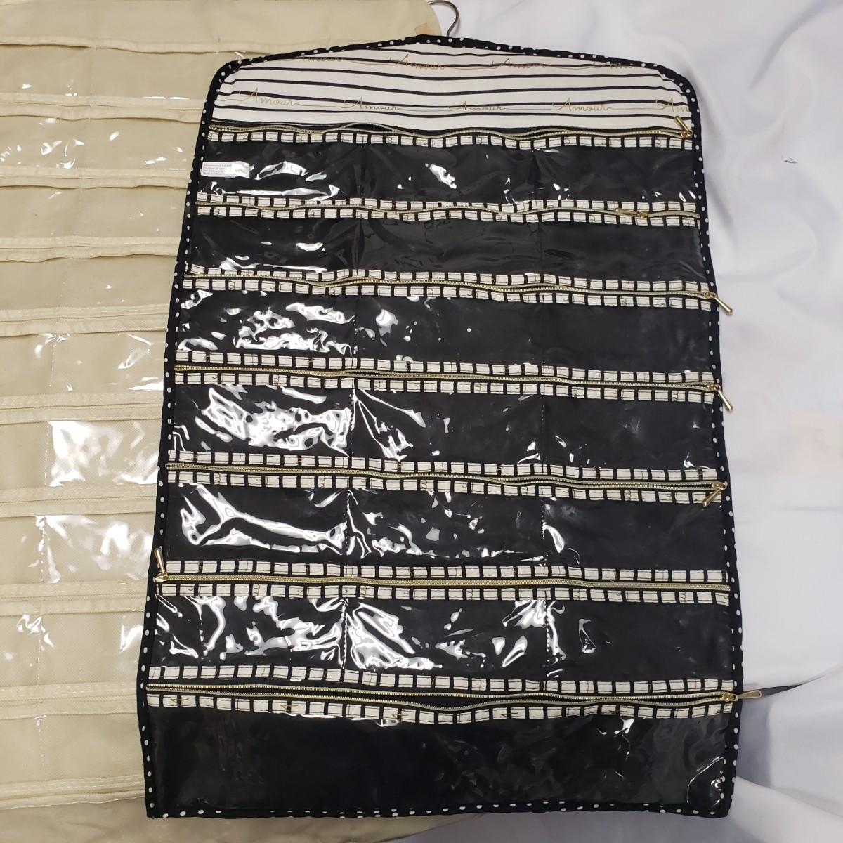 Get your jewelry organized! This lot contains three hanging jewelry bags with compartments on both sides! The two matching tan ones measure 17" x 31"H and have 80 pockets each!
