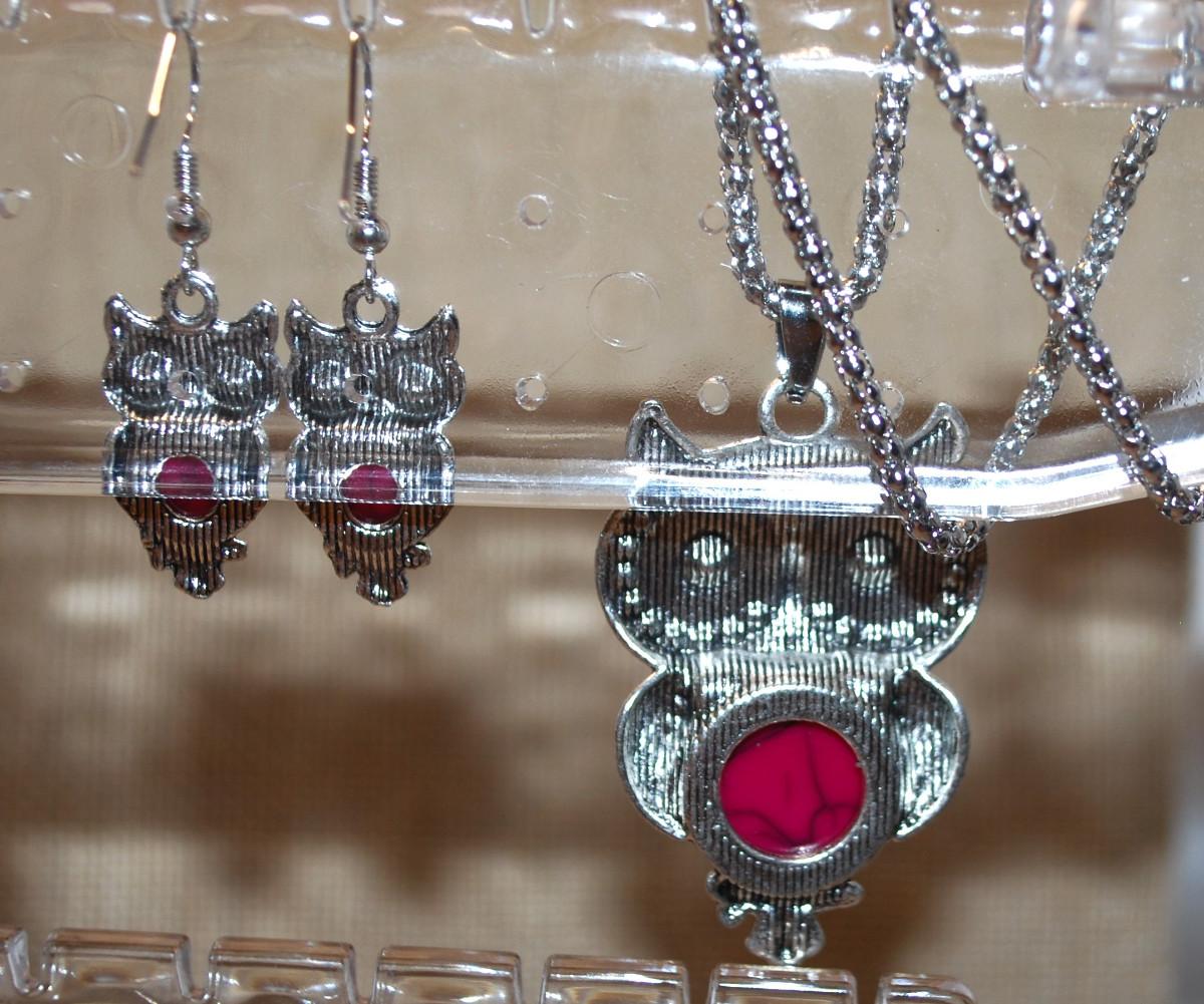 JEWELRY SET Includes Red Belly Owl Earrings (¾" x ½") with Wire Hook & PENDANT (2" x 1") on a Silver Tone Necklace Chain 28" L