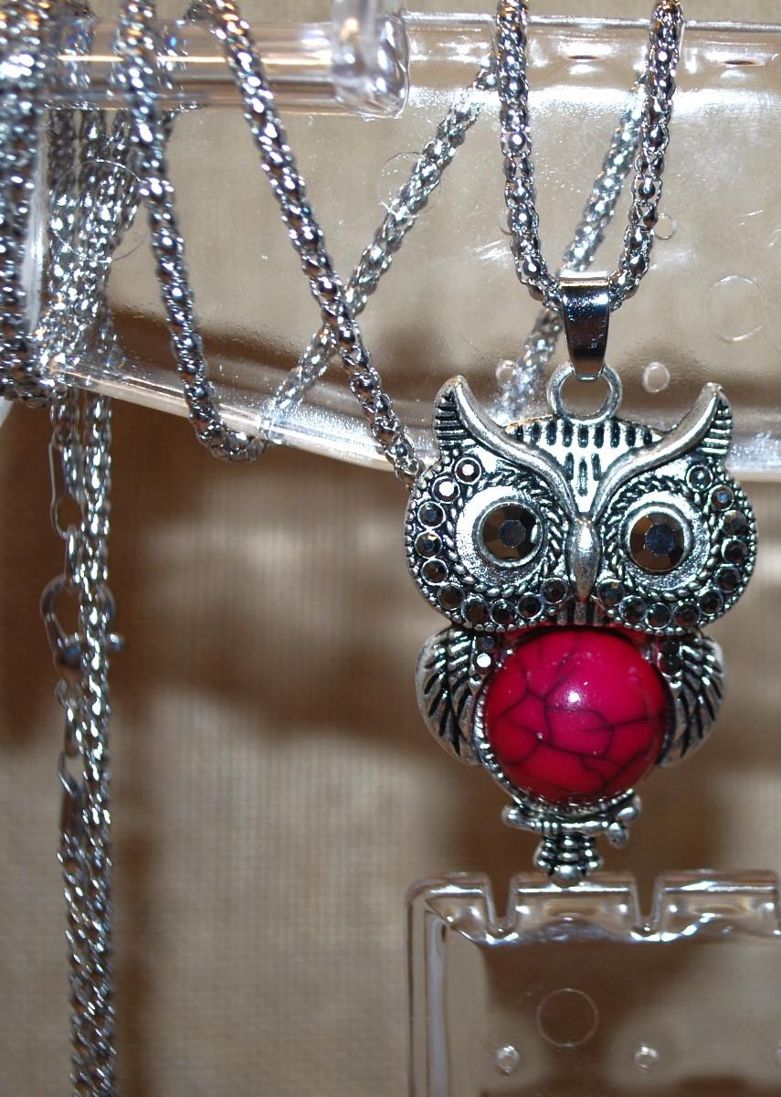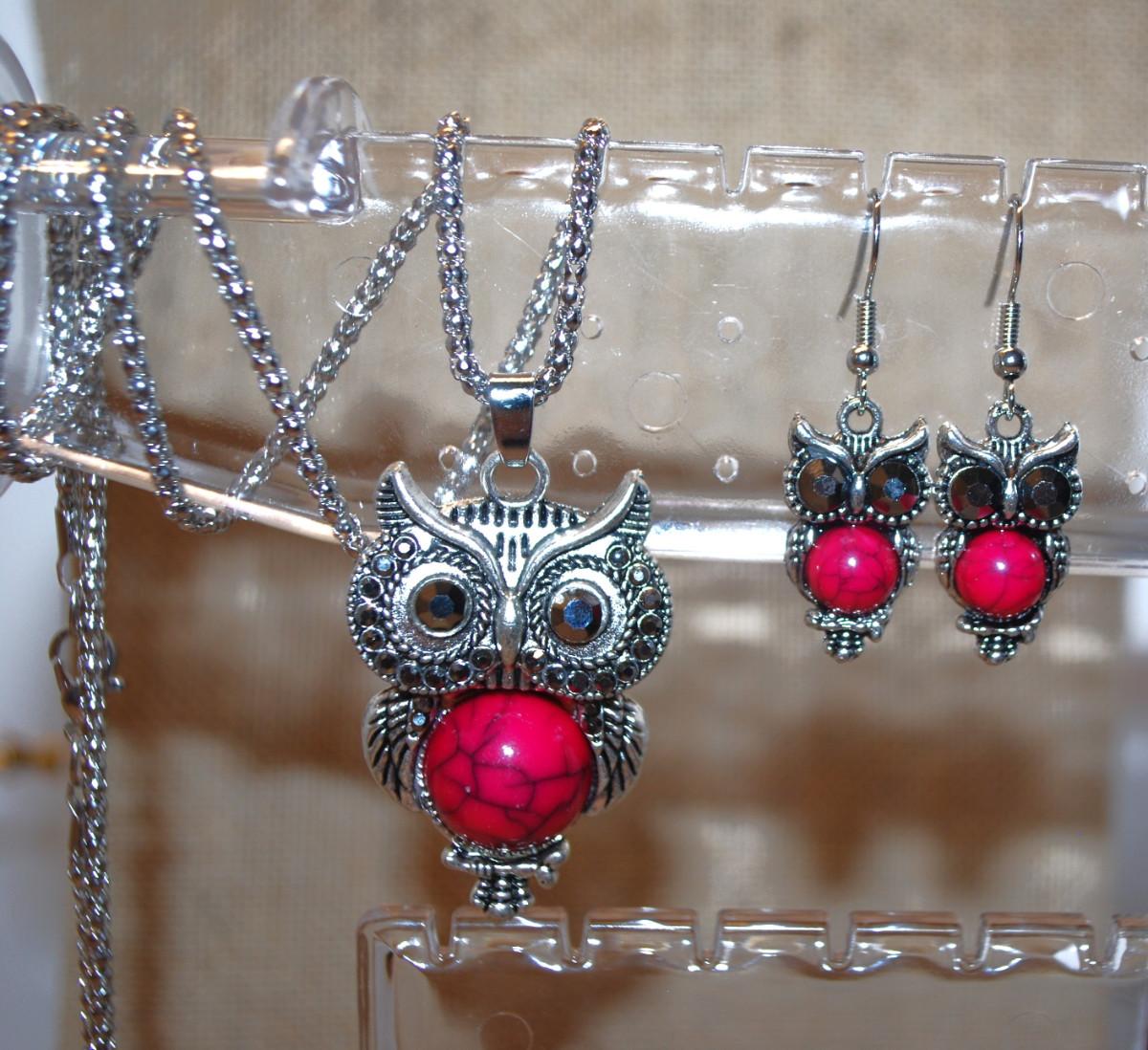 JEWELRY SET Includes Red Belly Owl Earrings (¾" x ½") with Wire Hook & PENDANT (2" x 1") on a Silver Tone Necklace Chain 28" L