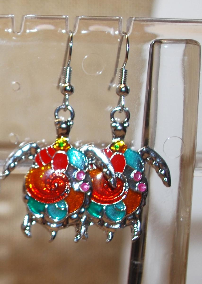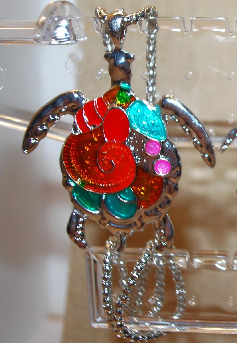 JEWELRY SET Includes Very Colorful TURTLE Earrings (1¼" x 1") with Wire Hook Clasp & PENDANT (2¾" x 2¼") on a Silver Tone Necklace Chain 18" L