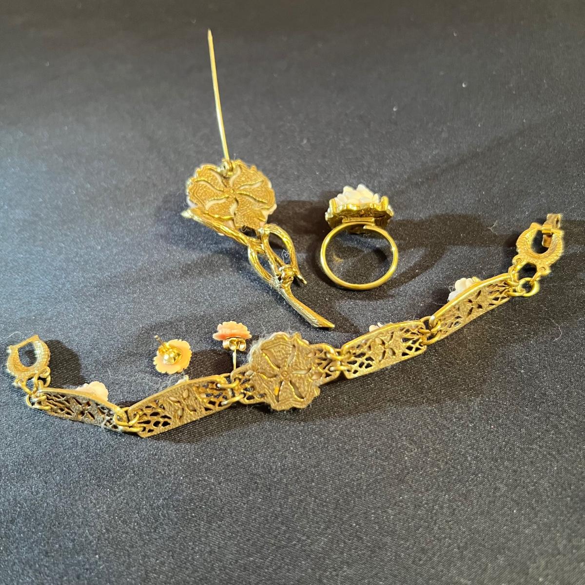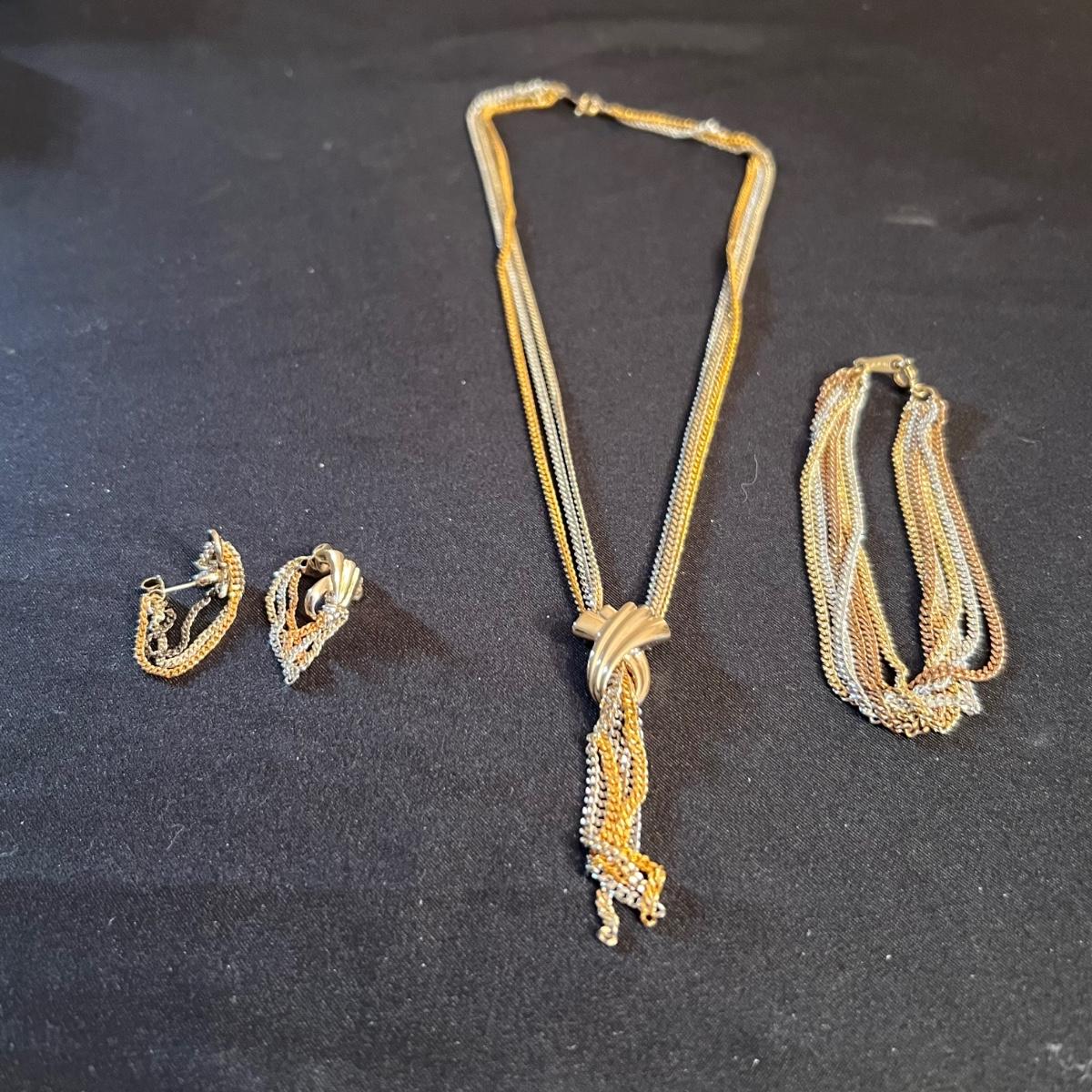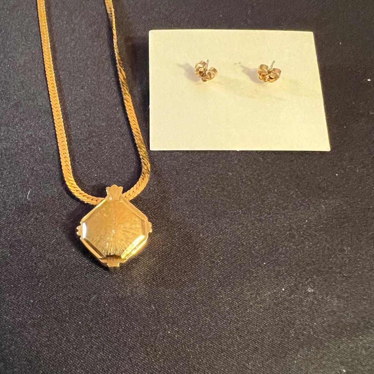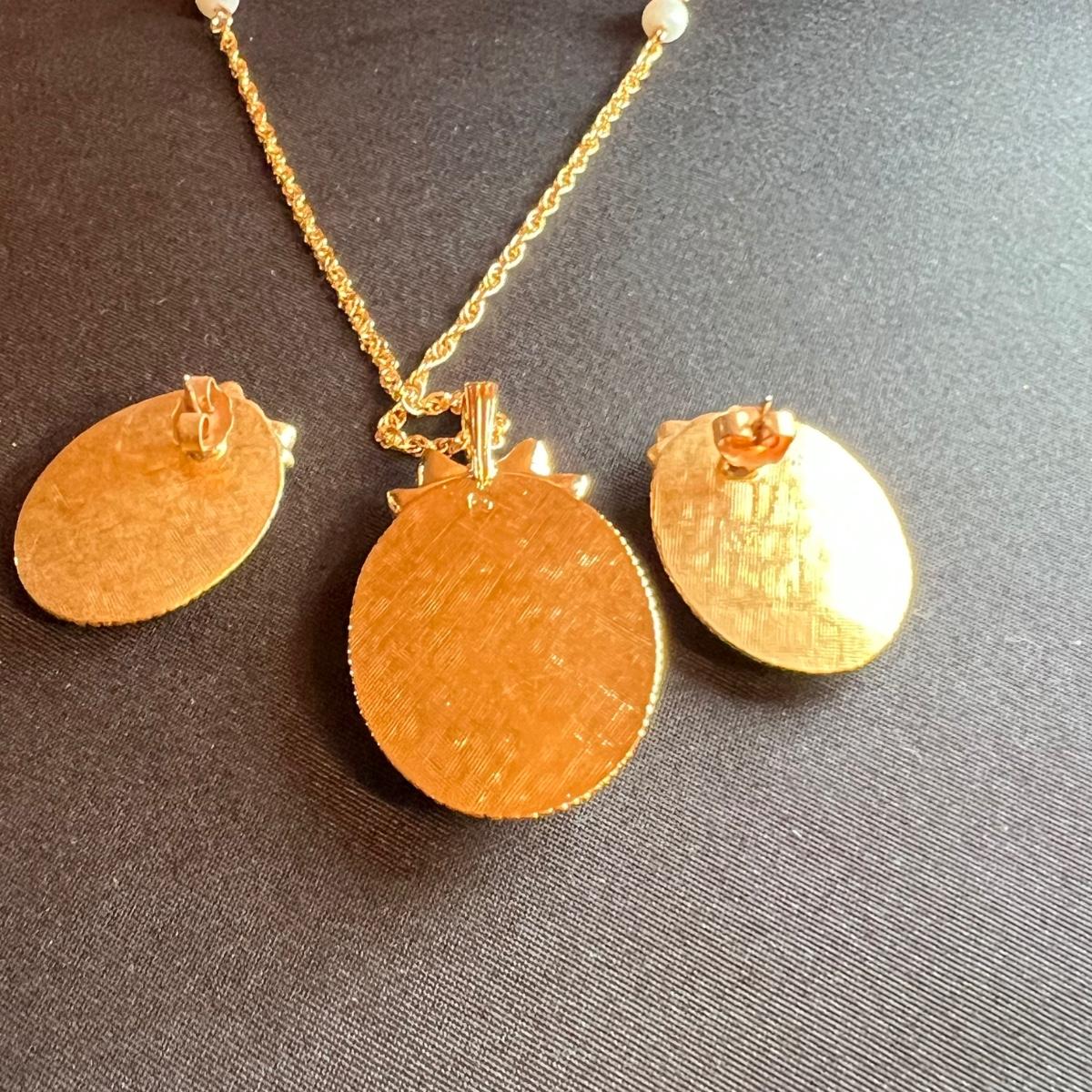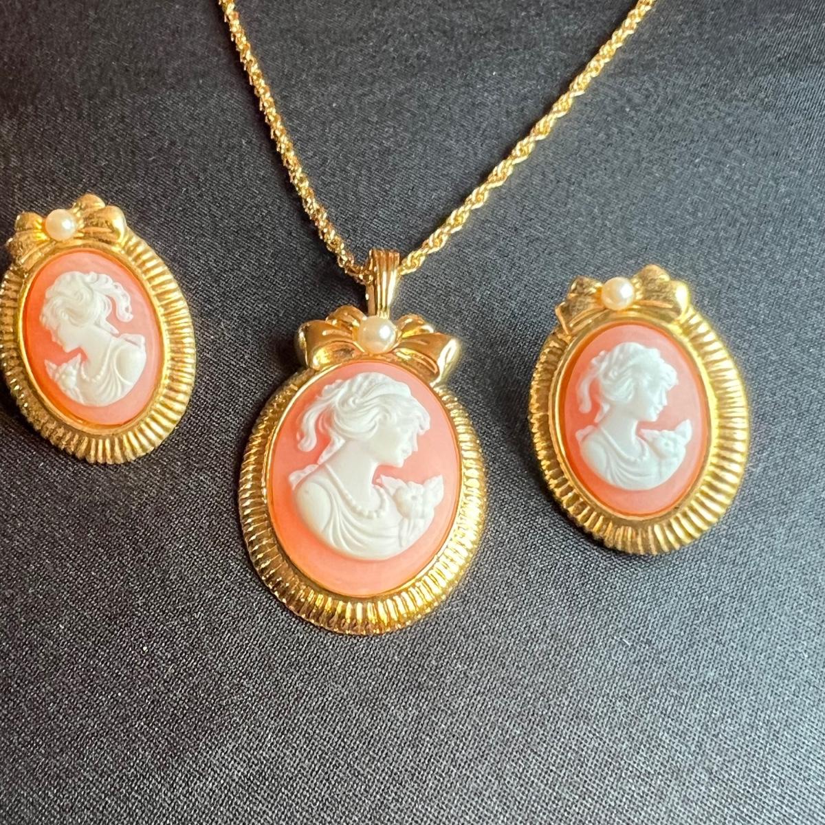 These 11 jewelry sets come with earrings that are a mix of clip-on and backs for pierced ears. Mostly the sets contain a necklace with matching earrings, but a few sets have an accompanying brooch and the pale pink rose set also has a ring and bracelet (the roses appear to be a resin like material). The cameo style necklace has the longest chain measuring 26”. Pieces are gold or silver colored metal. See images for mfg info; most sets are stamped Avon.