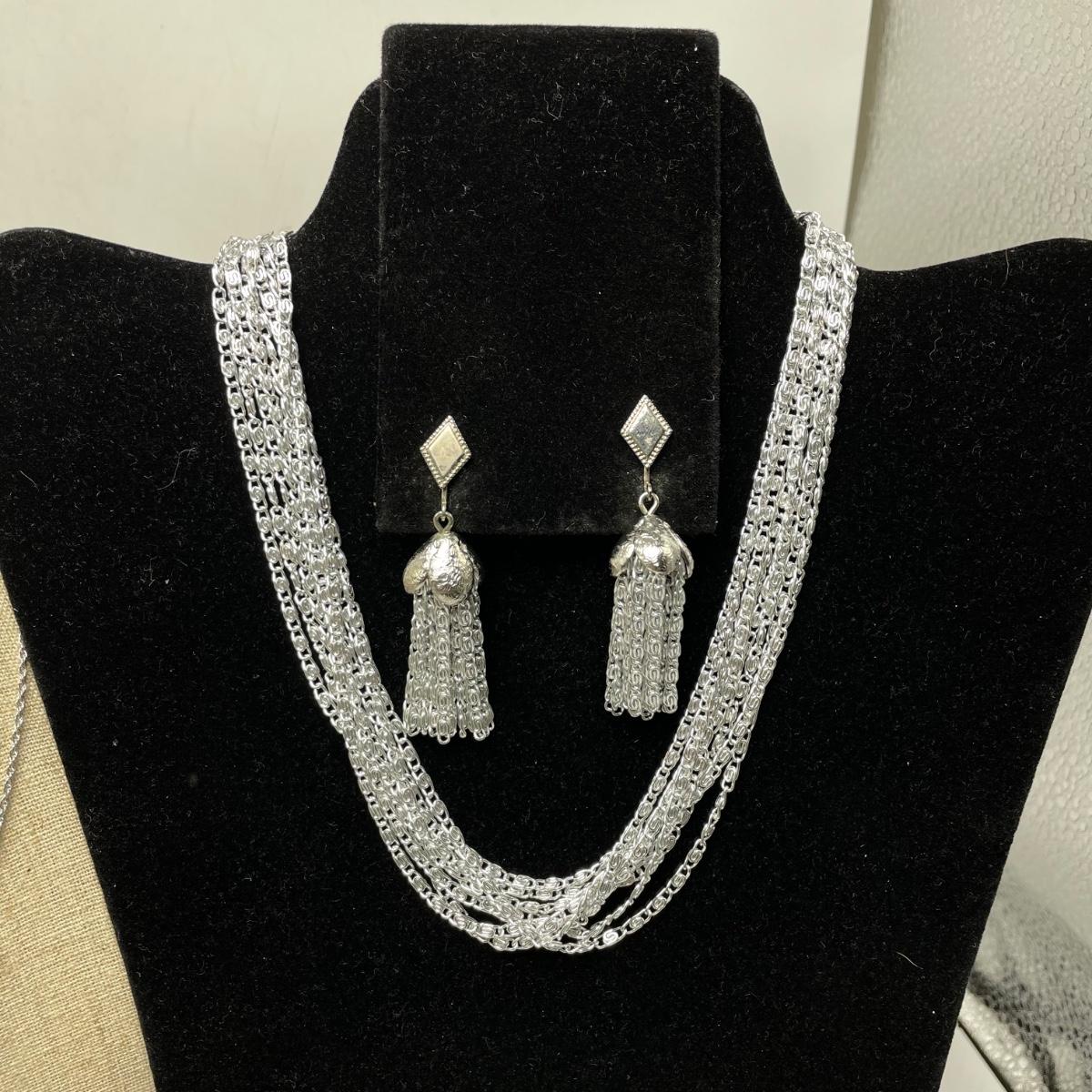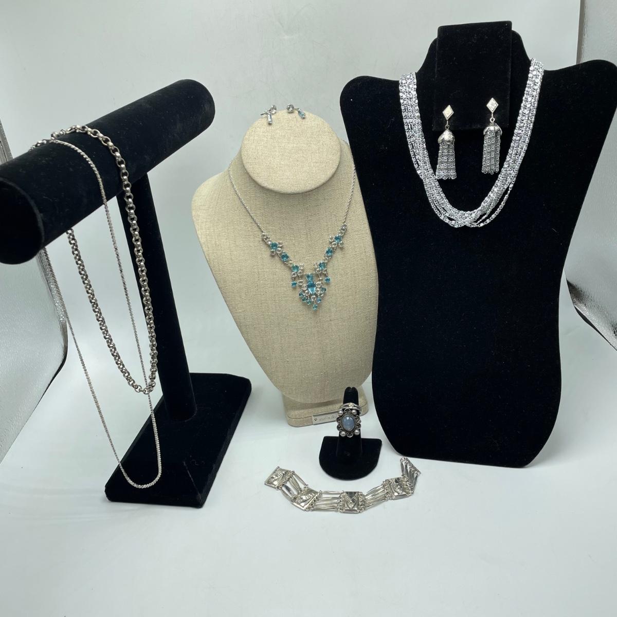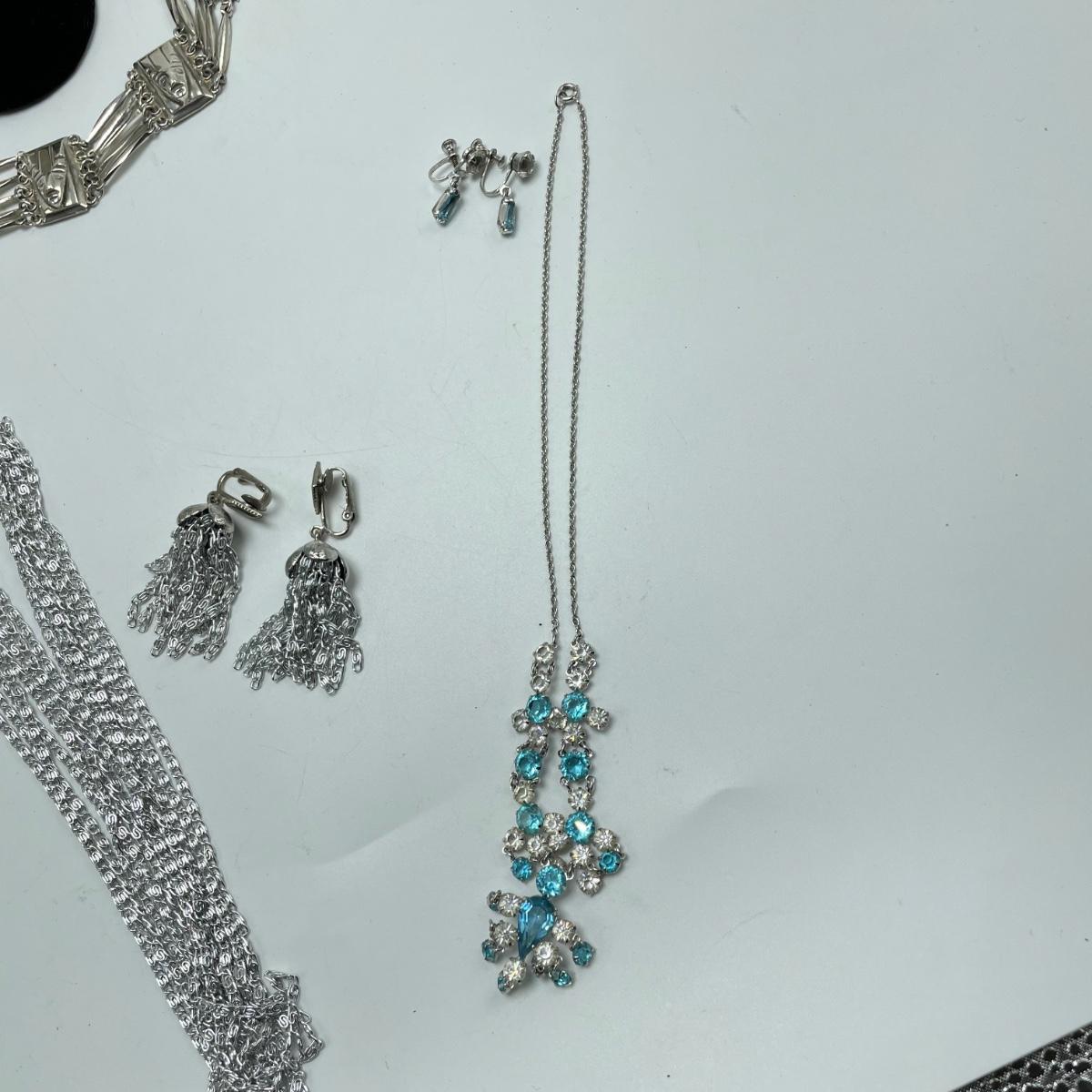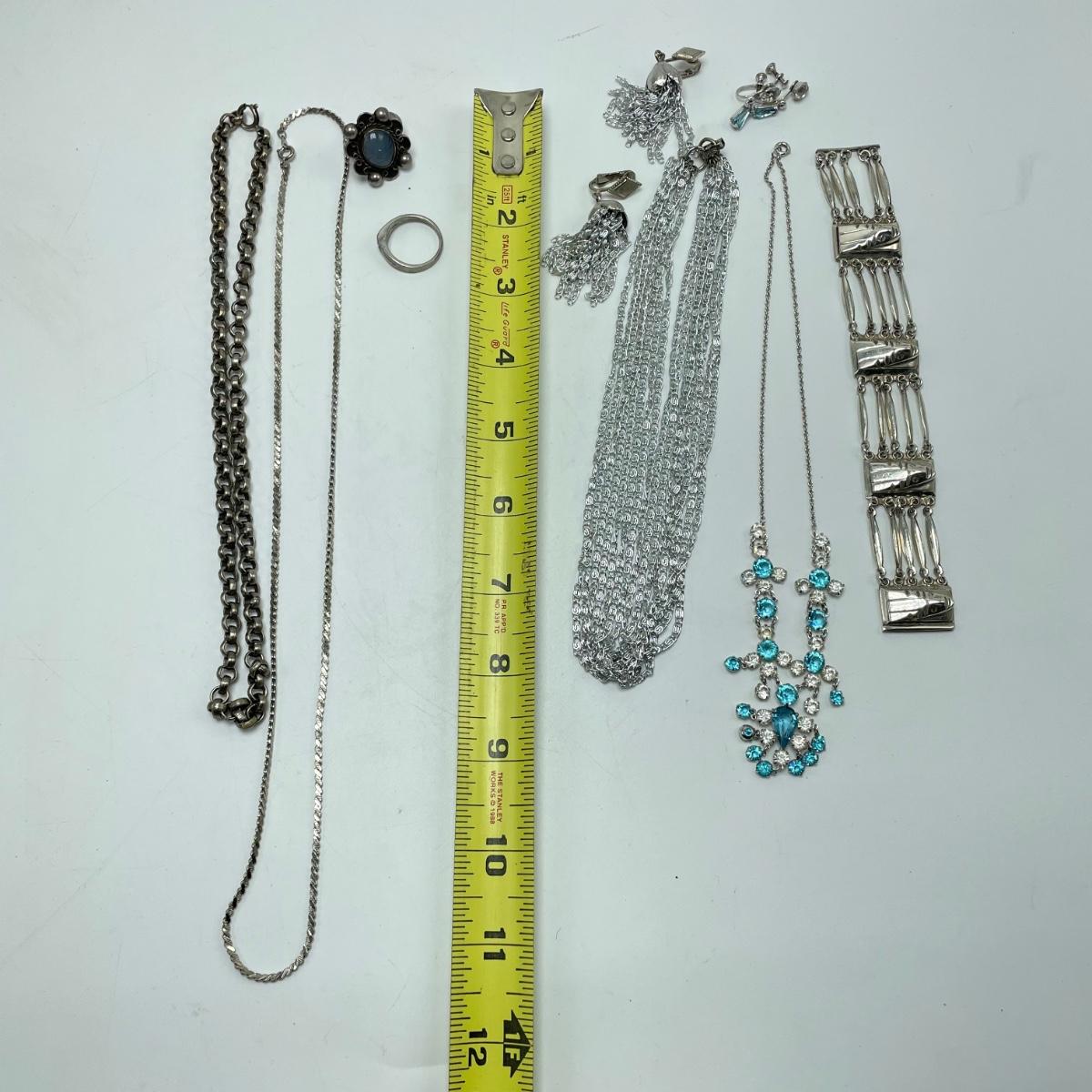 Two necklace and clip earring sets. One ring (with the smaller gem) has the look of sterling, but an indiscernible mark that appears to end in a K. The jewel did not register on our diamond tester. Lot also includes a unique bracelet marked "Made in Mexico", two more unmarked chains and another ring. This ring is a bit misshapen and may be larger than it measures when straightened out. See images. Shipping available.