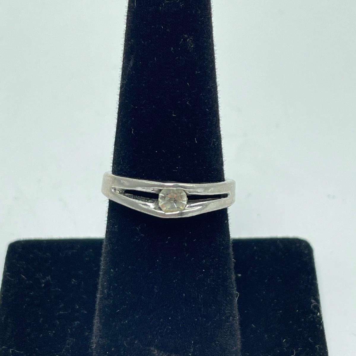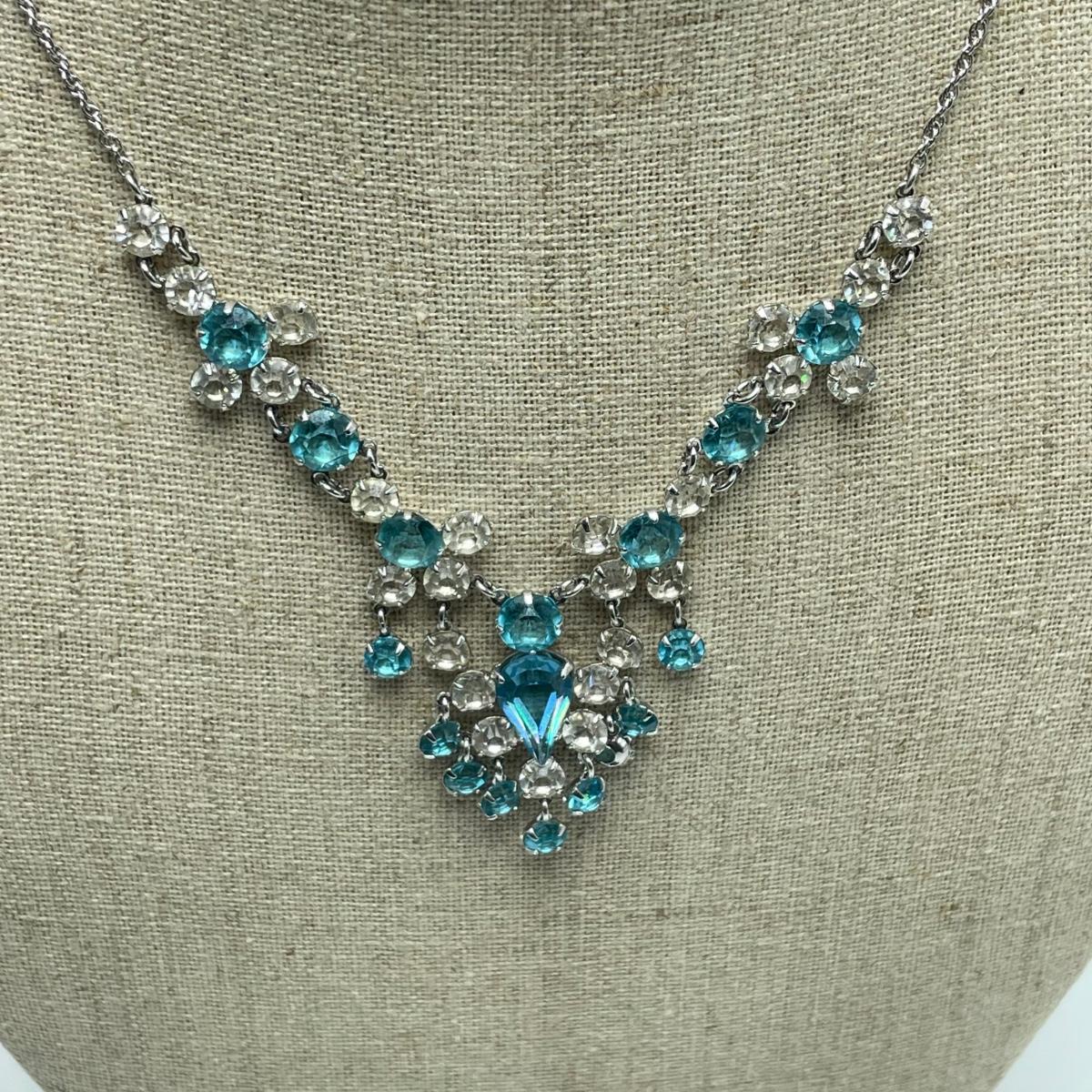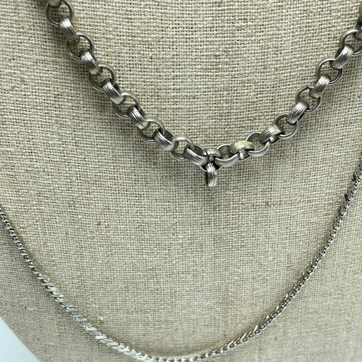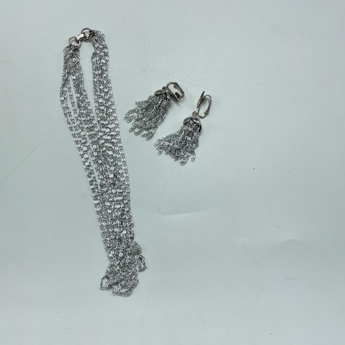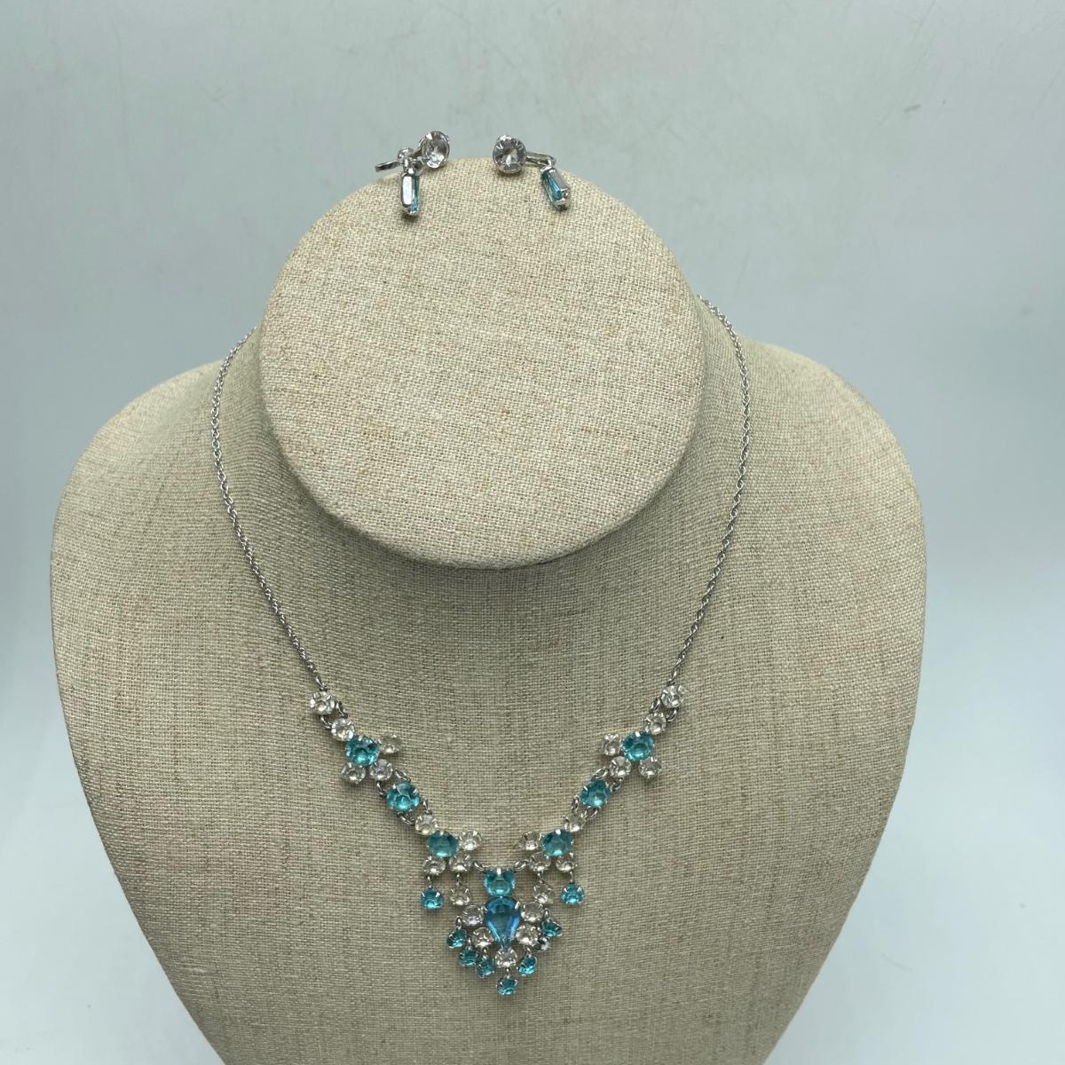 Two necklace and clip earring sets. One ring (with the smaller gem) has the look of sterling, but an indiscernible mark that appears to end in a K. The jewel did not register on our diamond tester. Lot also includes a unique bracelet marked "Made in Mexico", two more unmarked chains and another ring. This ring is a bit misshapen and may be larger than it measures when straightened out. See images. Shipping available.