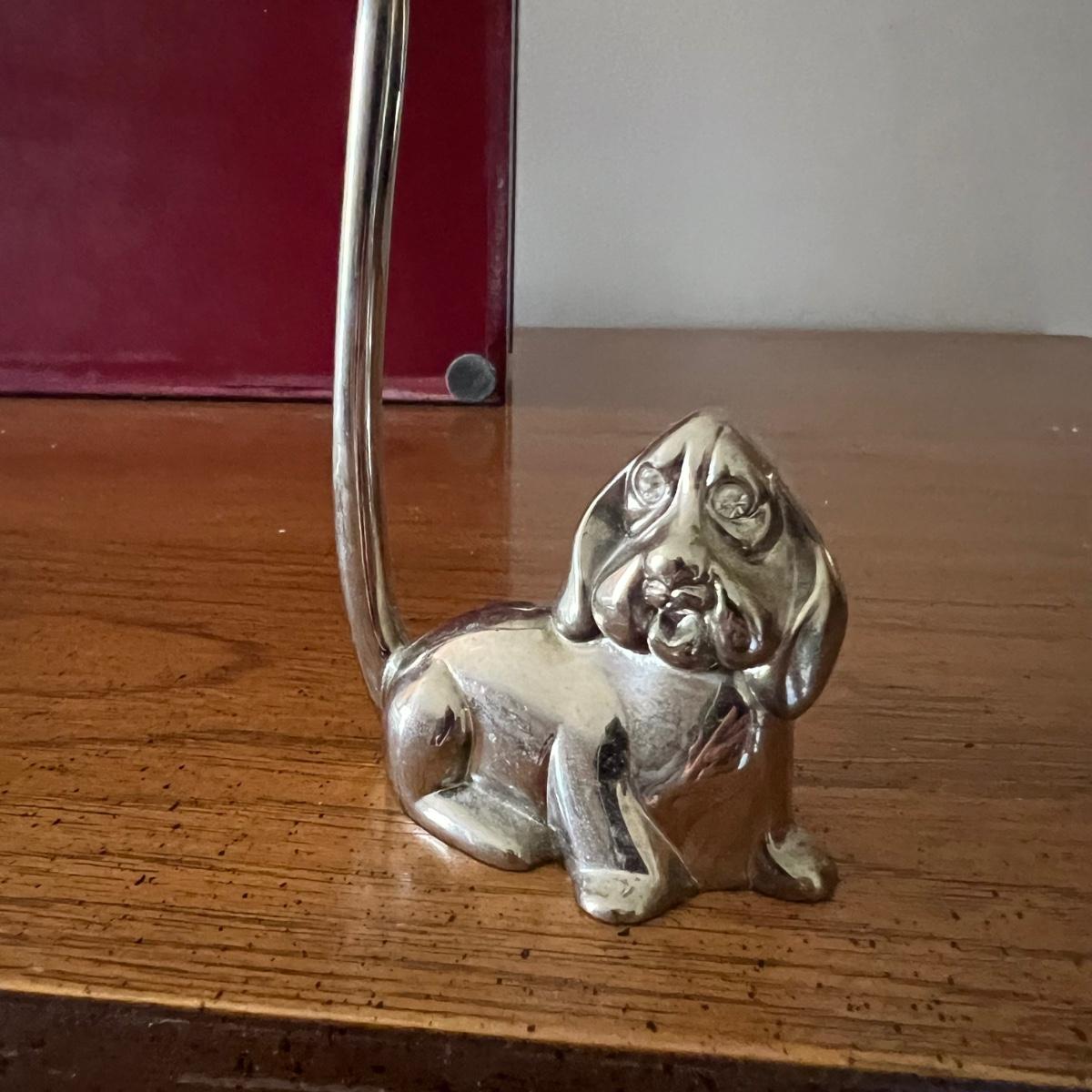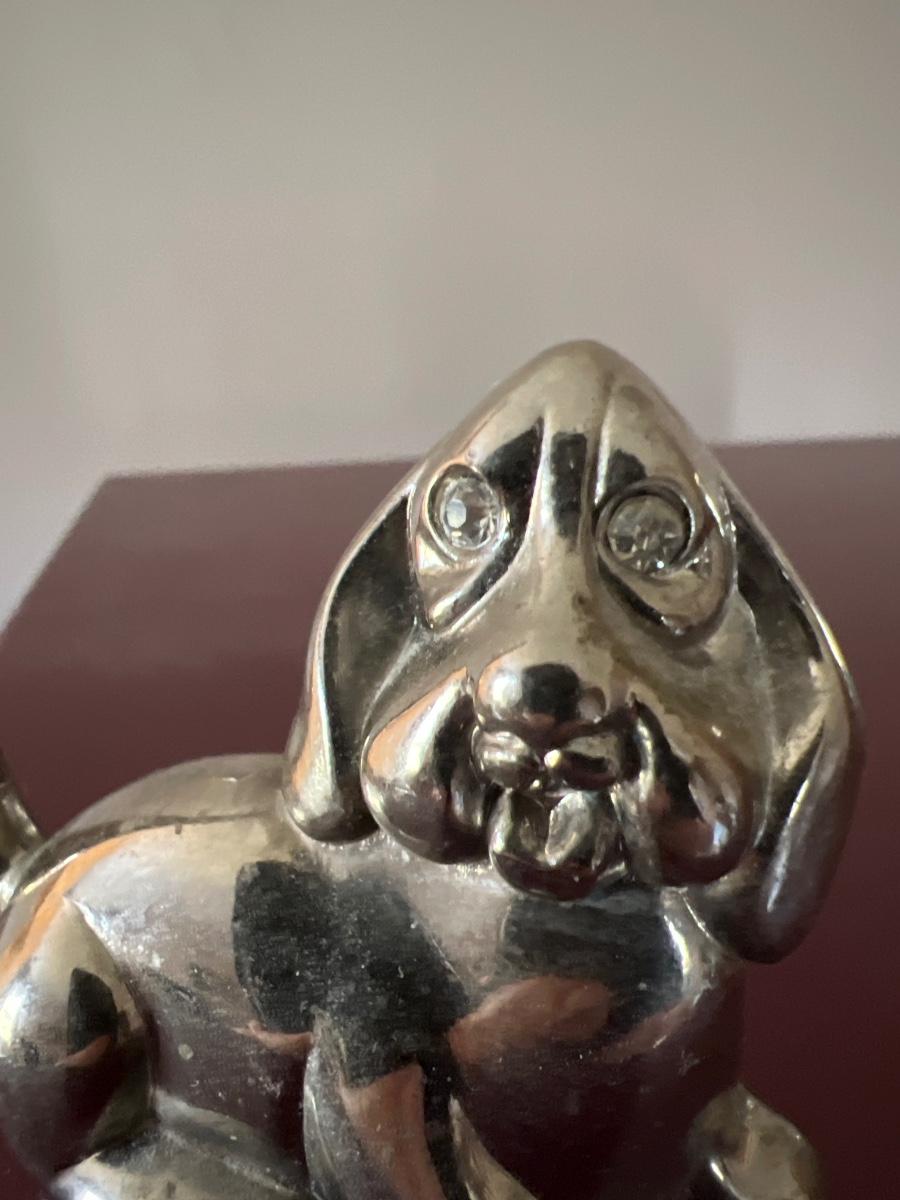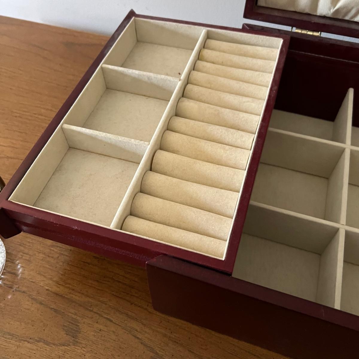 This jewelry boxes offers plenty of storage solutions. It measures 14” x 11” x 5”.H. The felt lining is dusty and slightly dirty. Lot also includes a small glass tray, glass ring holder and a metal dog with faux diamond eyes that is a ring holder.