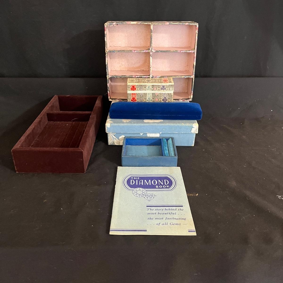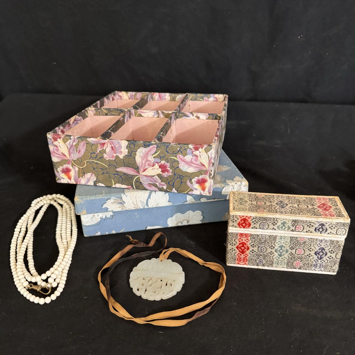Lot includes two jewelry trays with ring storage, jewelry box and three decorative cardboard boxes. It also includes five necklaces, with one possibly being jade stone. Largest jewelry tray measures 12” x 5” x 2”H. Shipping available.