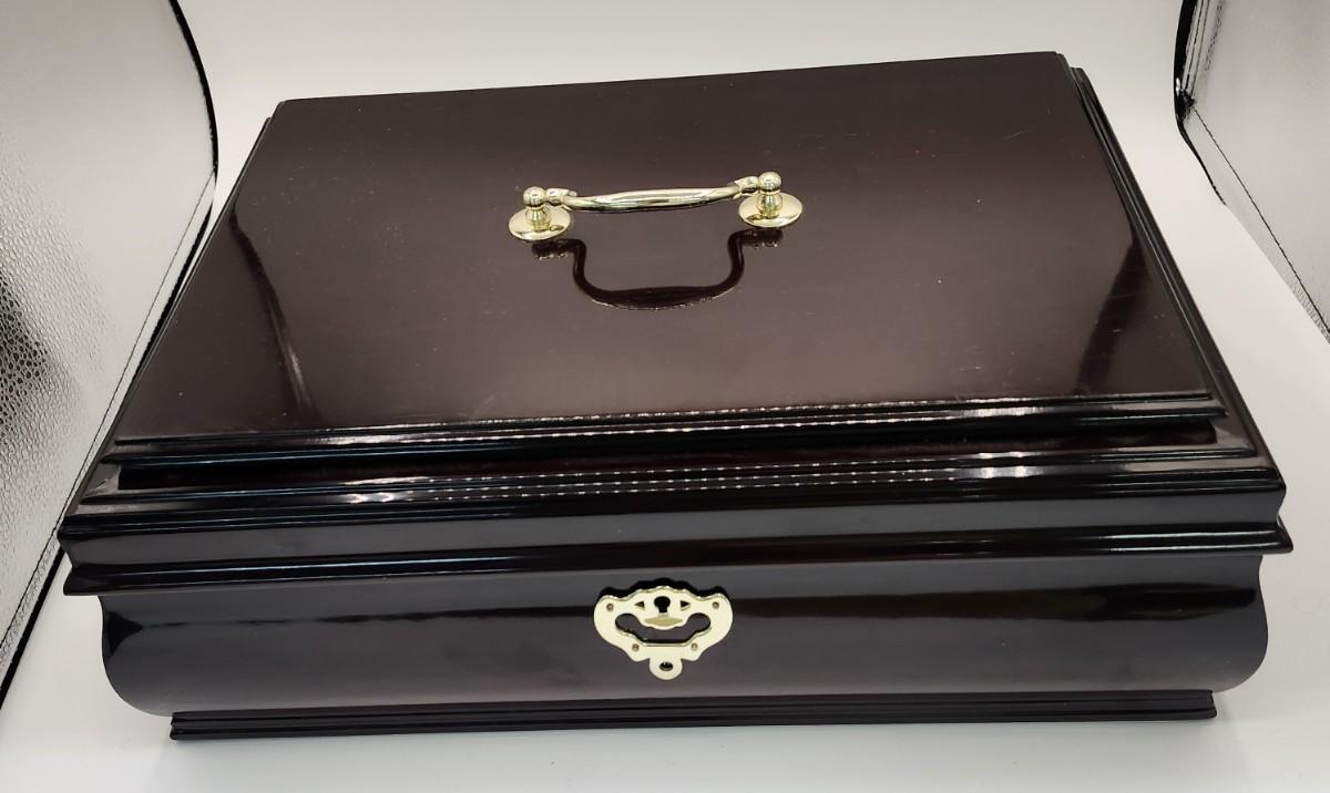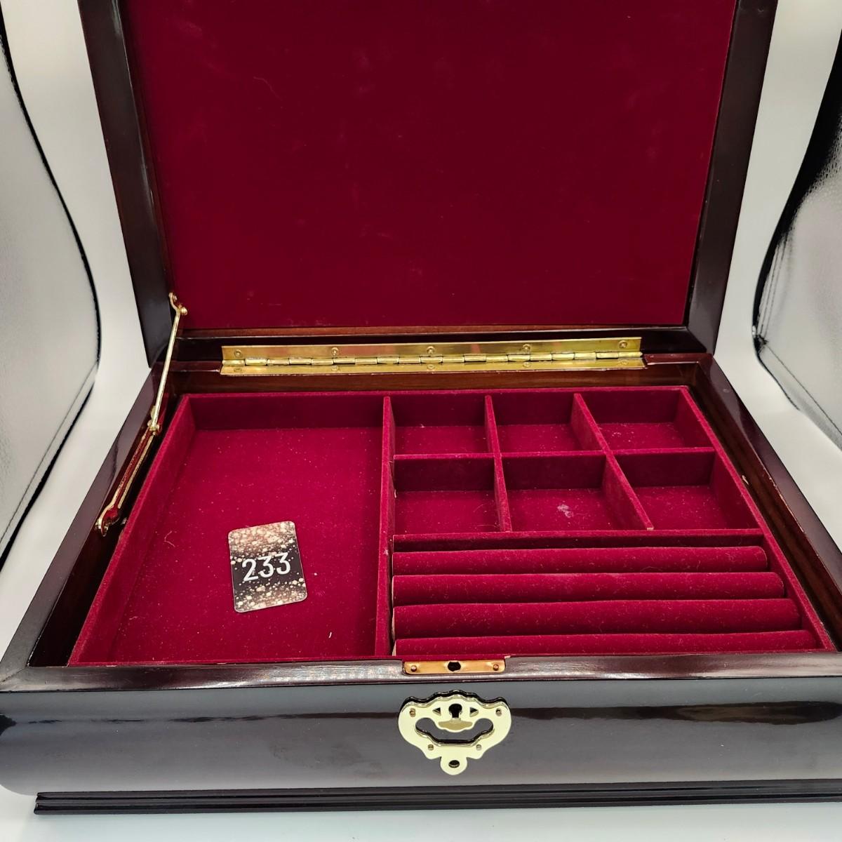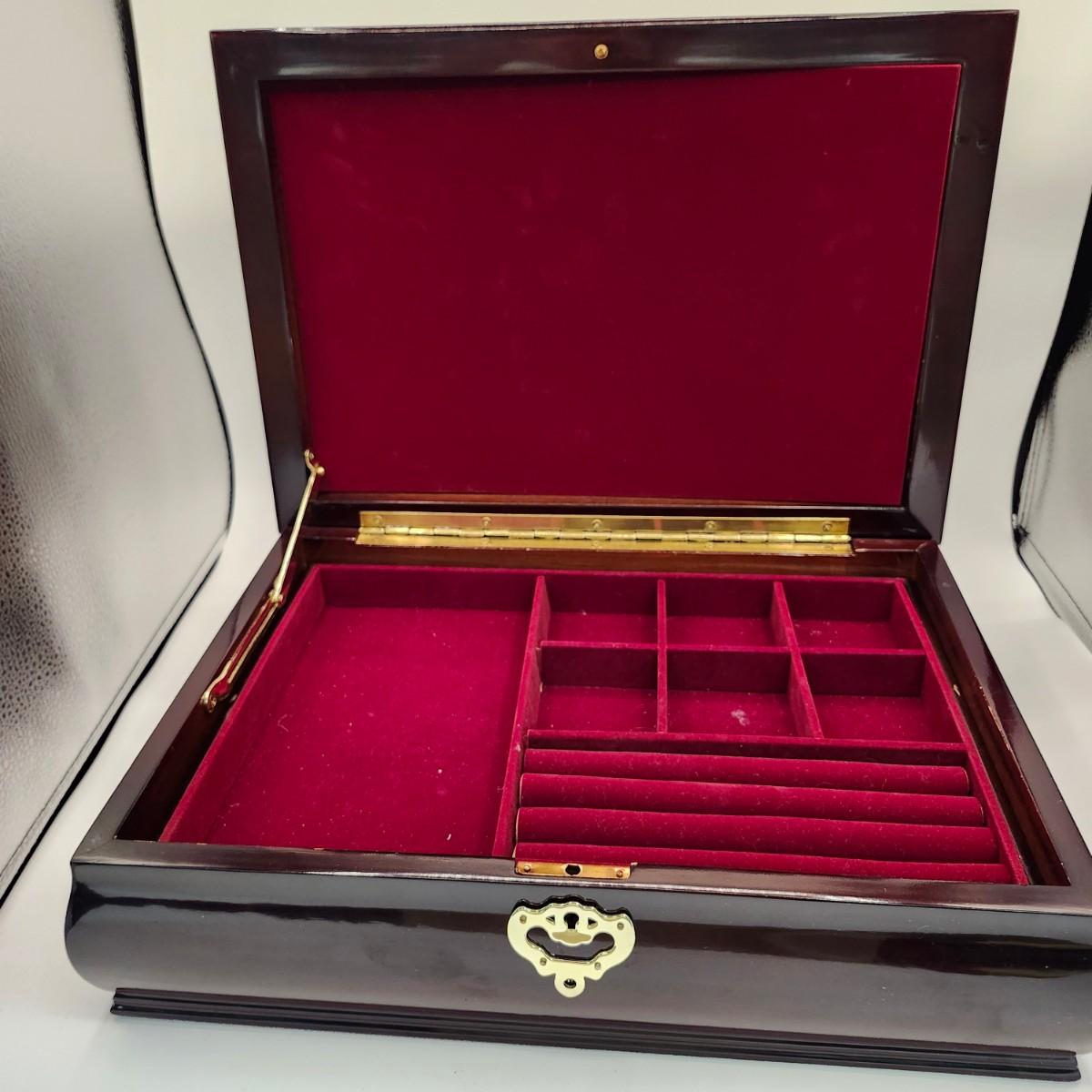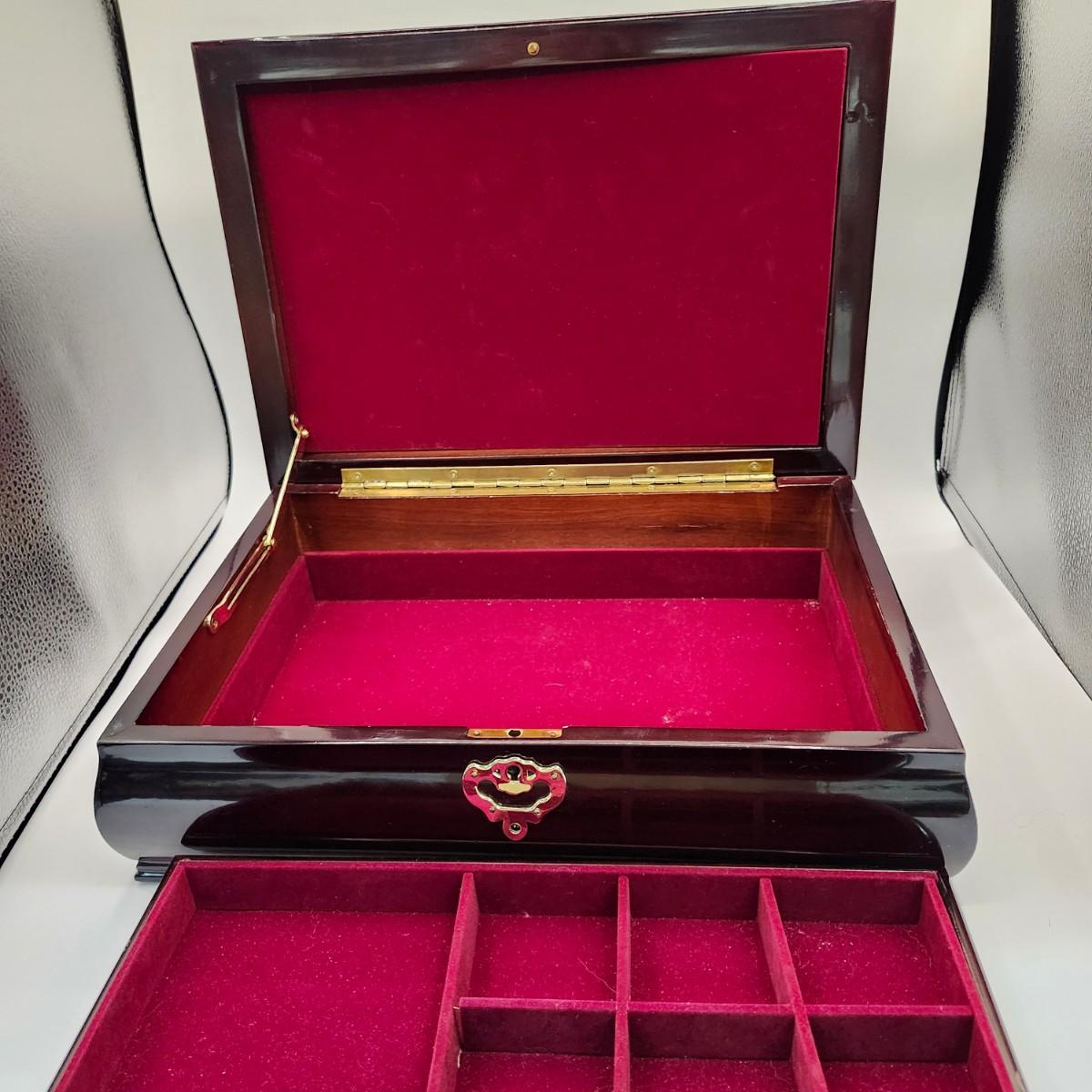 Lovely velvet lined jewel case, with two compartments. One divider will need to be secured in the top tray, it isloose.