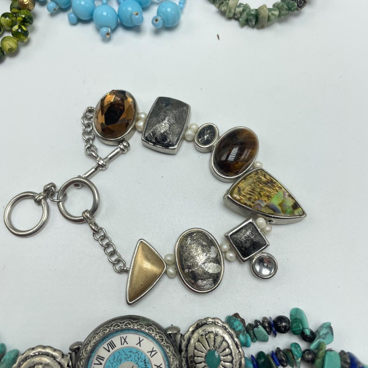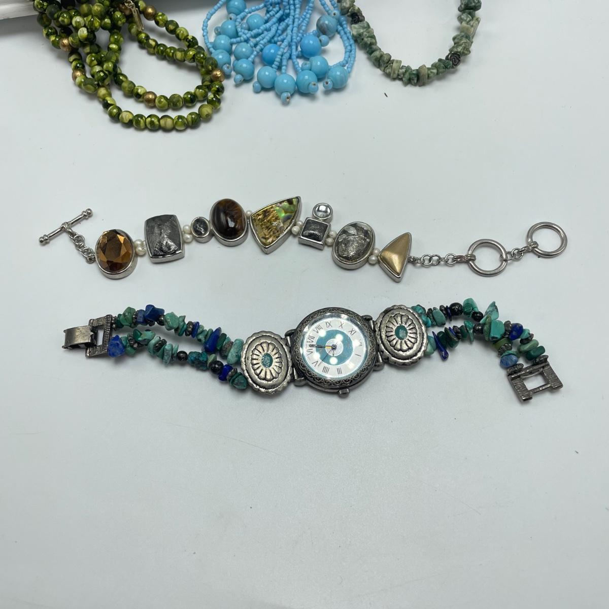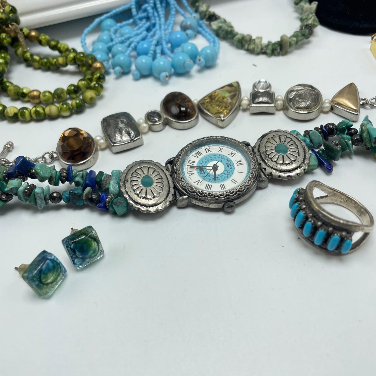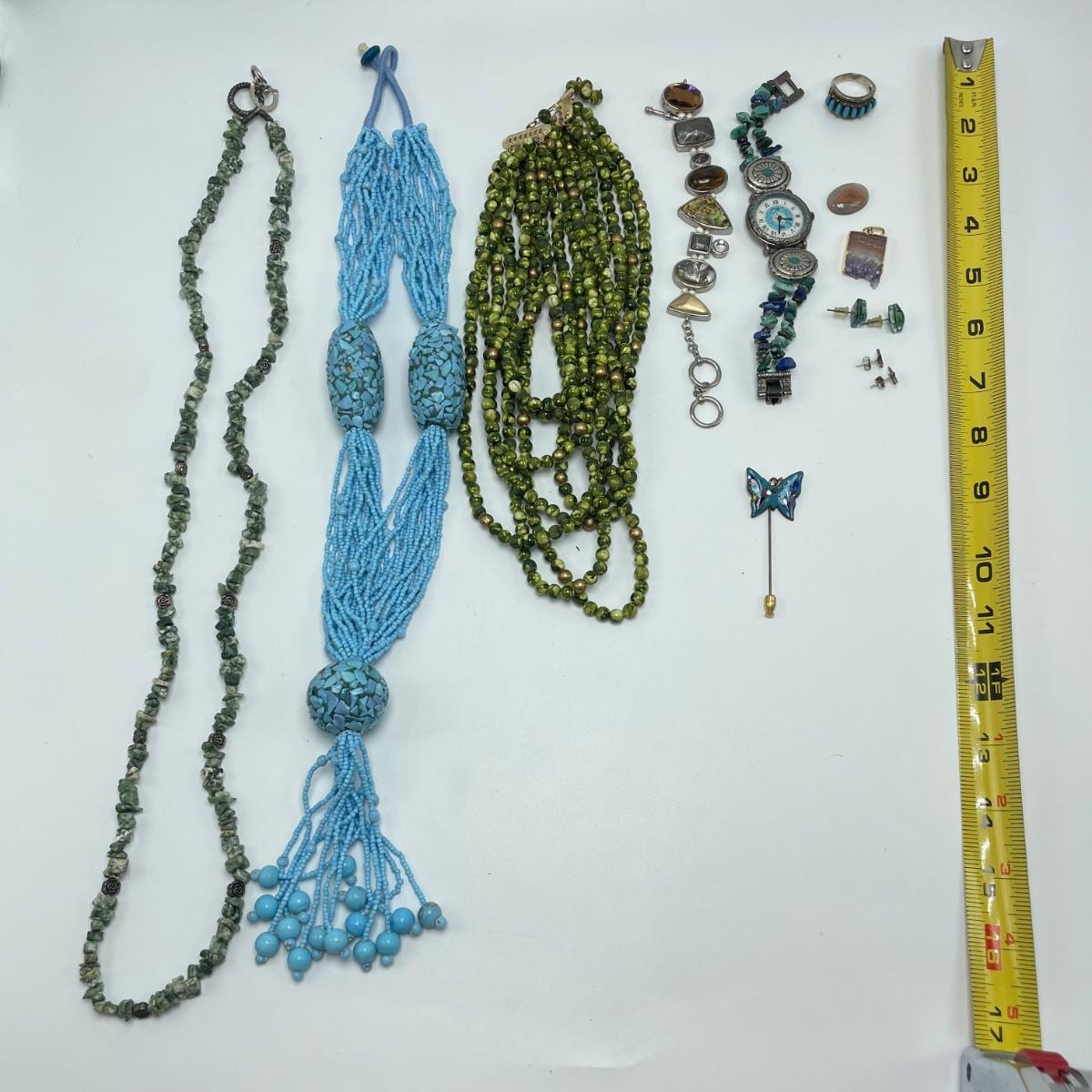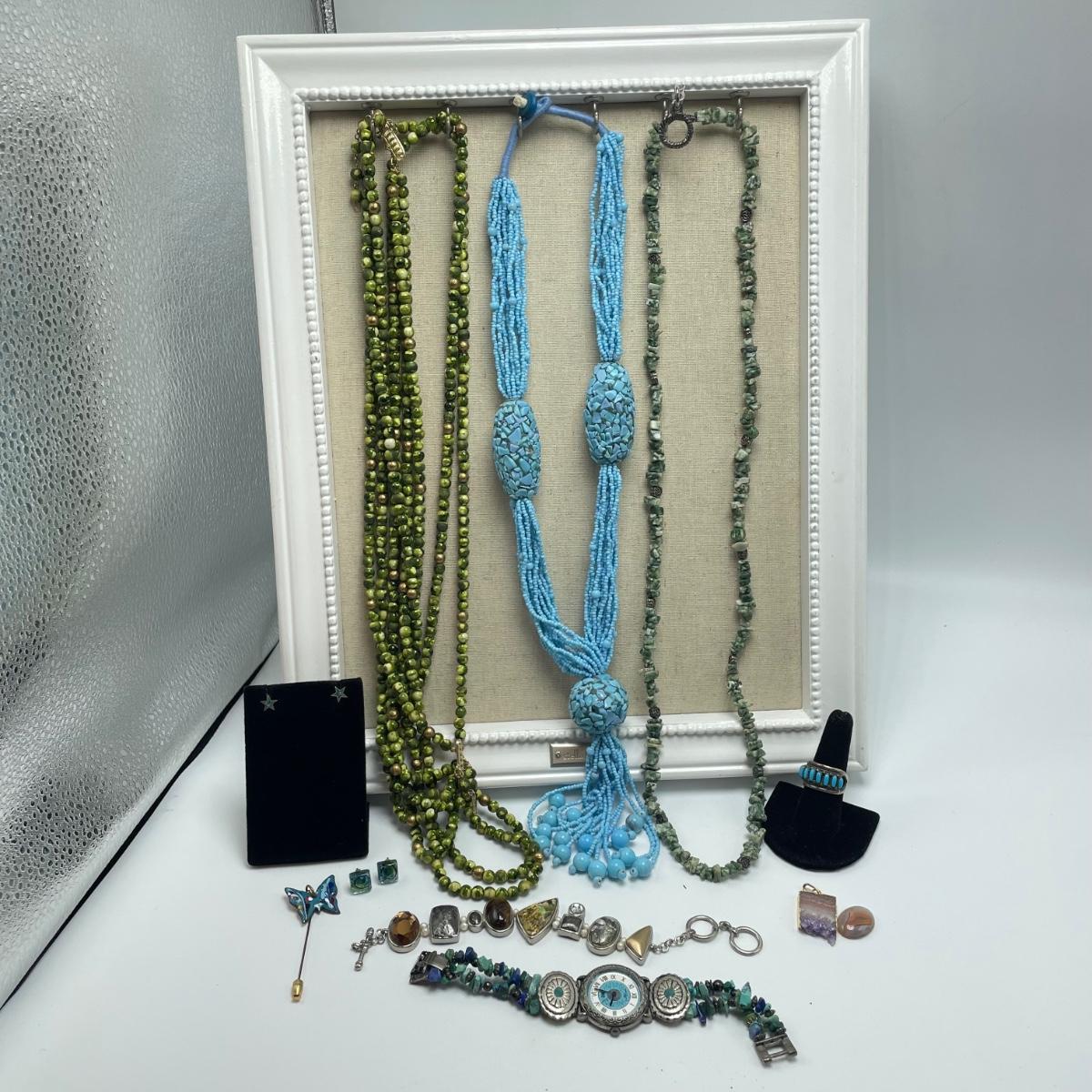 Nice selection of mostly green and blue toned jewelry. The long green and blue necklaces both appear to have real stones, while the shorter green necklace appears to be man-made. Lot features more turquoise like jewelry including a watch by LA Express and a ring with an unclear marking. Lot also includes a beautiful loose stone, a geode pendant, two pairs of earrings for pierced ears, an enamel-like butterfly hat pin and a stone adorned bracelet. See images. All sales are final. No returns or refunds. Please bid accordingly. Shipping available.