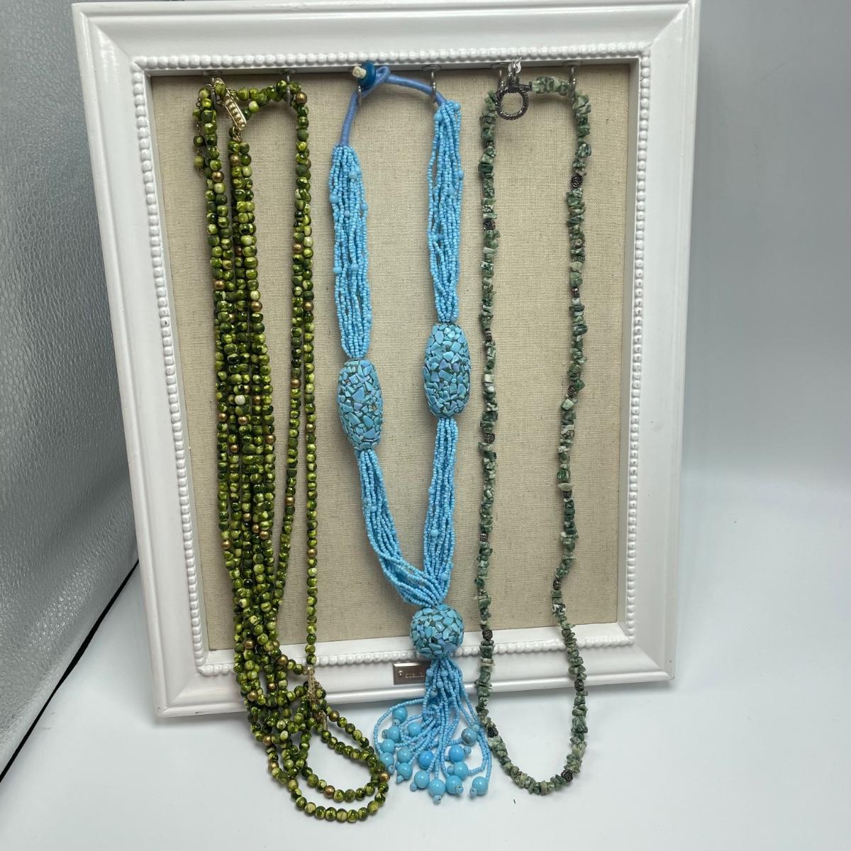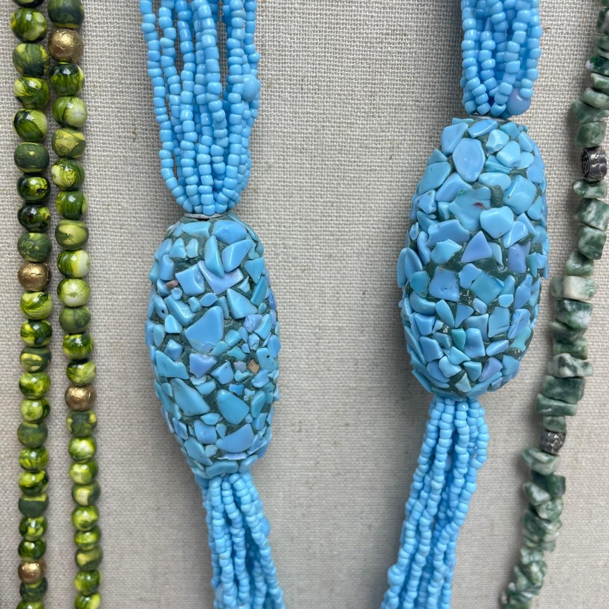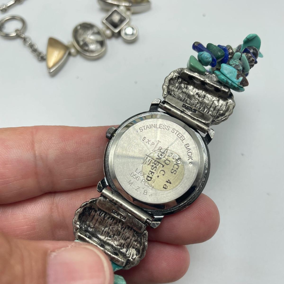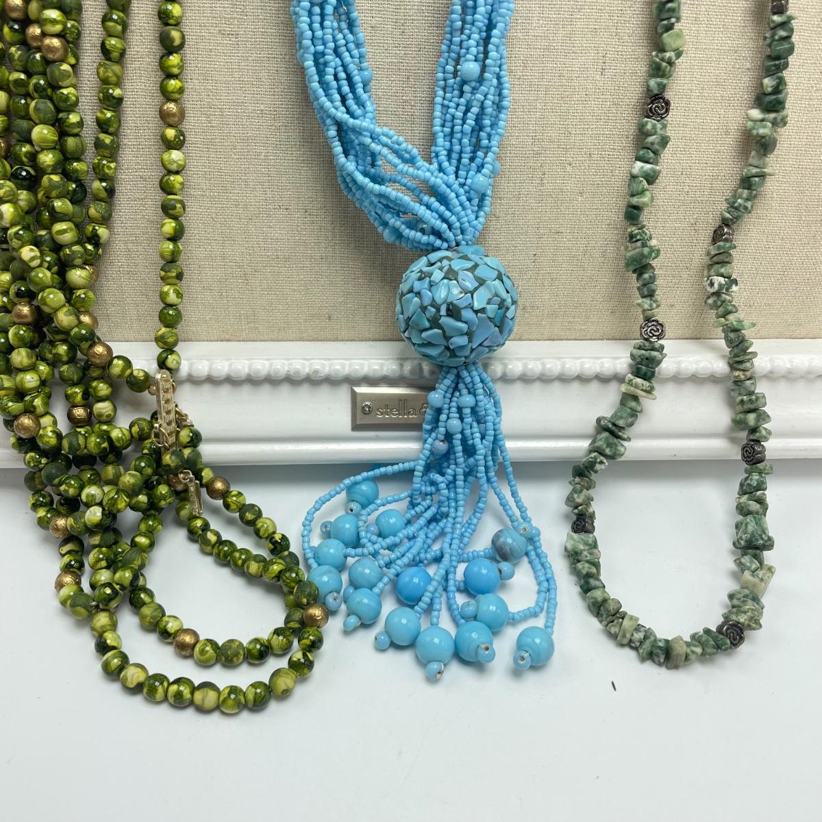 Nice selection of mostly green and blue toned jewelry. The long green and blue necklaces both appear to have real stones, while the shorter green necklace appears to be man-made. Lot features more turquoise like jewelry including a watch by LA Express and a ring with an unclear marking. Lot also includes a beautiful loose stone, a geode pendant, two pairs of earrings for pierced ears, an enamel-like butterfly hat pin and a stone adorned bracelet. See images. All sales are final. No returns or refunds. Please bid accordingly. Shipping available.
