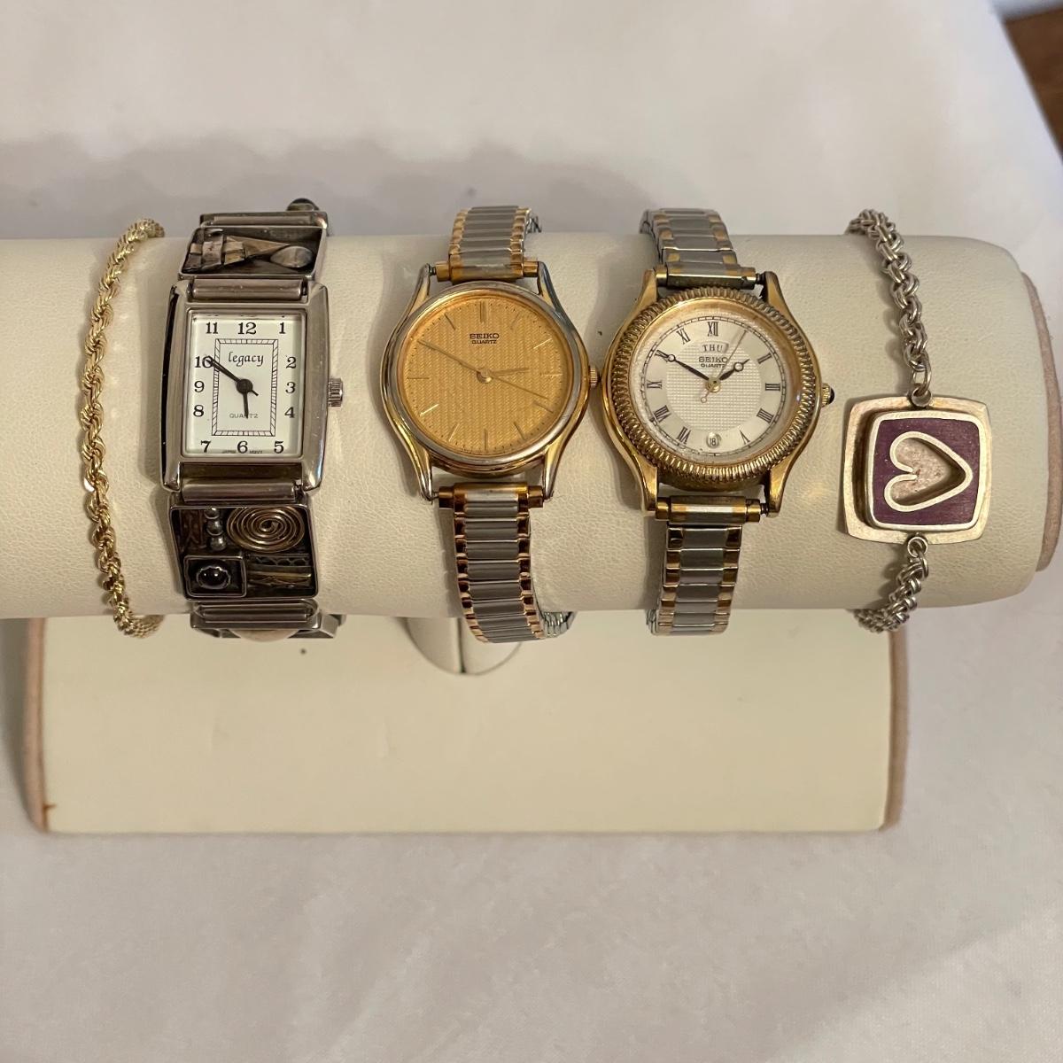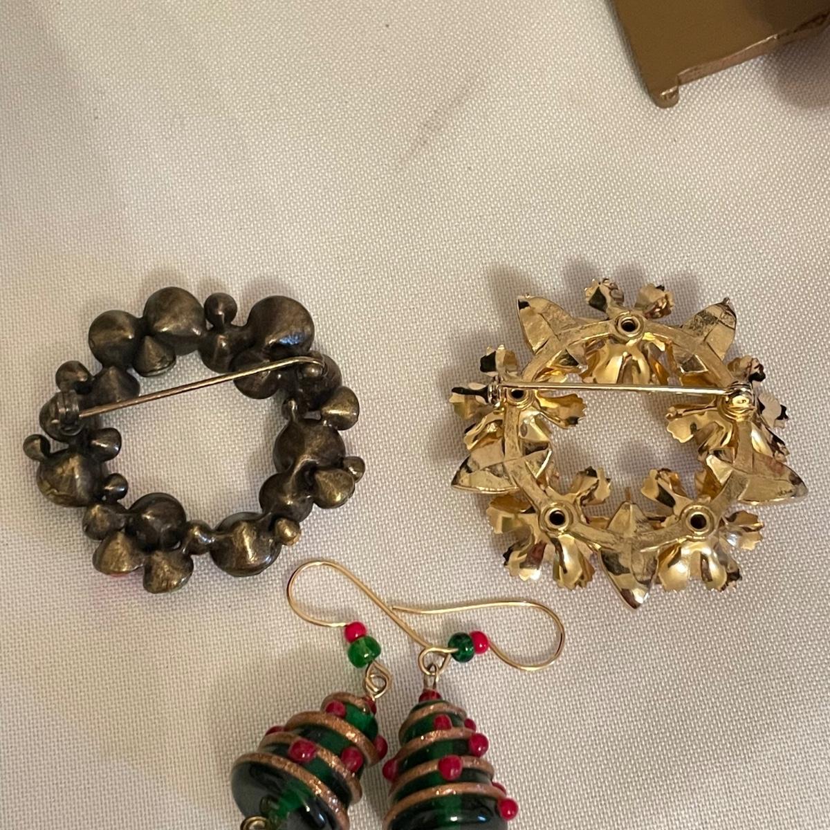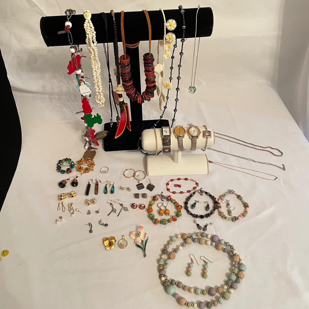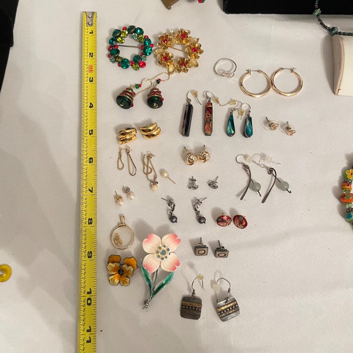Over 20 pairs of earrings for pierced ears, six those match with other items in the lot (five sets total). Lot also includes Christmas themed brooches, earrings and a necklace, two Seiko and one Legacy watches, six bracelets and twelve necklaces plus one adjustable ring. The necklaces range from about 15” to 30”. See images for markings, including sterling. Shipping available. All sales are final. No returns or refunds. Please bid accordingly.