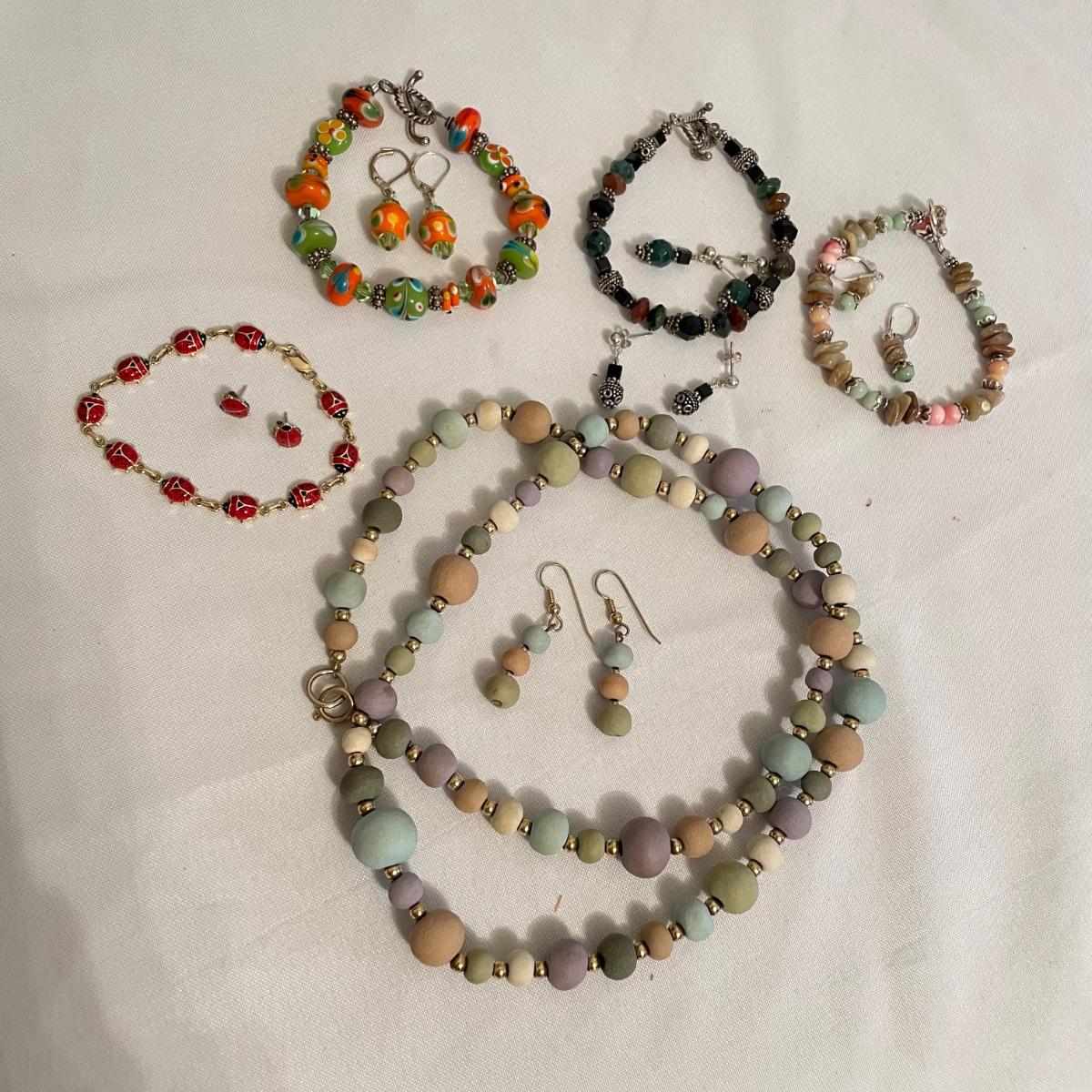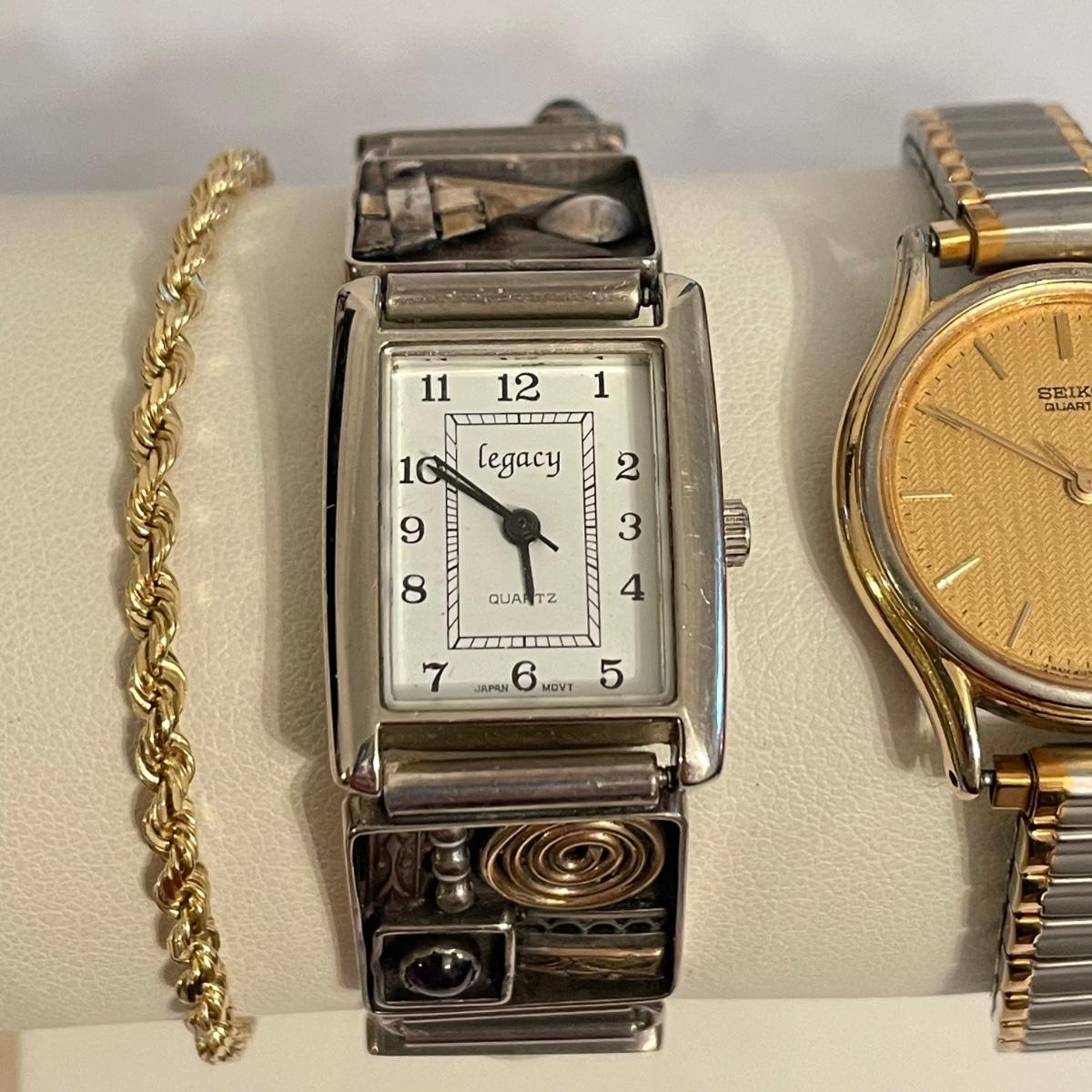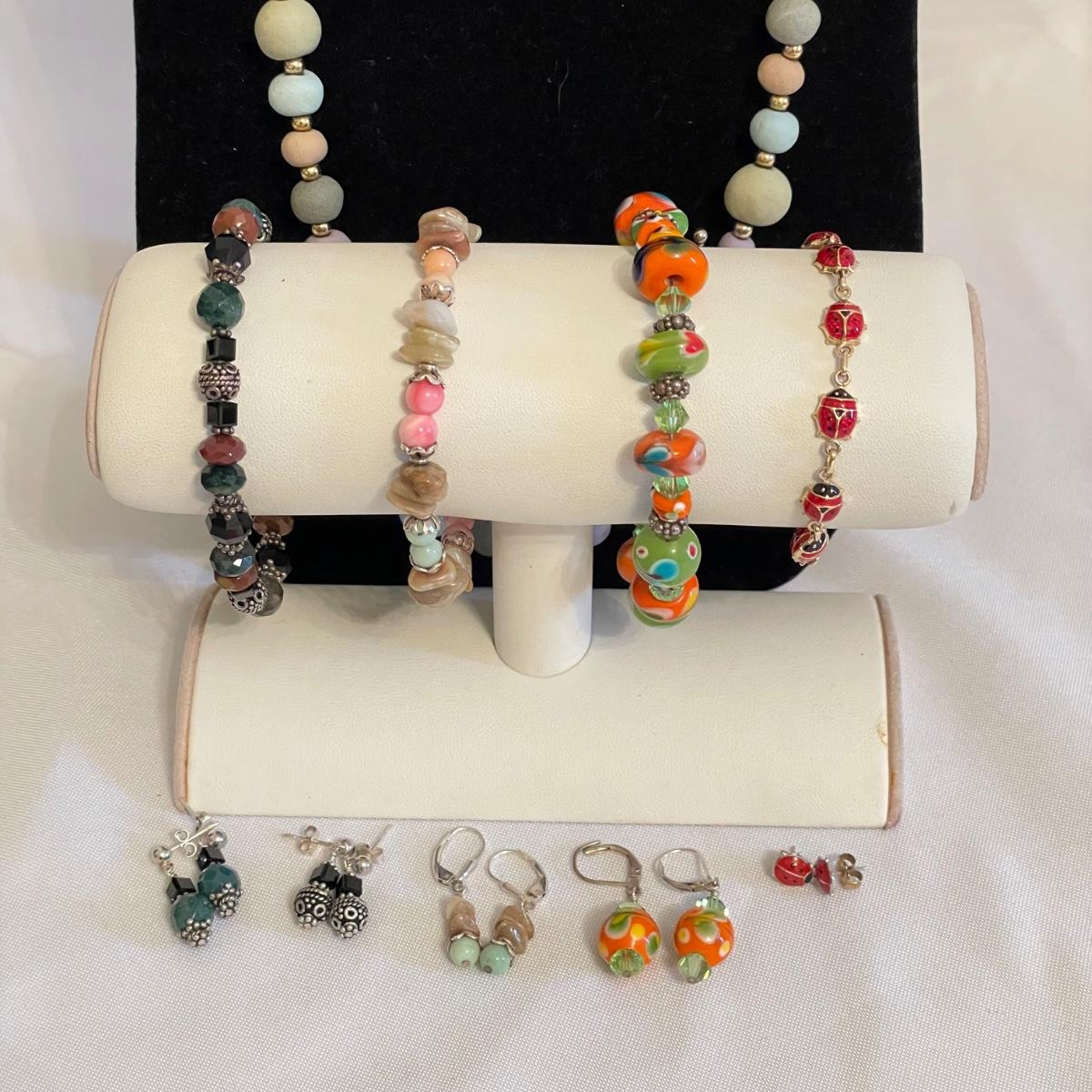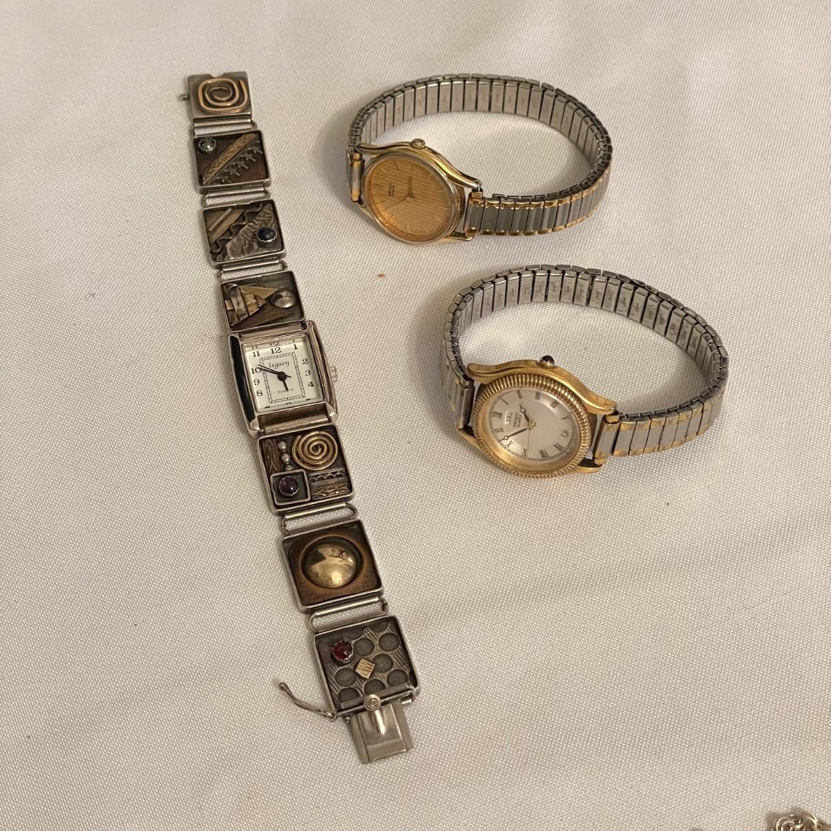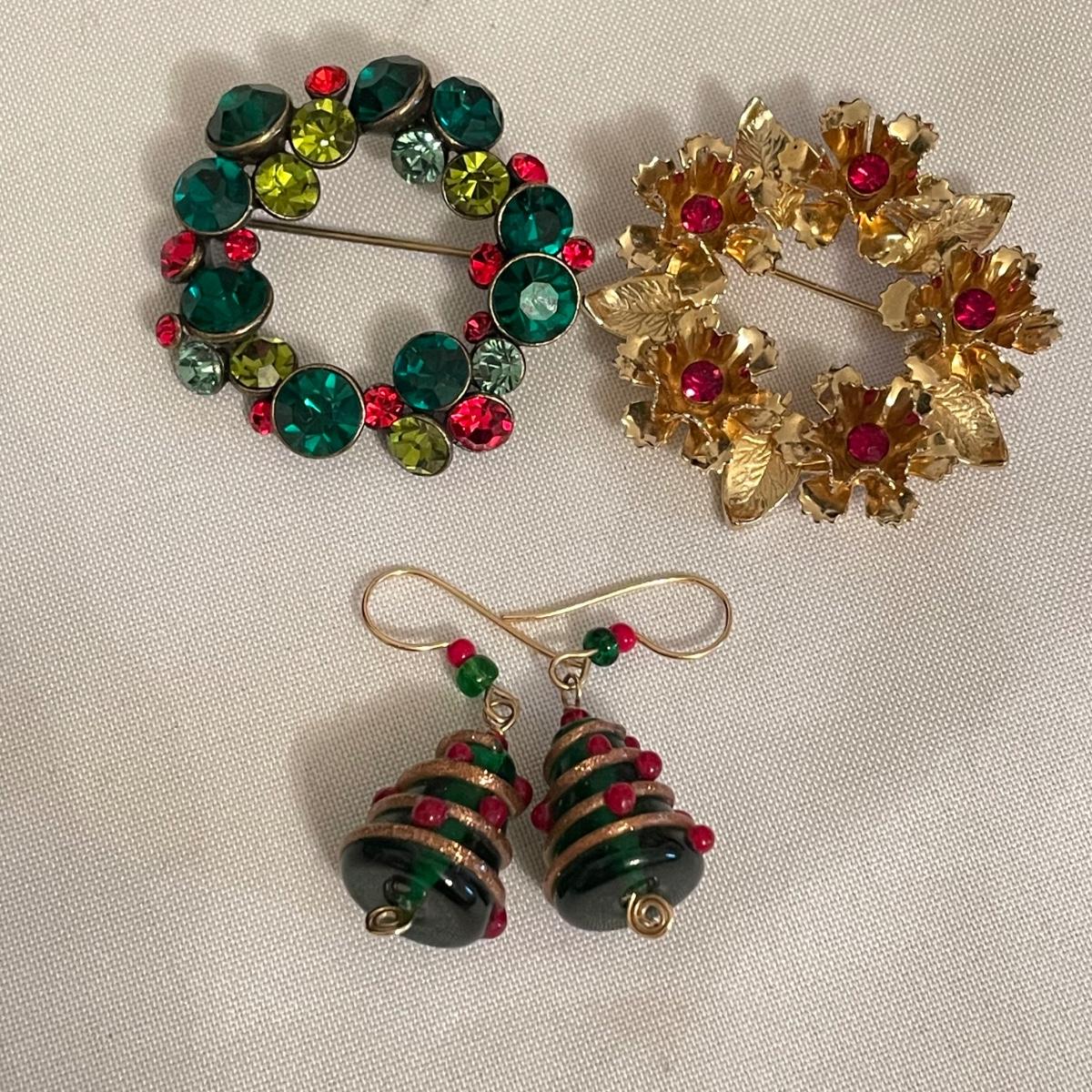 Over 20 pairs of earrings for pierced ears, six those match with other items in the lot (five sets total). Lot also includes Christmas themed brooches, earrings and a necklace, two Seiko and one Legacy watches, six bracelets and twelve necklaces plus one adjustable ring. The necklaces range from about 15” to 30”. See images for markings, including sterling. Shipping available. All sales are final. No returns or refunds. Please bid accordingly.