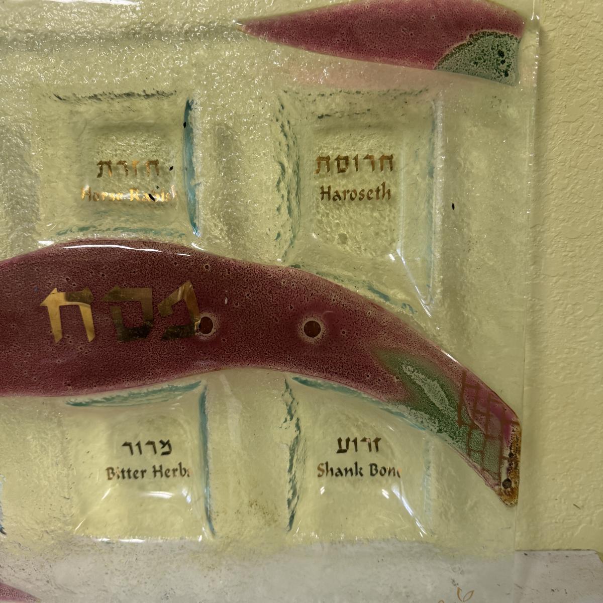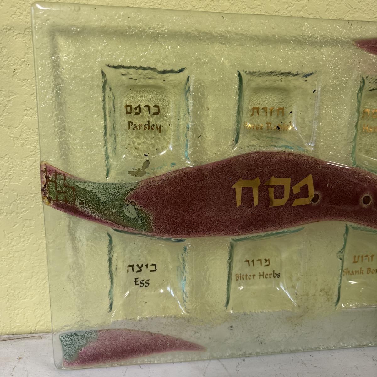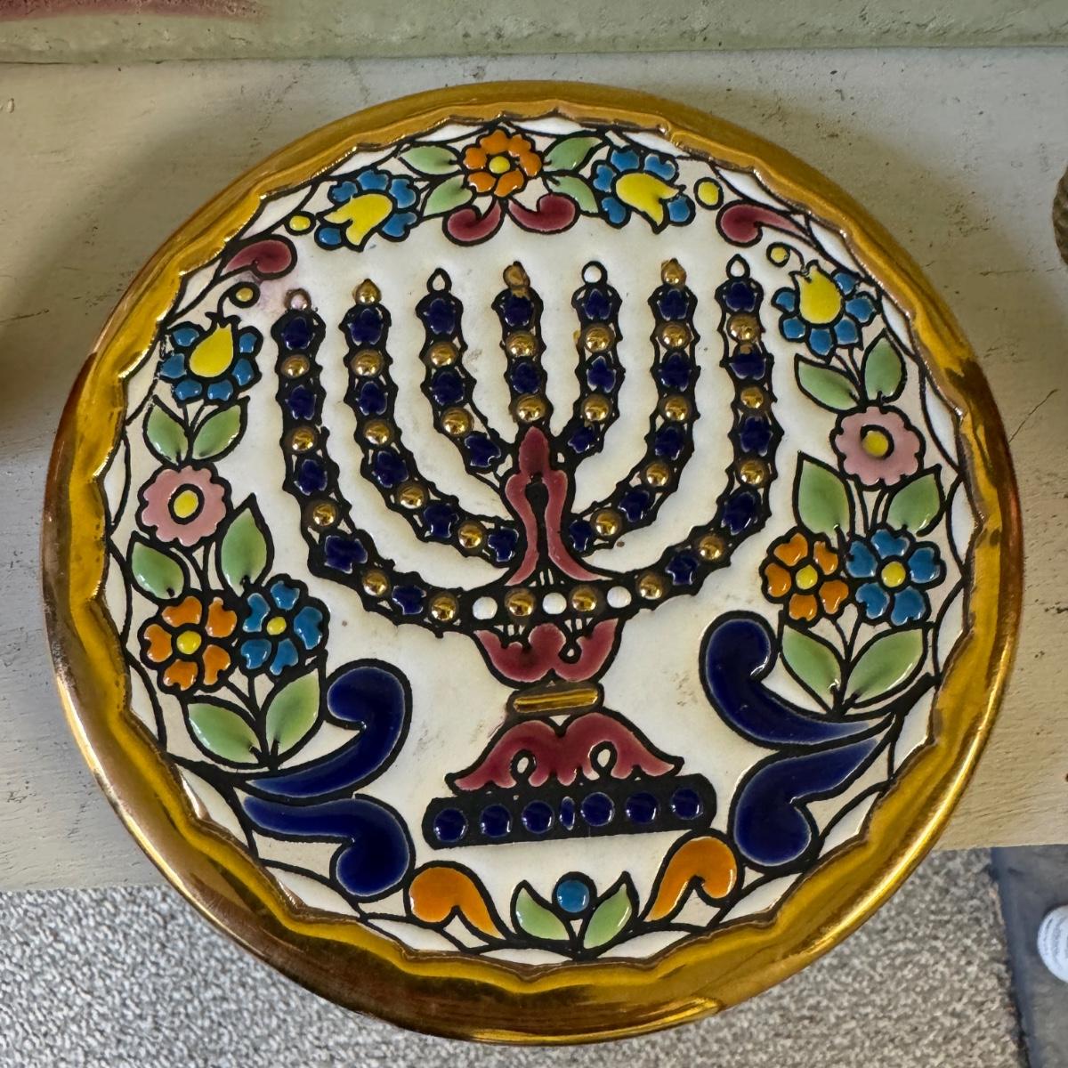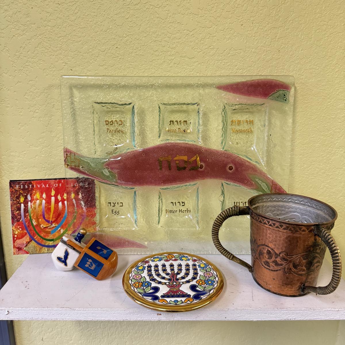 An assortment of items to celebrate Jewish faith. Includes 6 yamakas, trivet, CD, metal two handled mug, 2 dreidels and a signed Glass platter that measures 14.5” x 12”. Shipping available