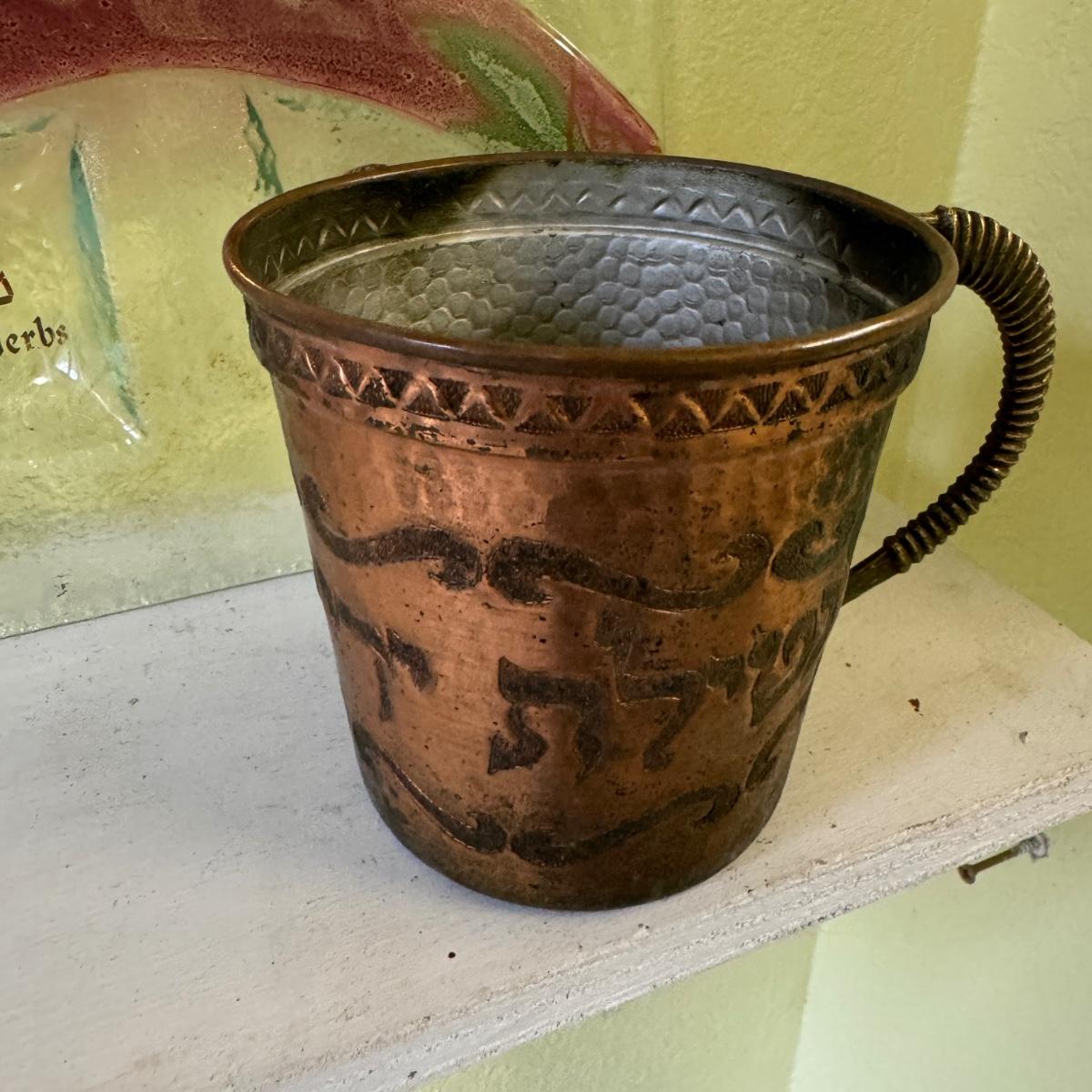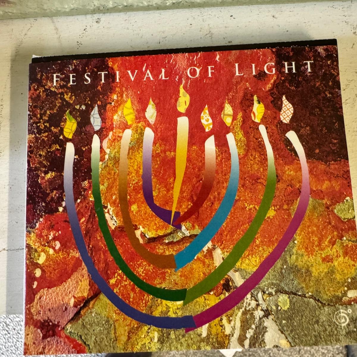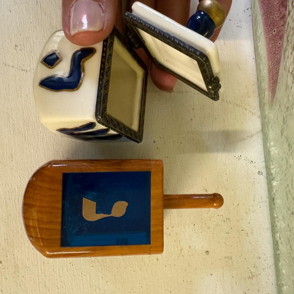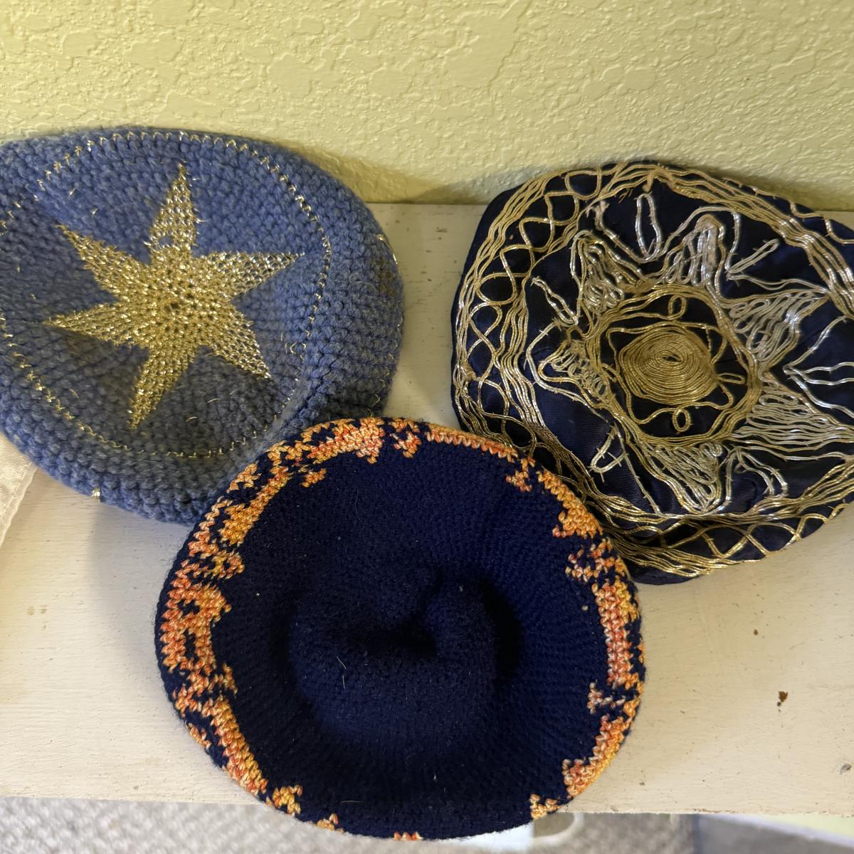 An assortment of items to celebrate Jewish faith. Includes 6 yamakas, trivet, CD, metal two handled mug, 2 dreidels and a signed Glass platter that measures 14.5” x 12”. Shipping available