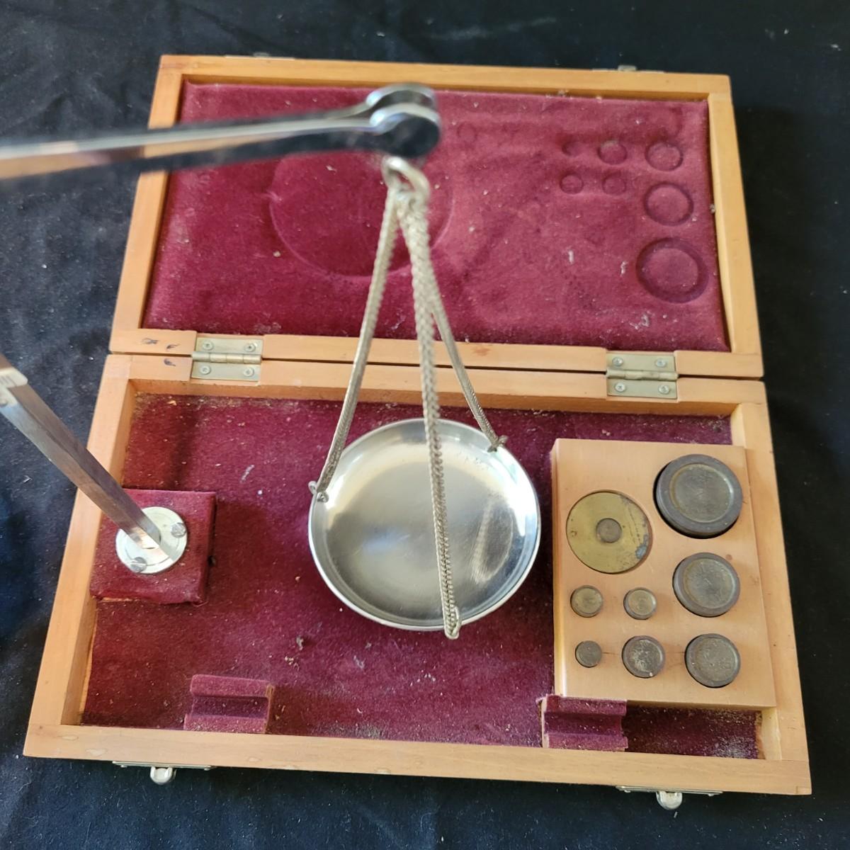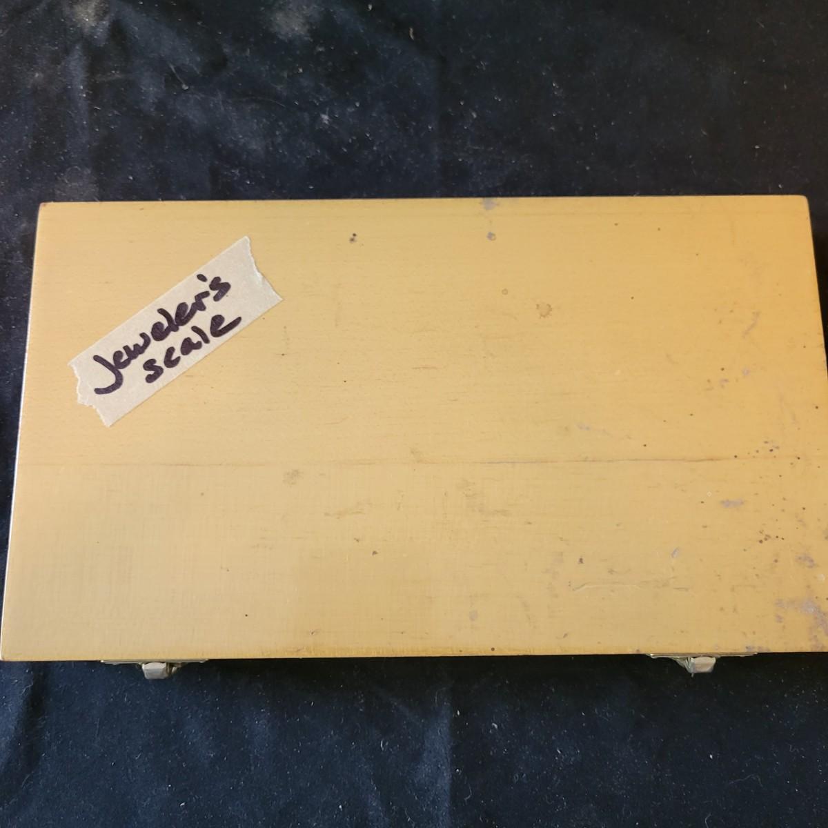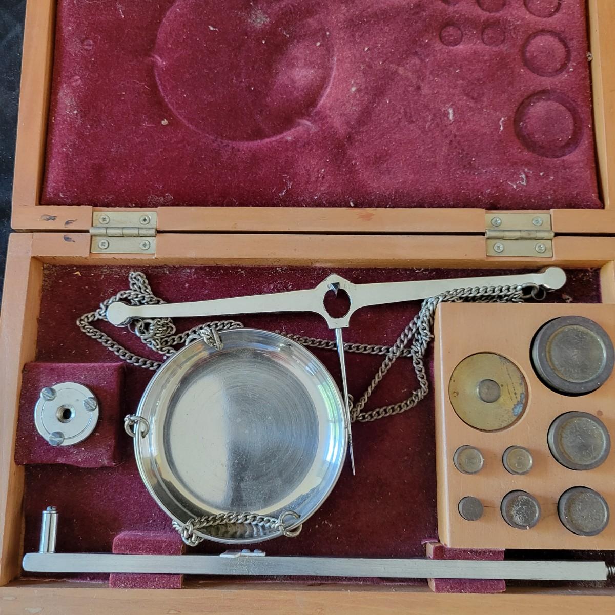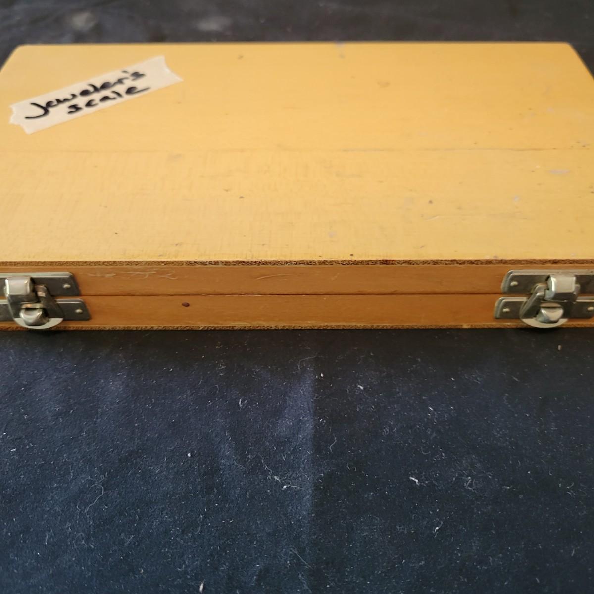 Older jewelers scale made of stainless steel scale affixed on top of a wooden box with drawer. The bottom of the box and scale are are stamped with West Germany and there is a tag, Allcraft Tool and Supply Co, NY in the drawer. Scale appears to function completely and is in excellent condition. The base does have some damage, see attached pictures. Measures approximately 12" x 5.5" x 13" Additional jewelers scale and weights with an assortment of weights that disassembles to fit in a wooden box. Box measures approximately 10" x 6" x 1"