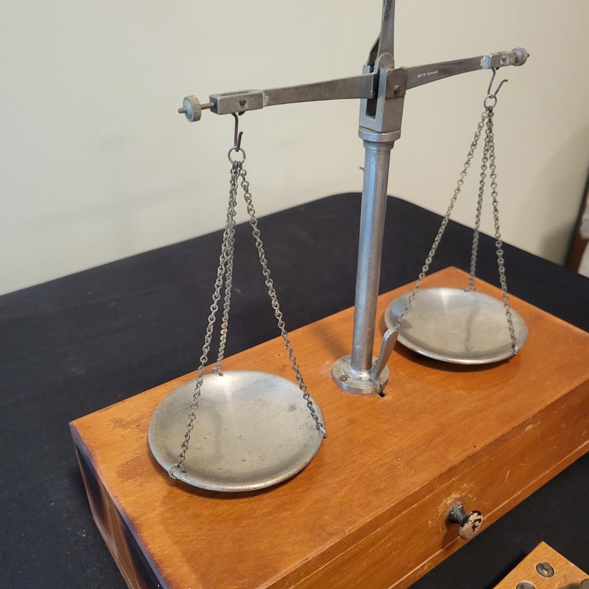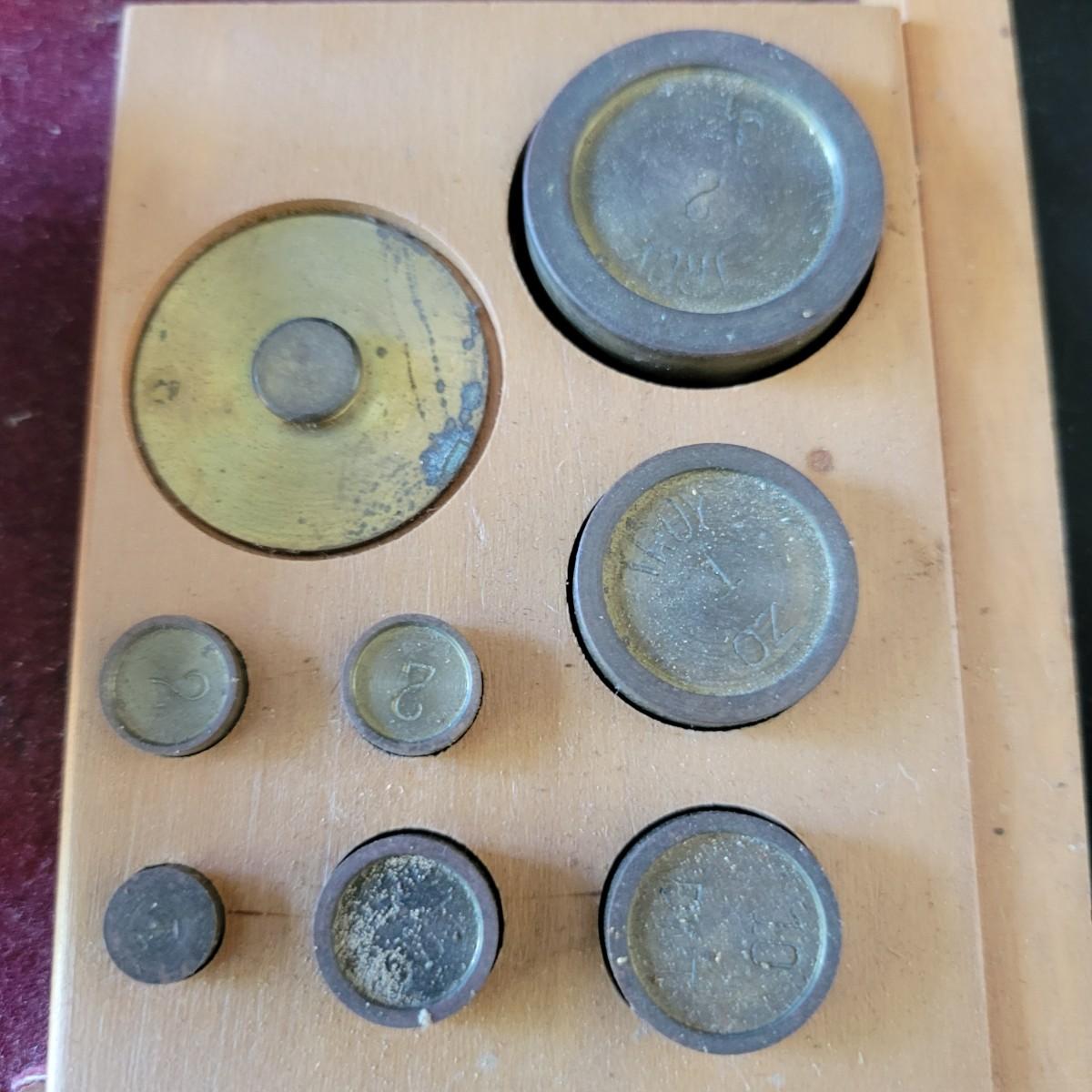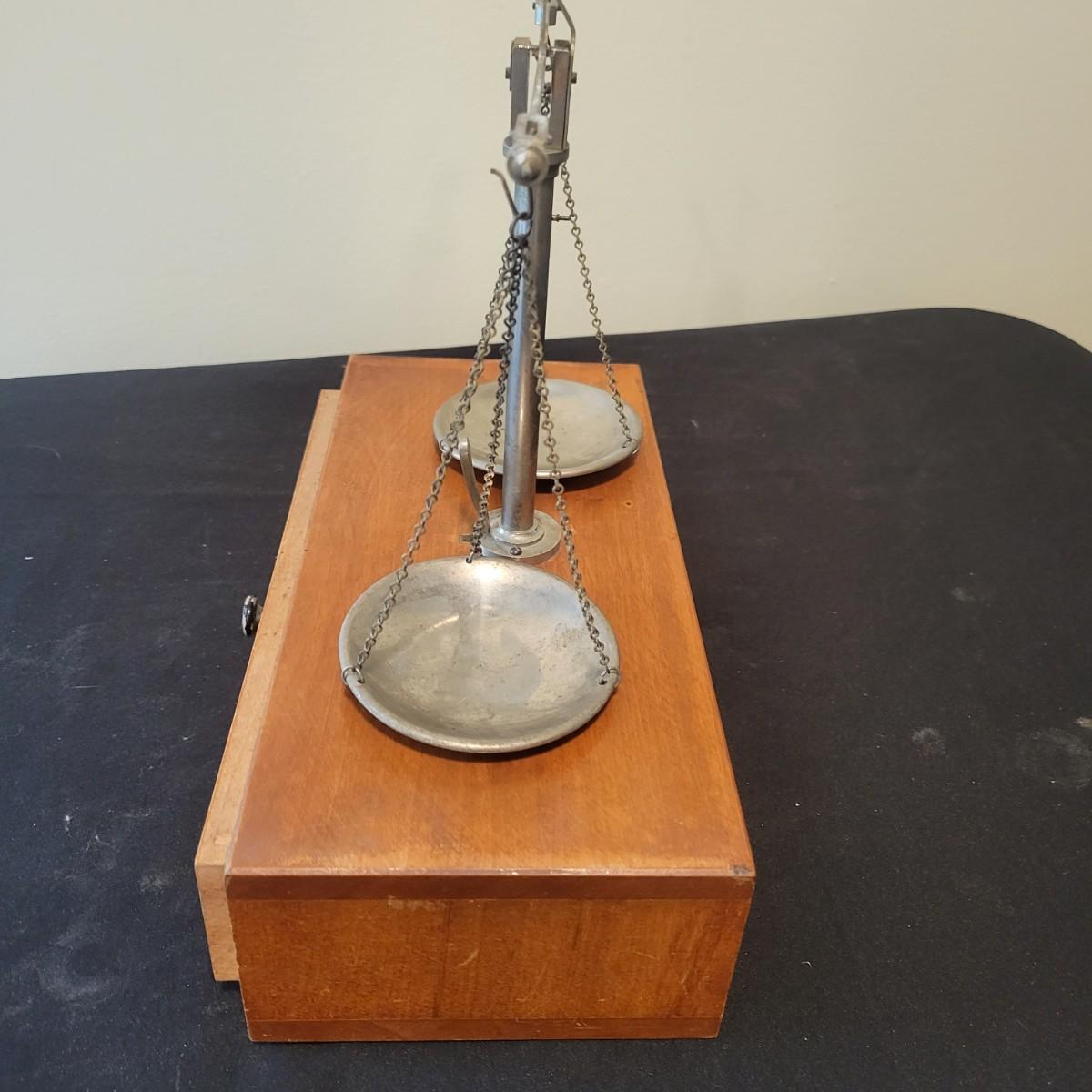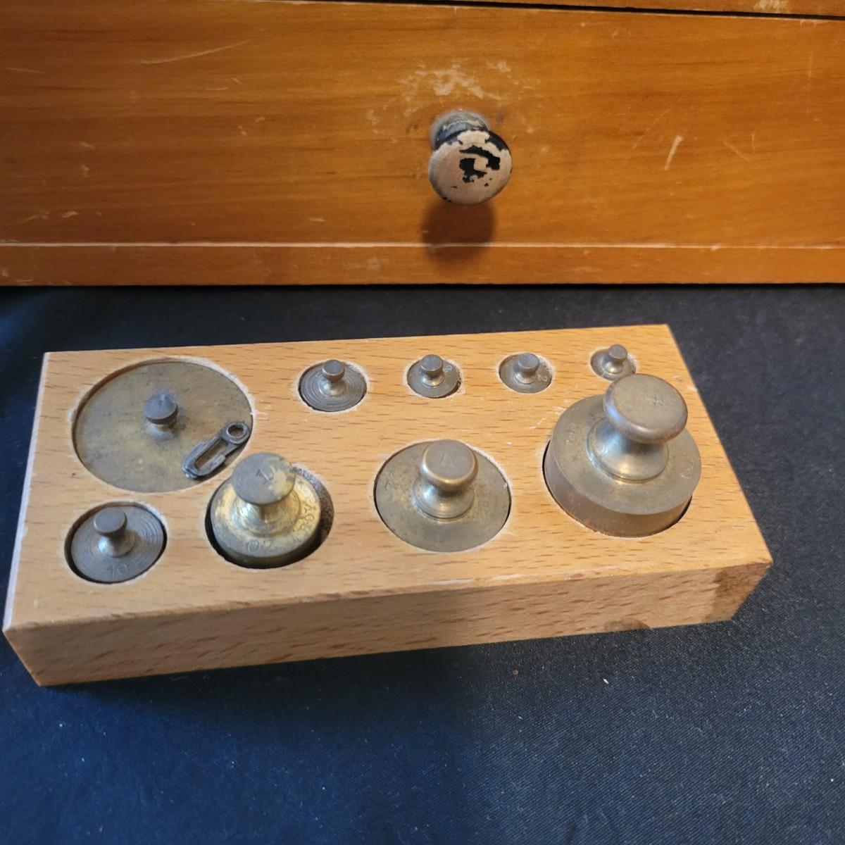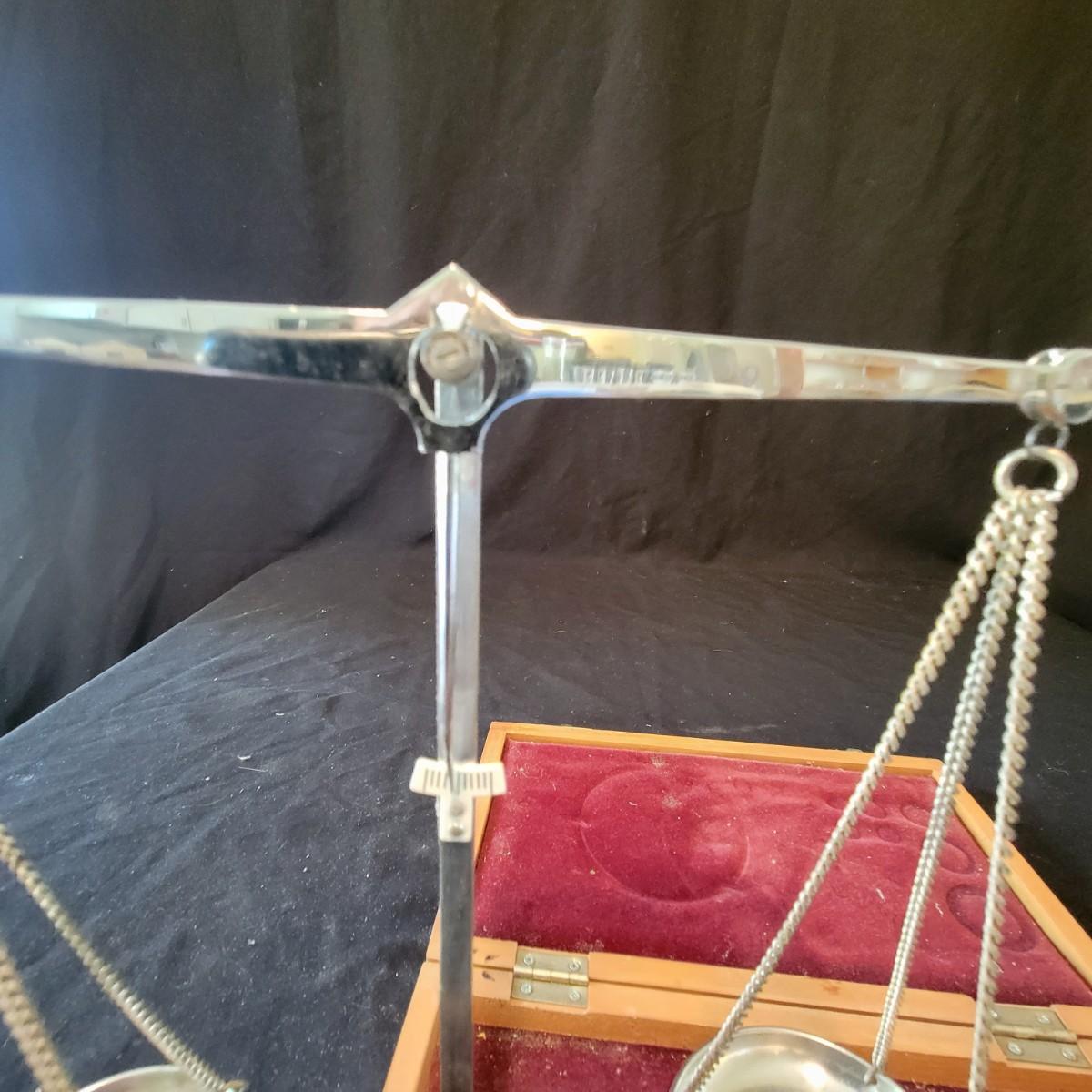 Older jewelers scale made of stainless steel scale affixed on top of a wooden box with drawer. The bottom of the box and scale are are stamped with West Germany and there is a tag, Allcraft Tool and Supply Co, NY in the drawer. Scale appears to function completely and is in excellent condition. The base does have some damage, see attached pictures. Measures approximately 12" x 5.5" x 13" Additional jewelers scale and weights with an assortment of weights that disassembles to fit in a wooden box. Box measures approximately 10" x 6" x 1"