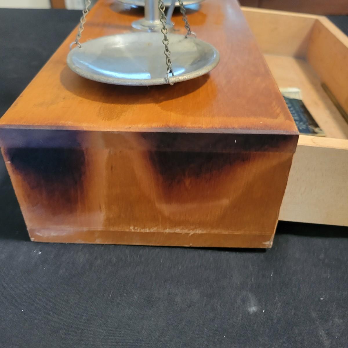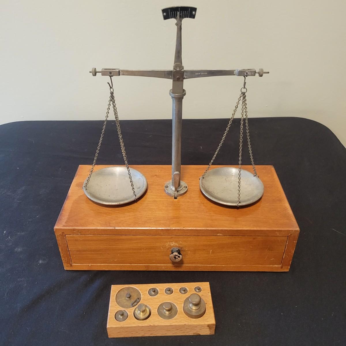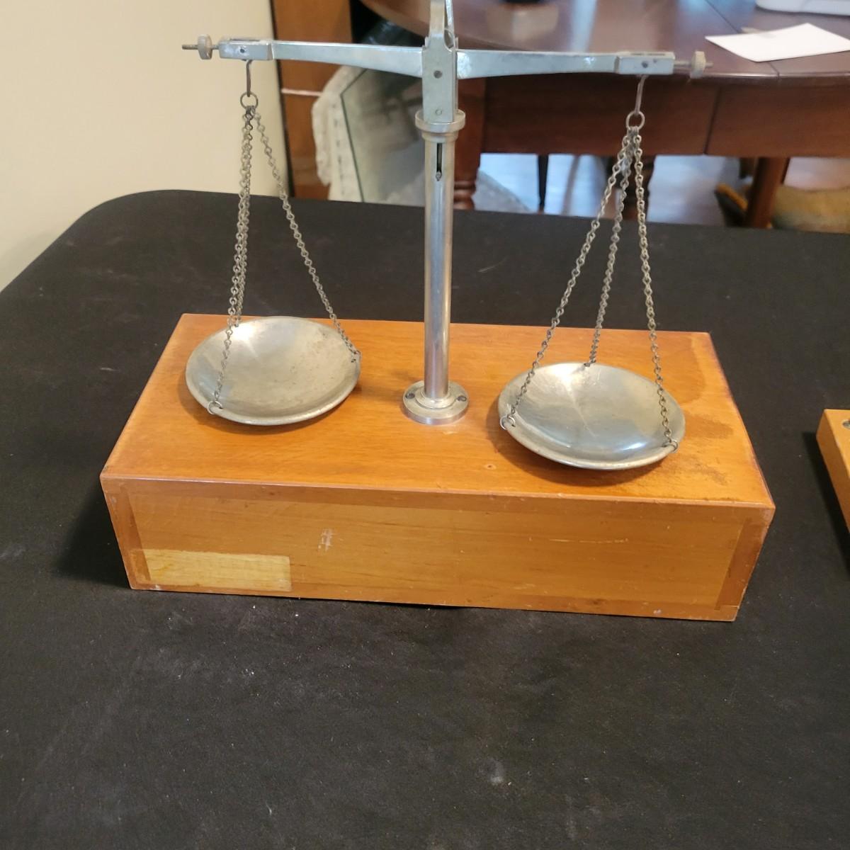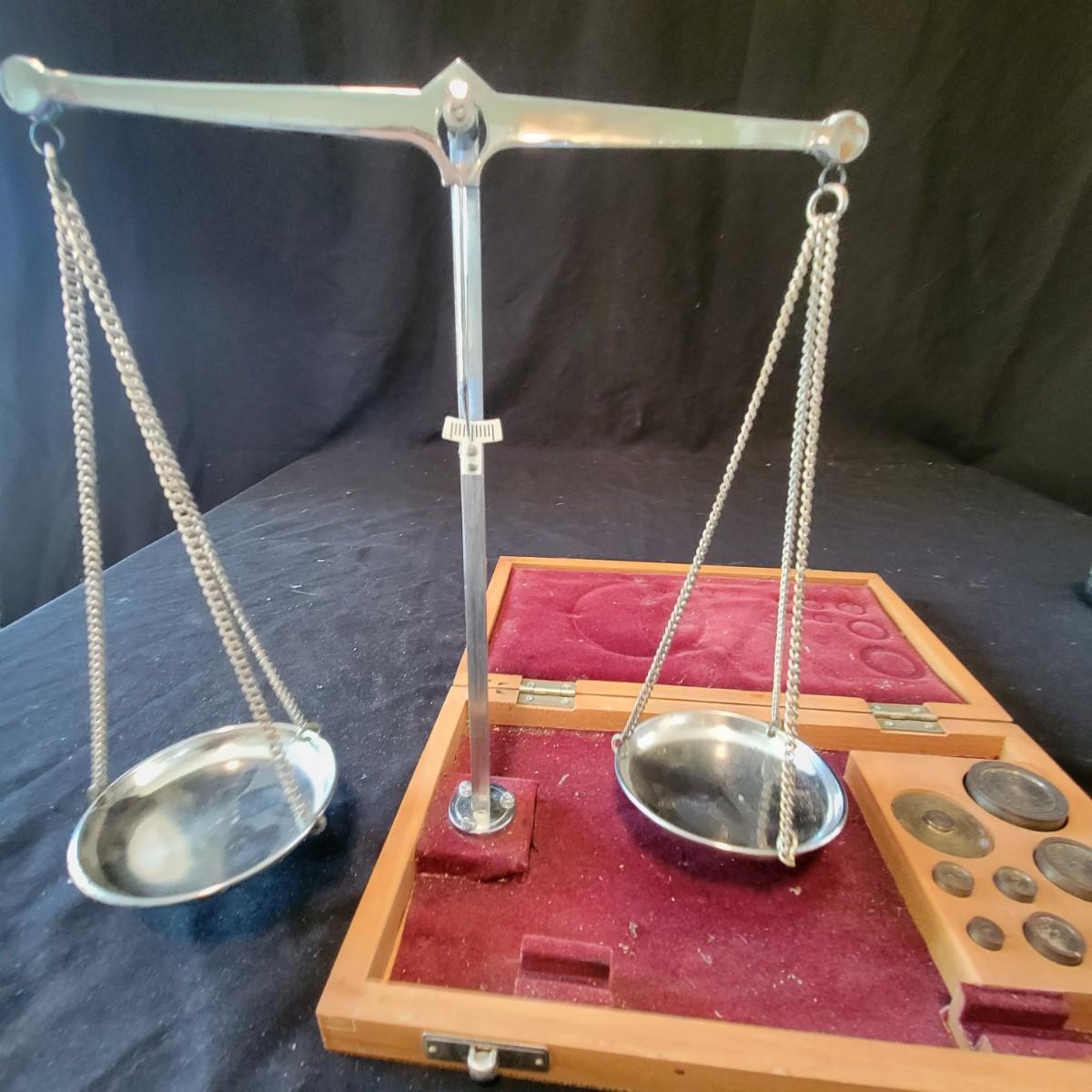 Older jewelers scale made of stainless steel scale affixed on top of a wooden box with drawer. The bottom of the box and scale are are stamped with West Germany and there is a tag, Allcraft Tool and Supply Co, NY in the drawer. Scale appears to function completely and is in excellent condition. The base does have some damage, see attached pictures. Measures approximately 12" x 5.5" x 13" Additional jewelers scale and weights with an assortment of weights that disassembles to fit in a wooden box. Box measures approximately 10" x 6" x 1"
