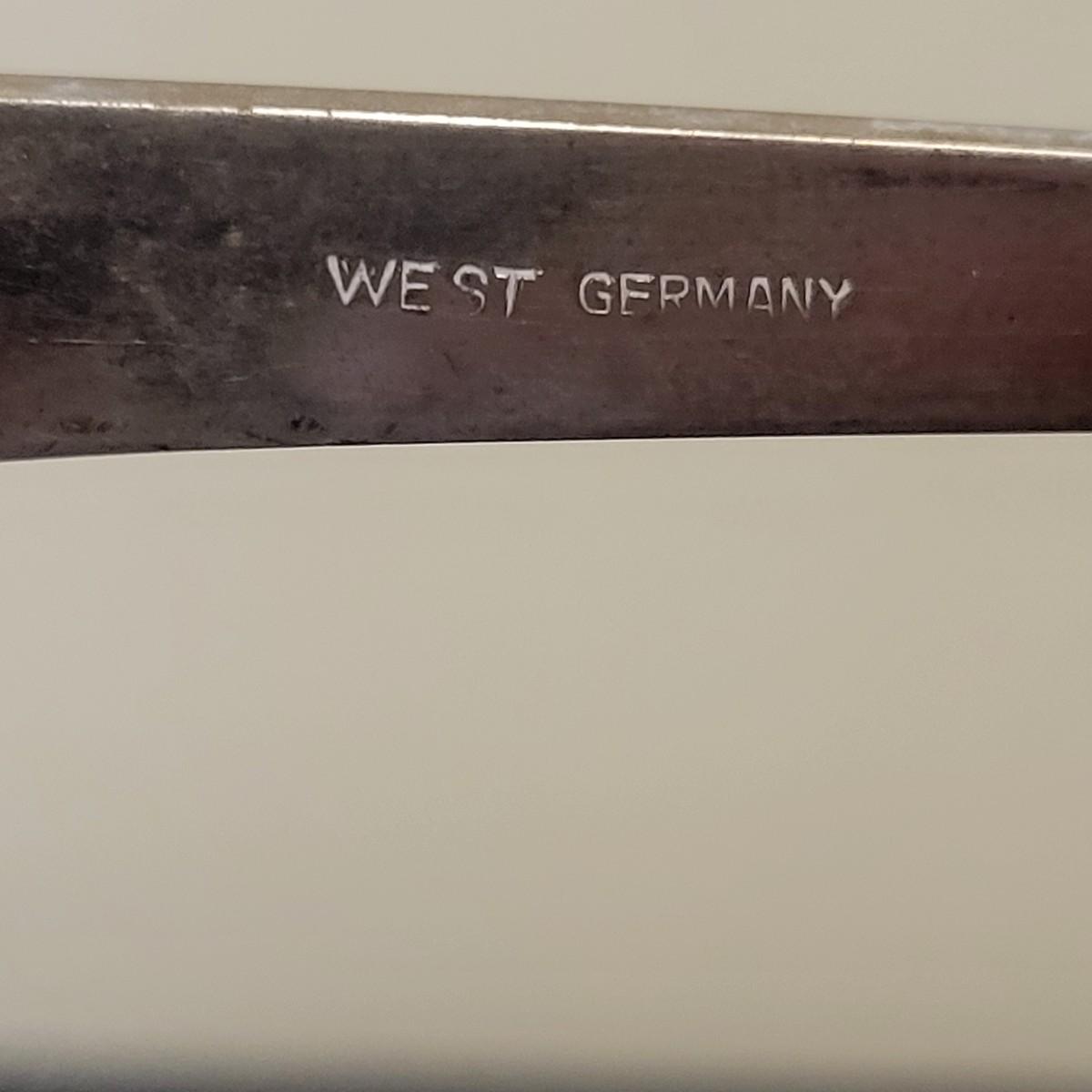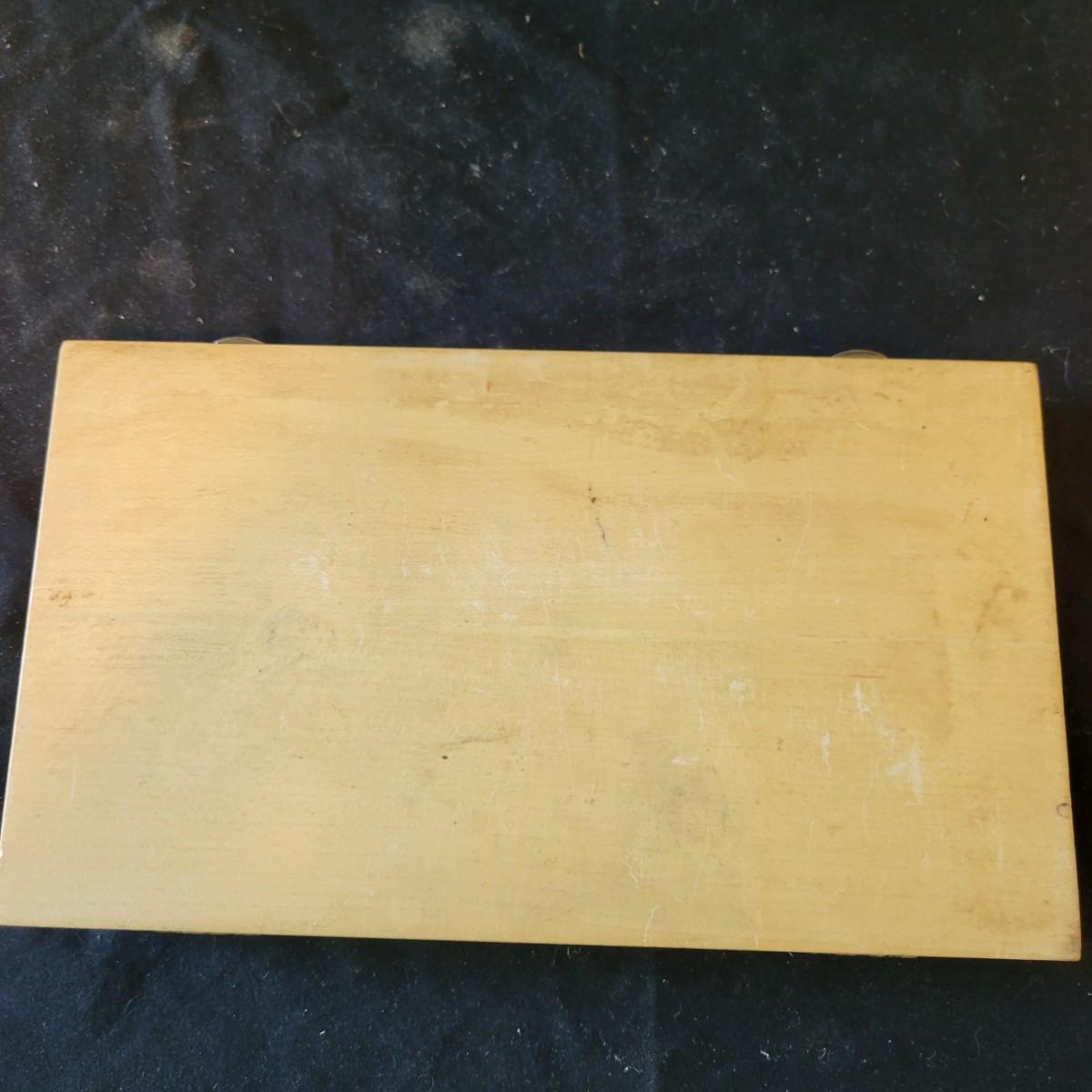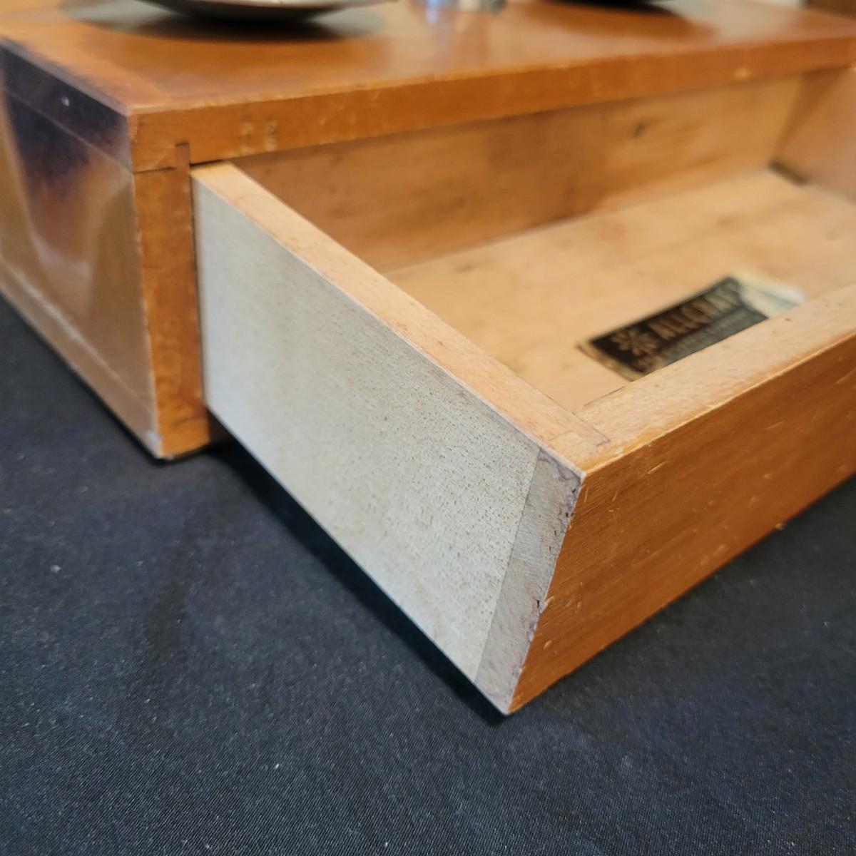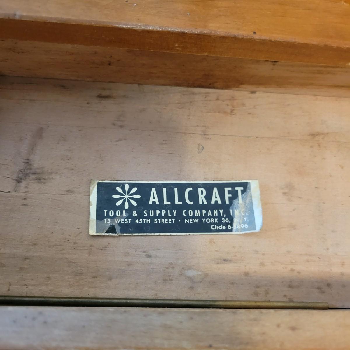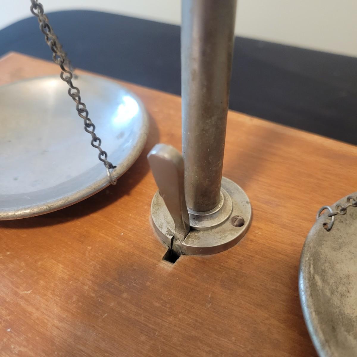 Older jewelers scale made of stainless steel scale affixed on top of a wooden box with drawer. The bottom of the box and scale are are stamped with West Germany and there is a tag, Allcraft Tool and Supply Co, NY in the drawer. Scale appears to function completely and is in excellent condition. The base does have some damage, see attached pictures. Measures approximately 12" x 5.5" x 13" Additional jewelers scale and weights with an assortment of weights that disassembles to fit in a wooden box. Box measures approximately 10" x 6" x 1"