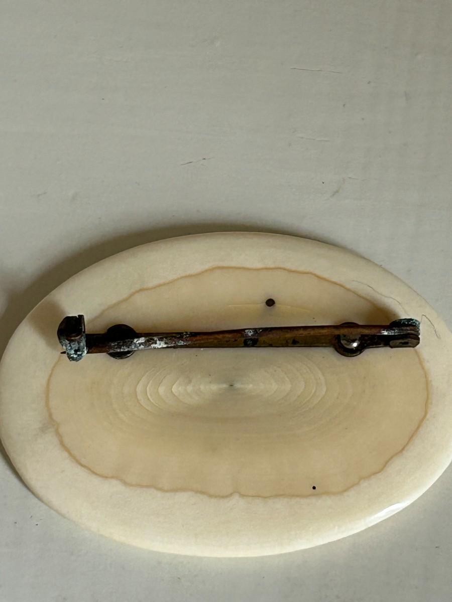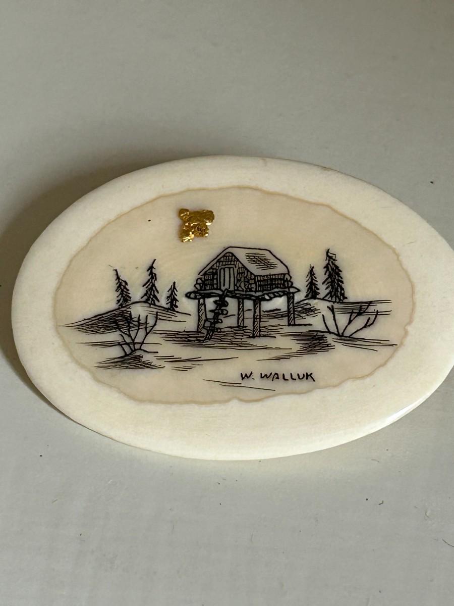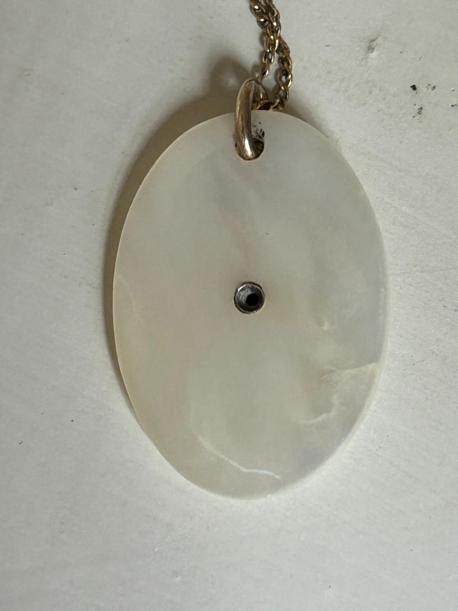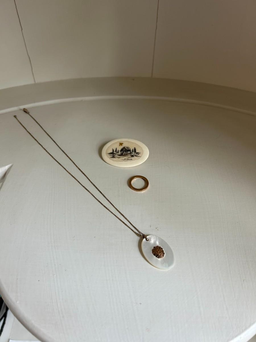 Mother of Pearl necklace with gold crest, gold ring and scrimshaw pin with gold accent.