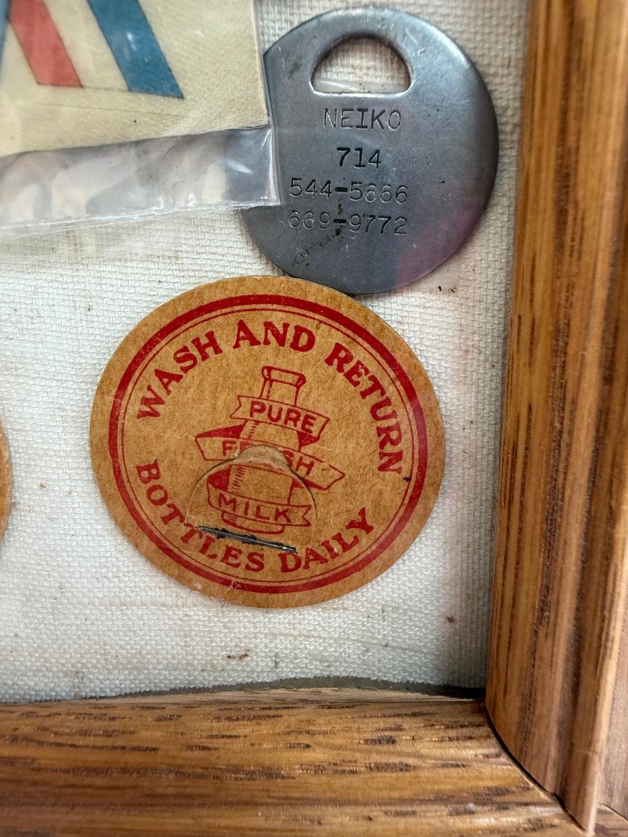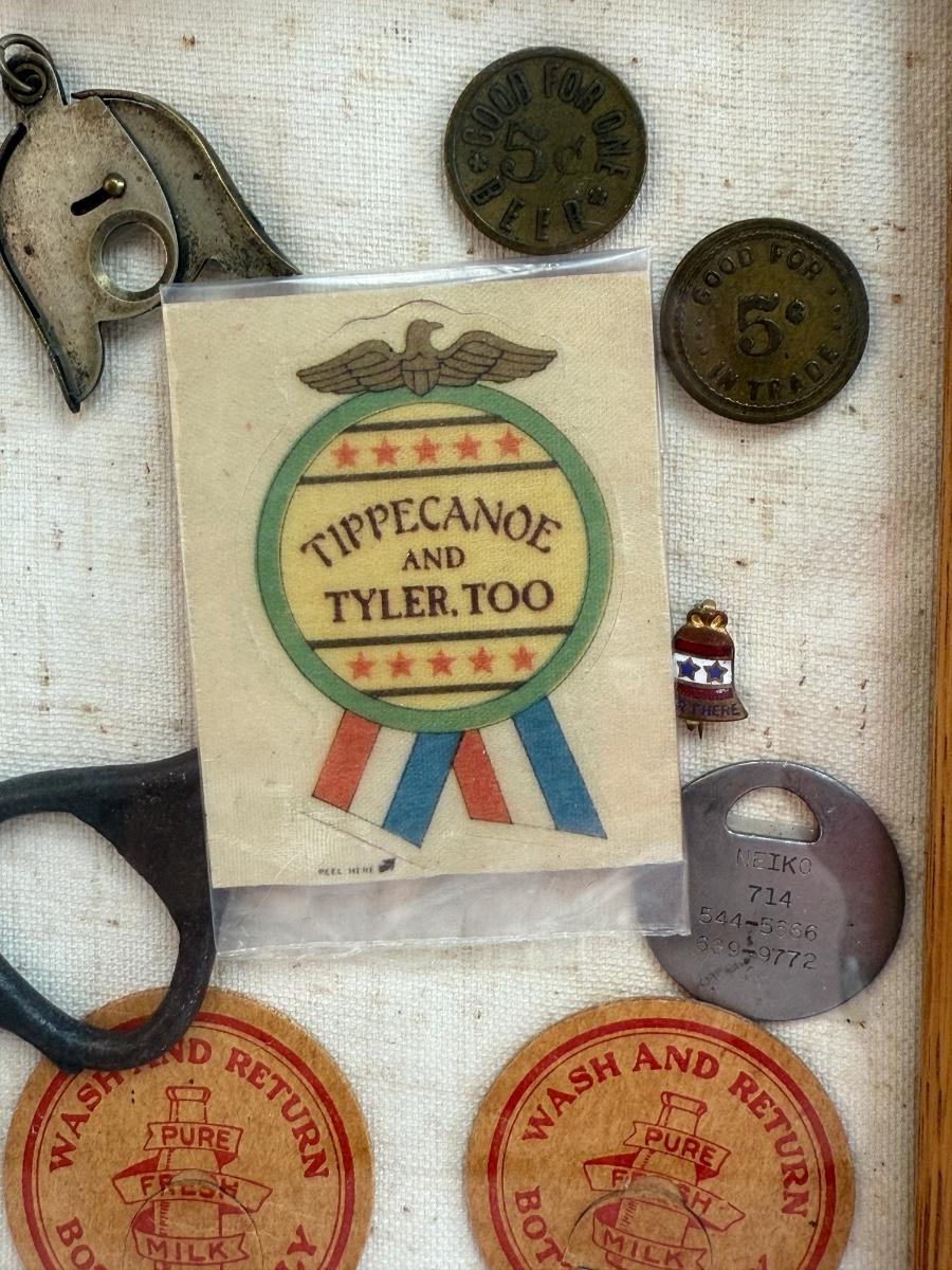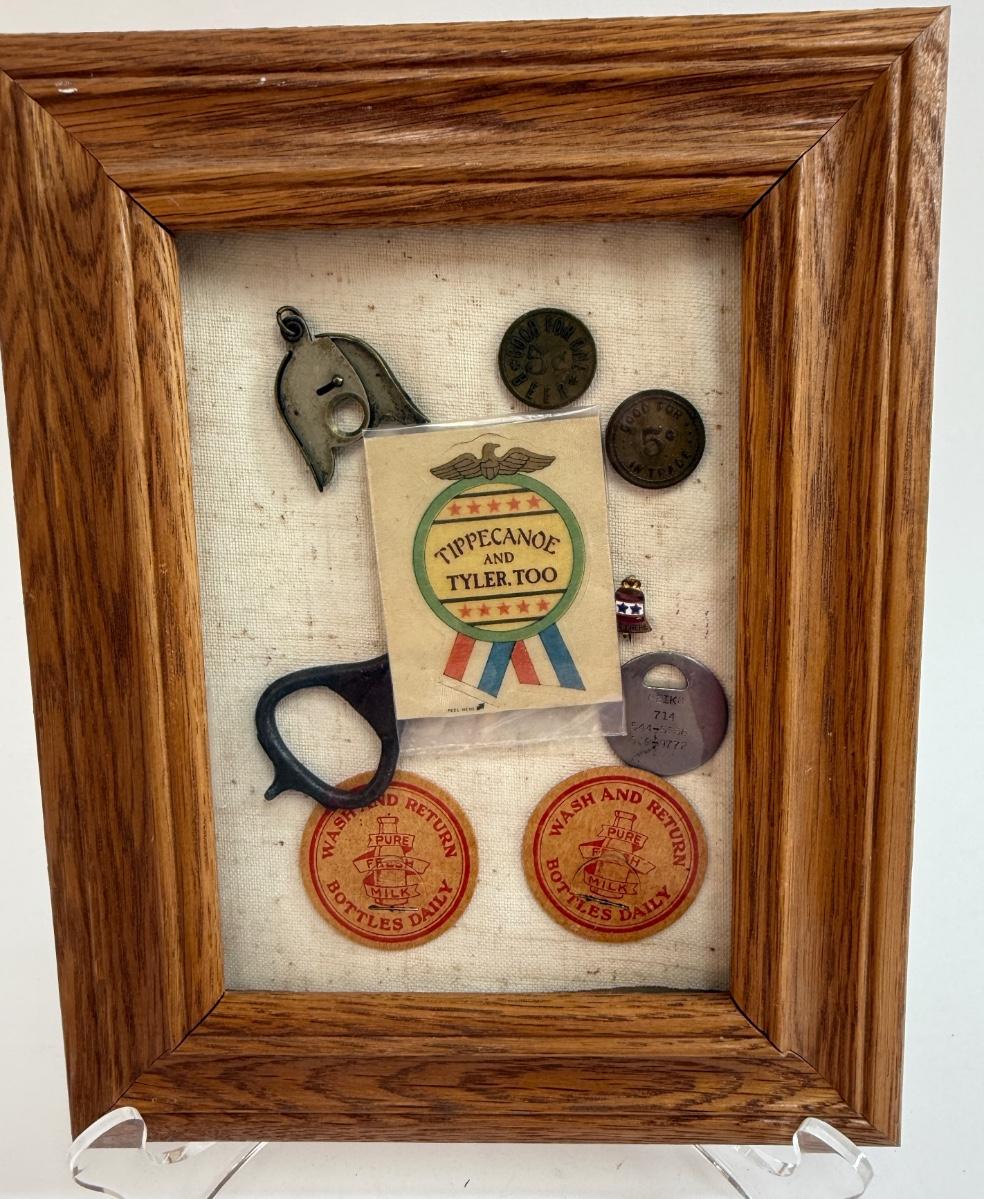 Framed Collage: Wooden Tokens, Bottle Opener, Campaign Sticker, and More