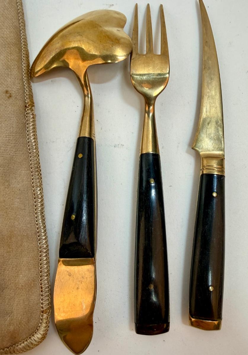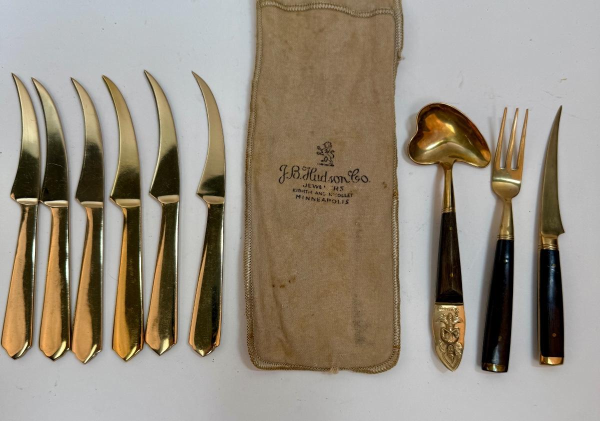 Gold Tone Knife & Serving Utensil set in vintage advertising felt bag