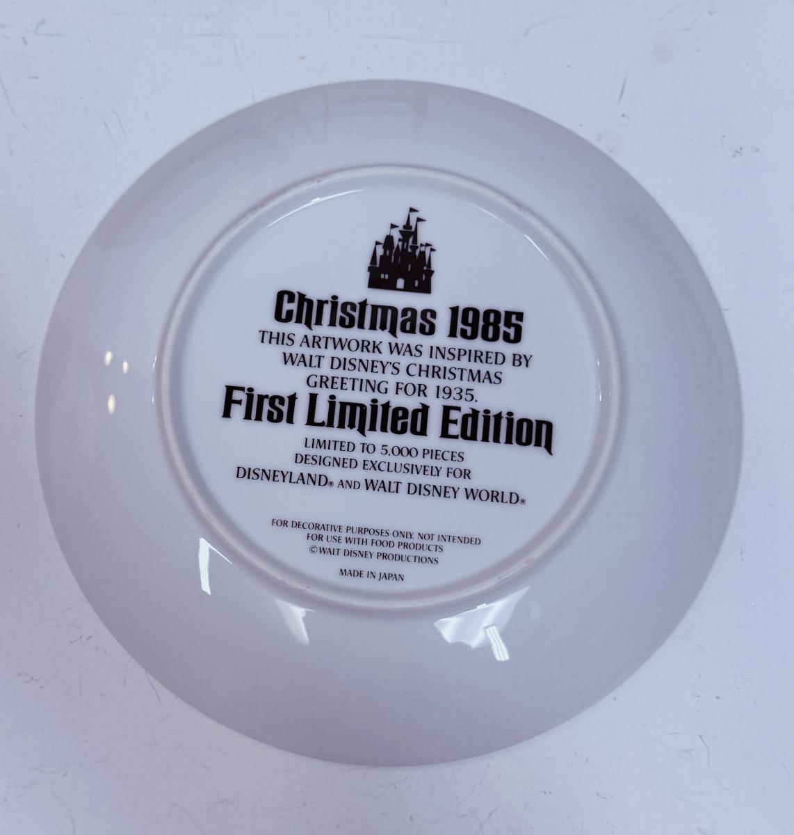 Limited to 5,000 plates. Designed Exclusively for Disneyland and Walt Disney World. Made in Japan. Inspired by Walt Disney's Christmas Greeting for 1935. Measures 8 3/4" diameter. Trimmed in gold. With original box.