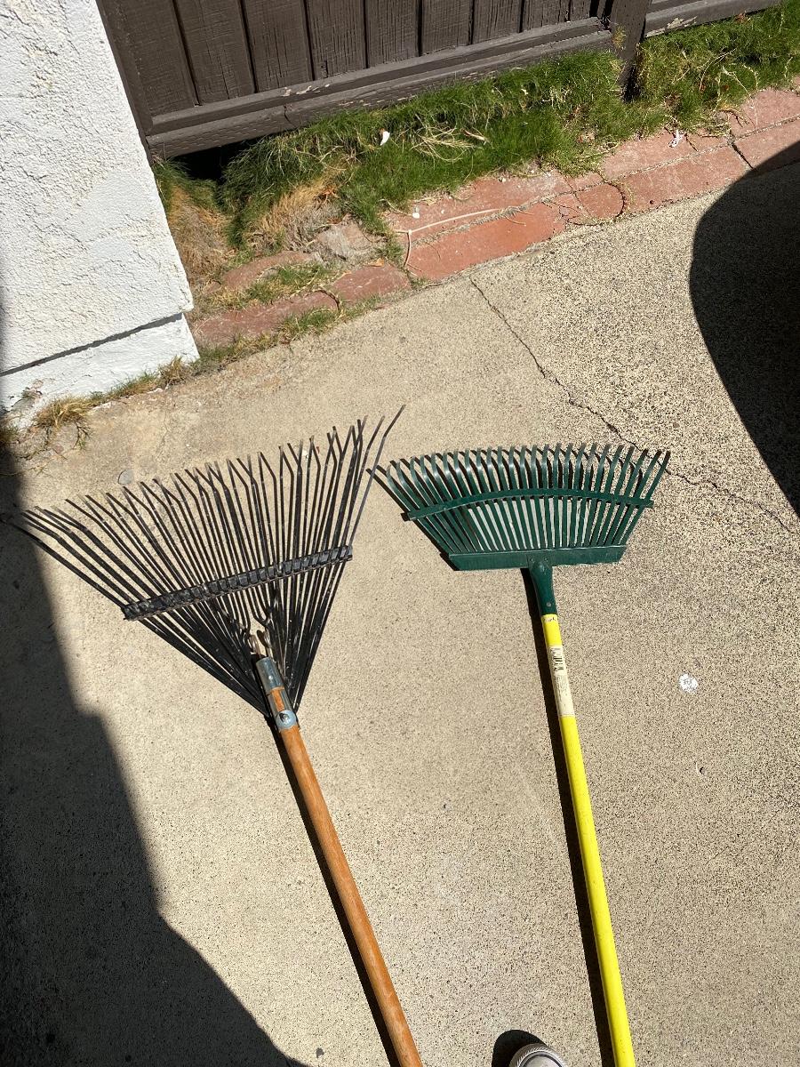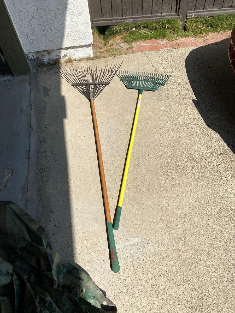 Pair of rakes one is a Vigoro rake and the other is a no name brand, both have some use but there is no significant damage to the pieces.