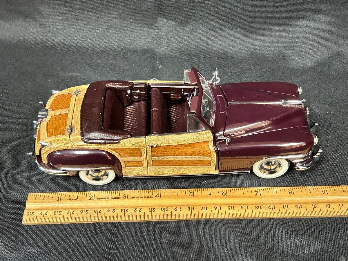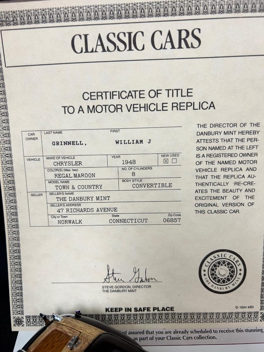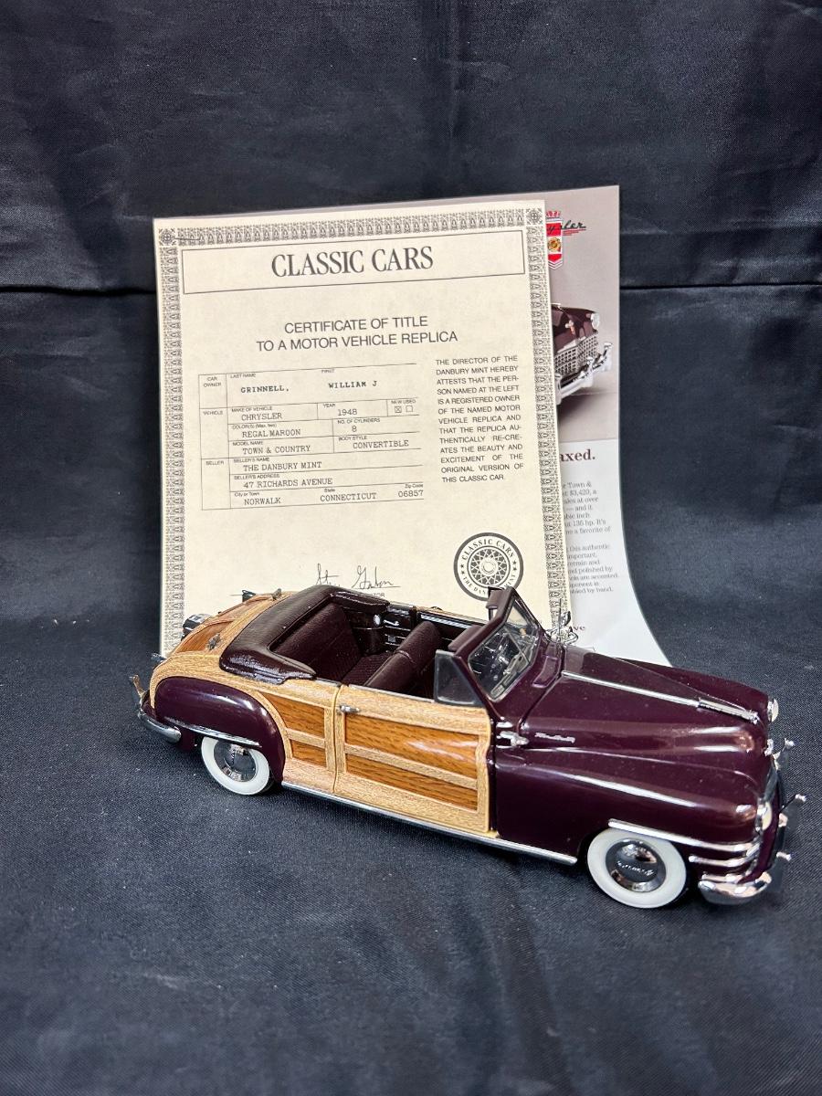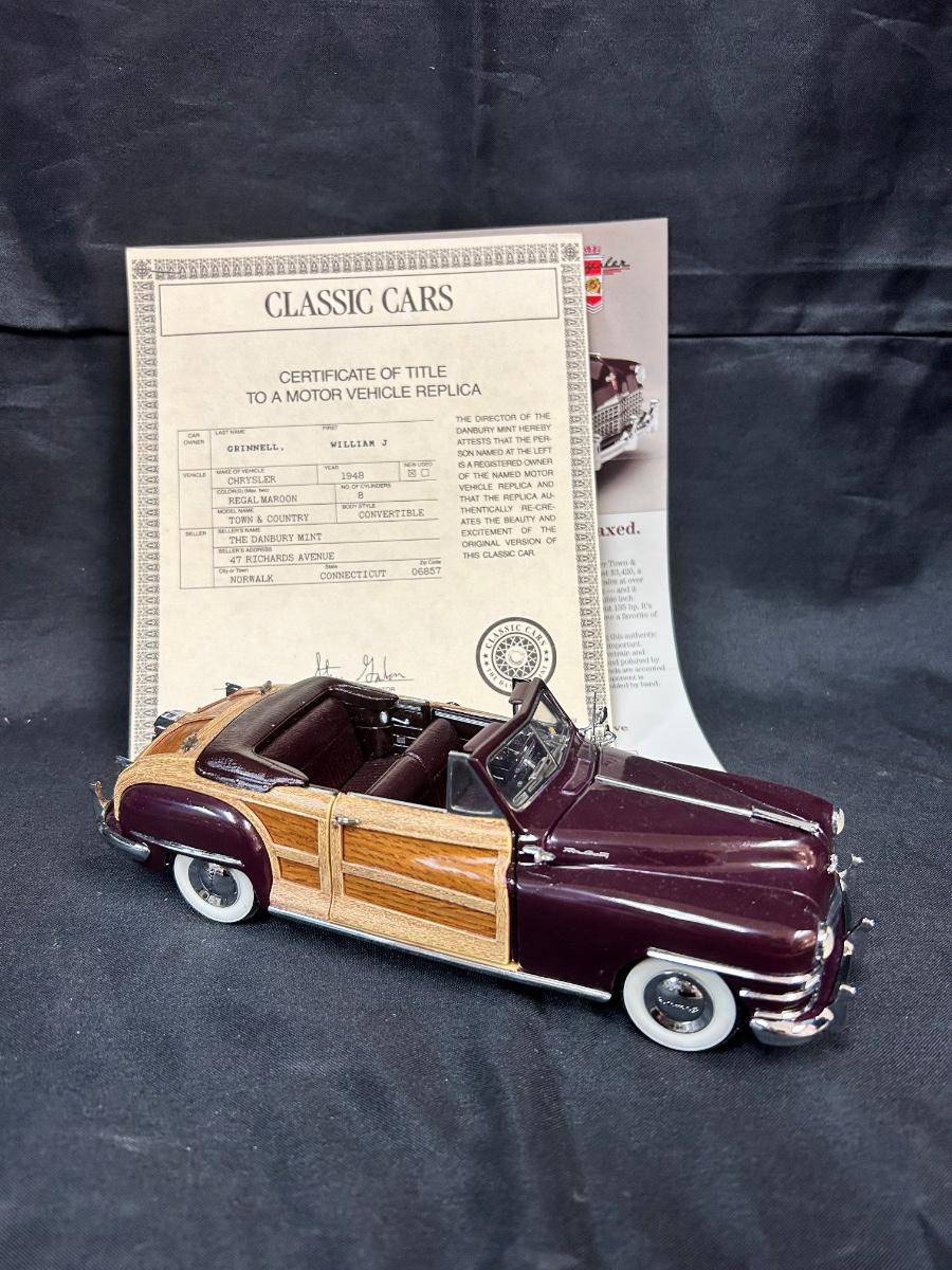 1948 Regal Maroon Chrysler Town & Country Convertible Premium Scale Model Replica Car Auto Automobile with COA Danbury Mint. In good collector condition. Doors, hood and trunk open; steering wheel controls the front tires. About 9" size. Does not come with plastic display box.