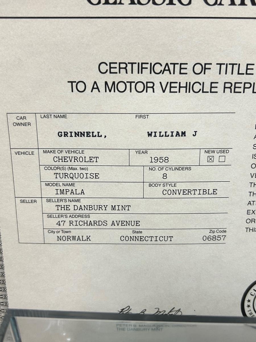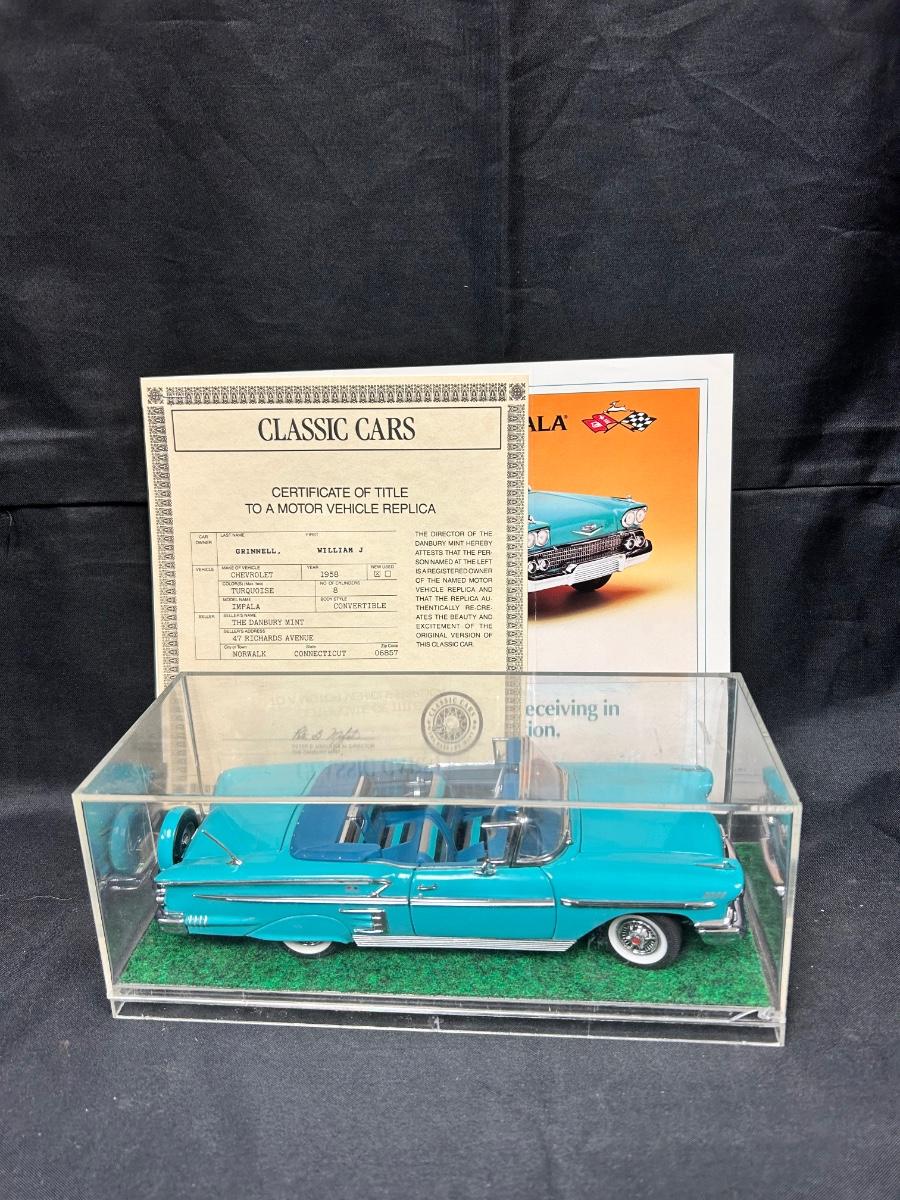 1958 Turquoise Blue Chevrolet Impala Convertible Die Cast Car Auto Replica with COA Danbury Mint. In good collector condition. Comes with plastic display box but box shows signs of age from years of storage. Doors, hood, and trunk open; steering wheel controls front tires. About 9" size.