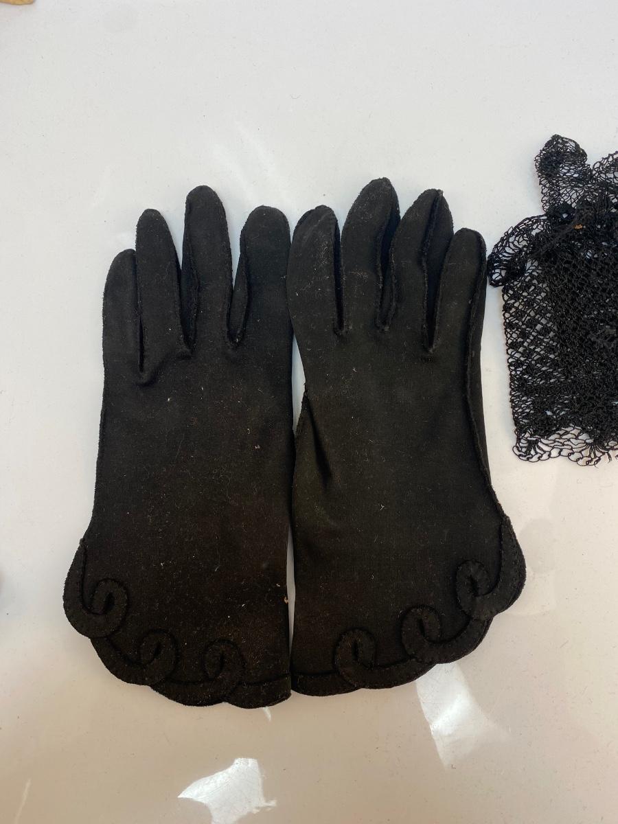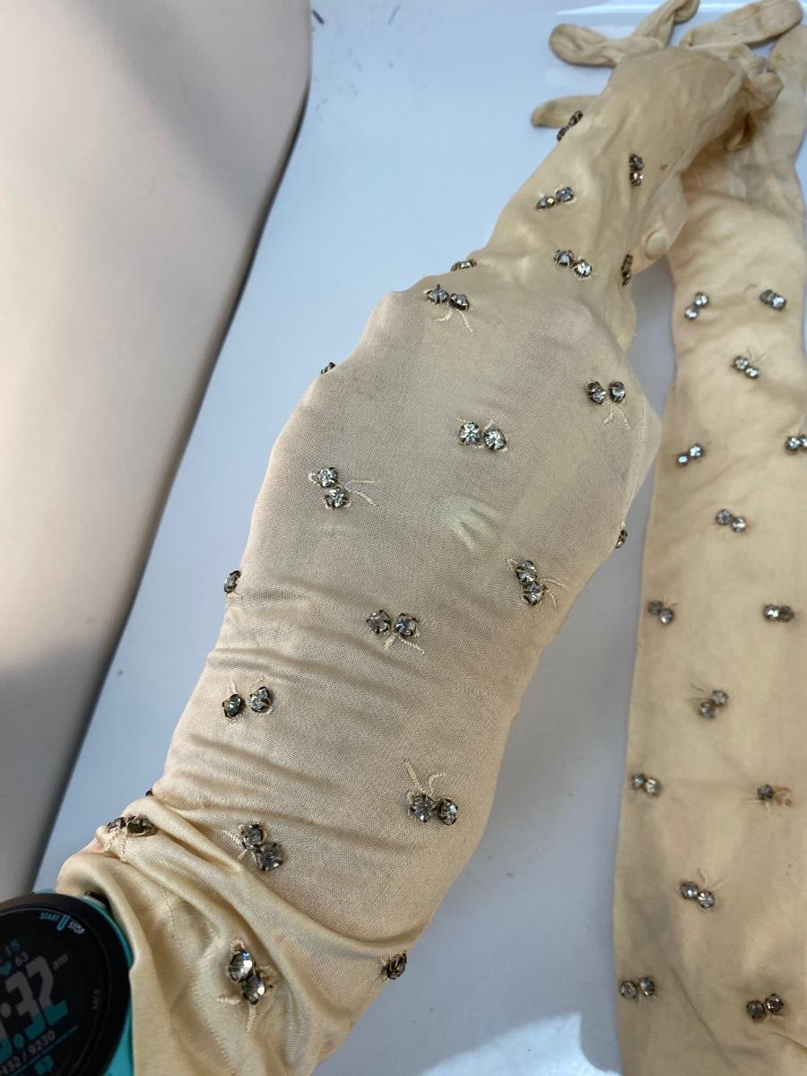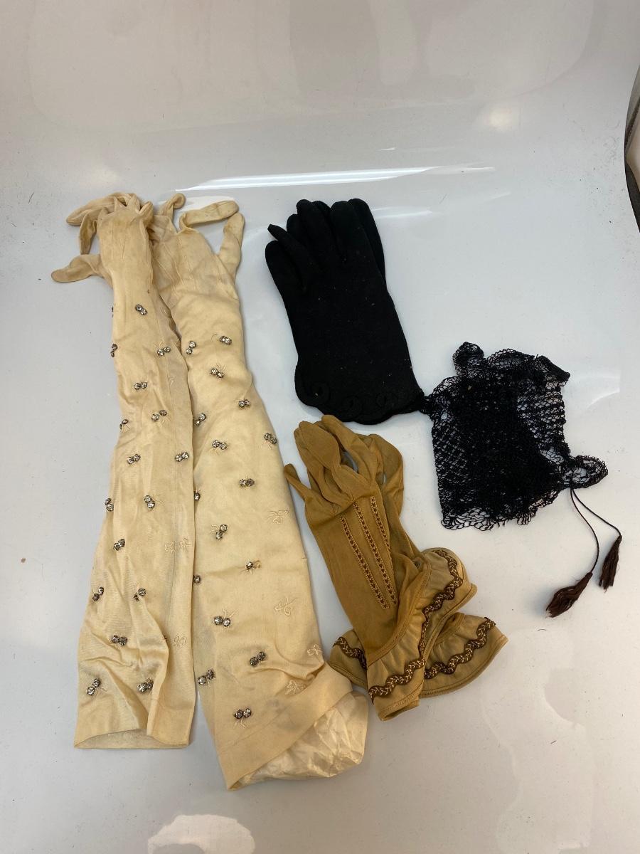 Vintage Lot of Four Pairs of Ladies Gloves Rhinestone Mesh Nylon. In vintage condition. The mesh and tan gloves do show signs of age and have holes. The solid black gloves are in good vintage condition. The elbow length gloves have added rhinestones to them, may be missing a stone or two.
