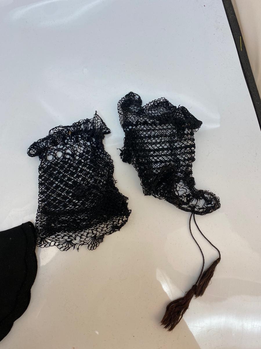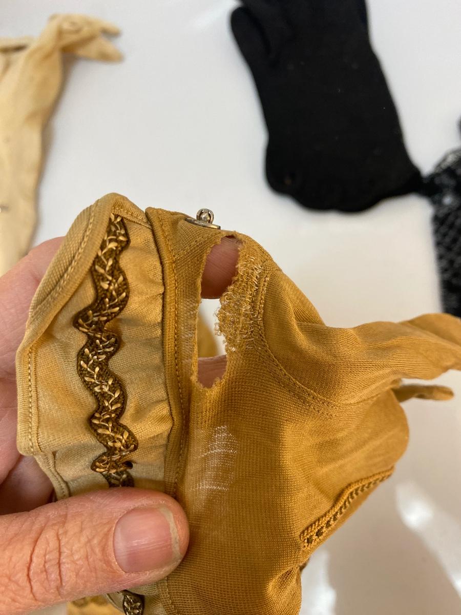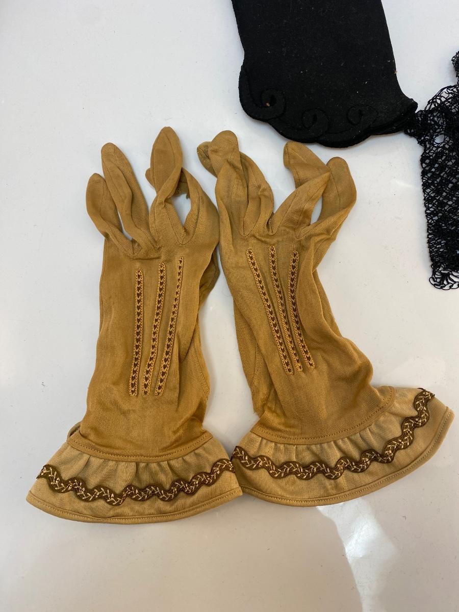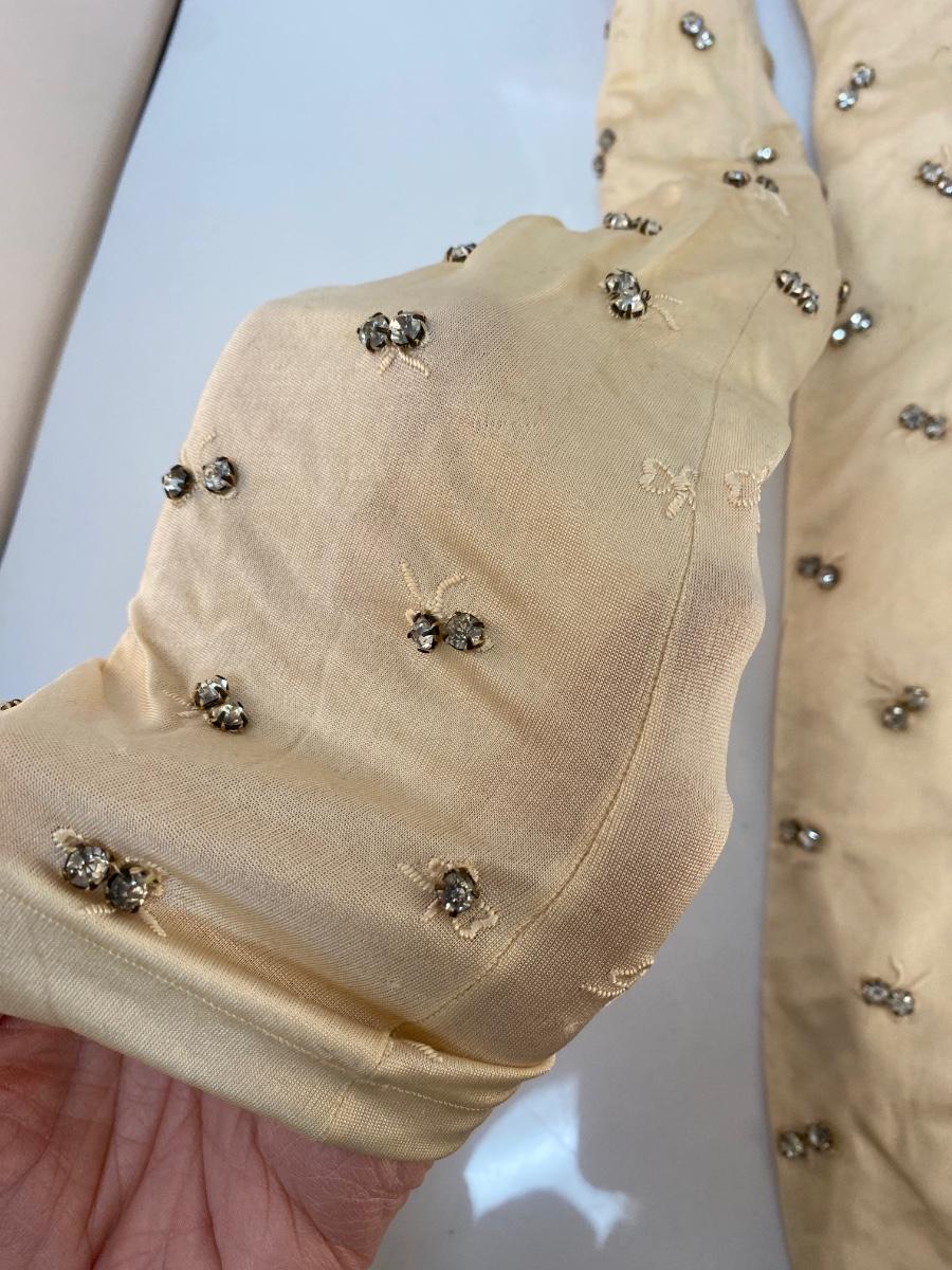 Vintage Lot of Four Pairs of Ladies Gloves Rhinestone Mesh Nylon. In vintage condition. The mesh and tan gloves do show signs of age and have holes. The solid black gloves are in good vintage condition. The elbow length gloves have added rhinestones to them, may be missing a stone or two.