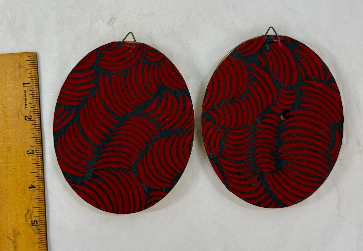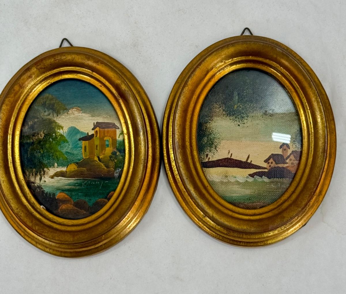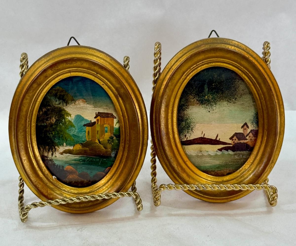 In Gold-painted oval wooden frames. Measures approx. 4.5” x 4”. Good condition.