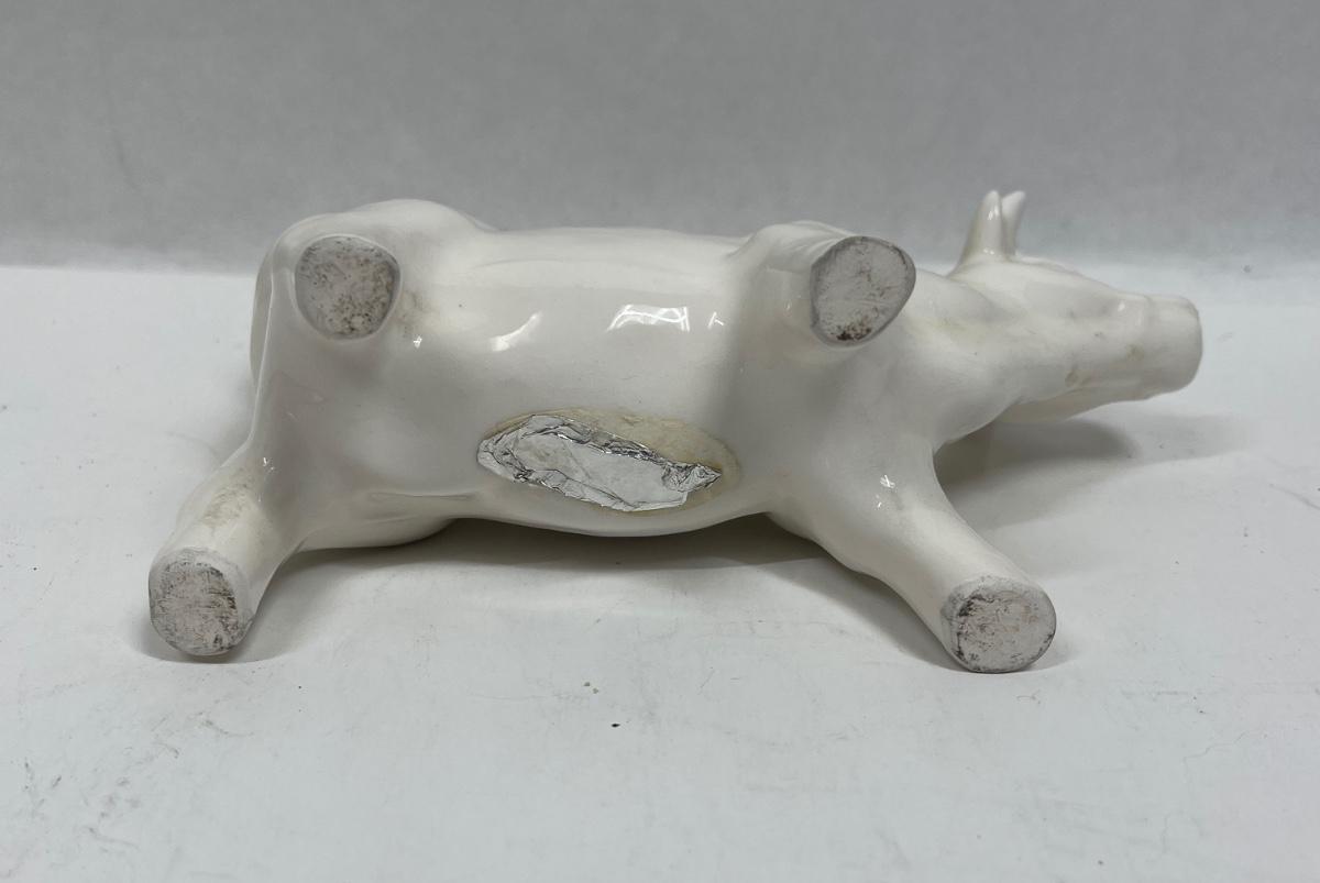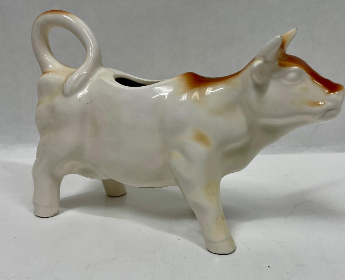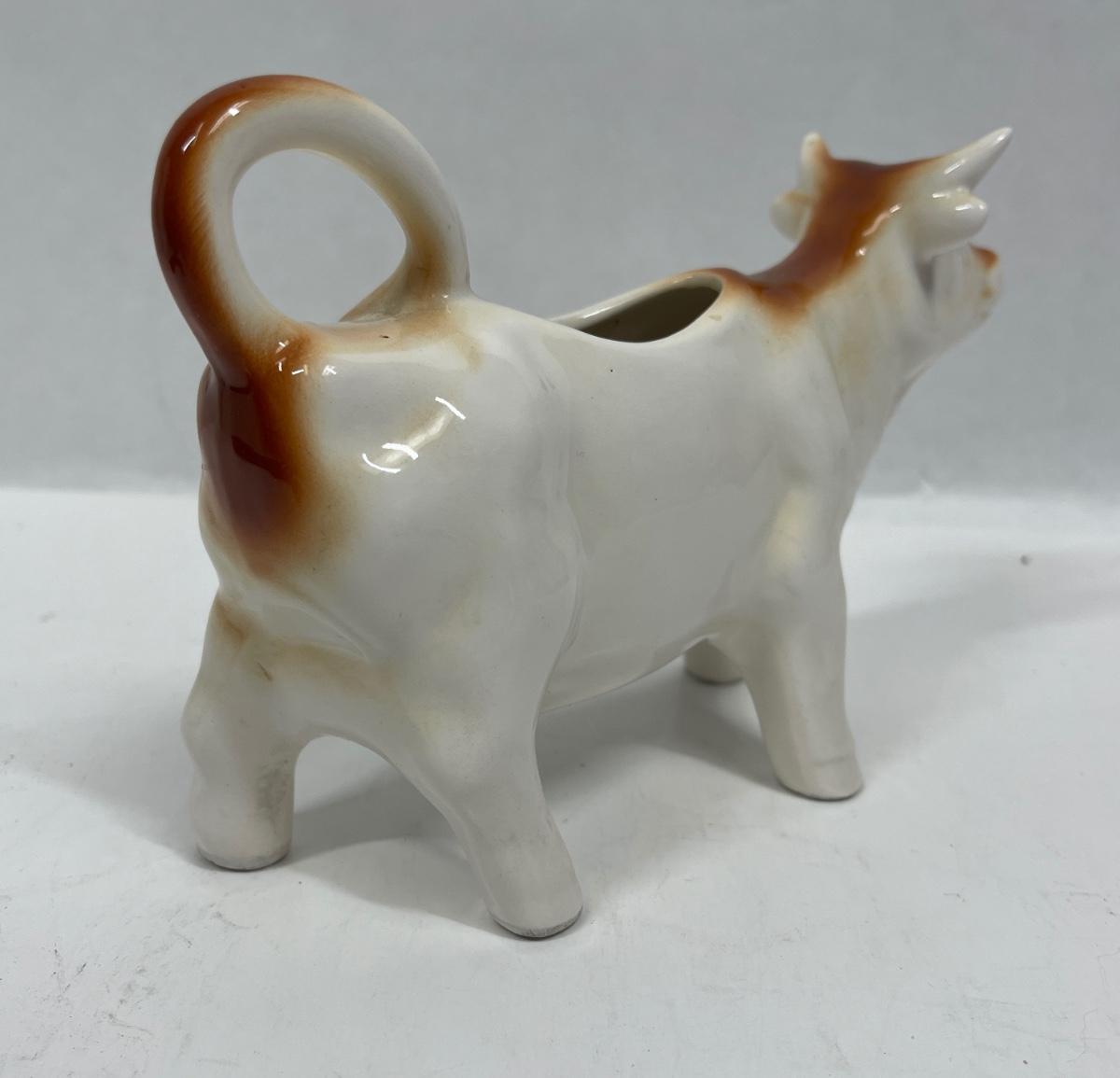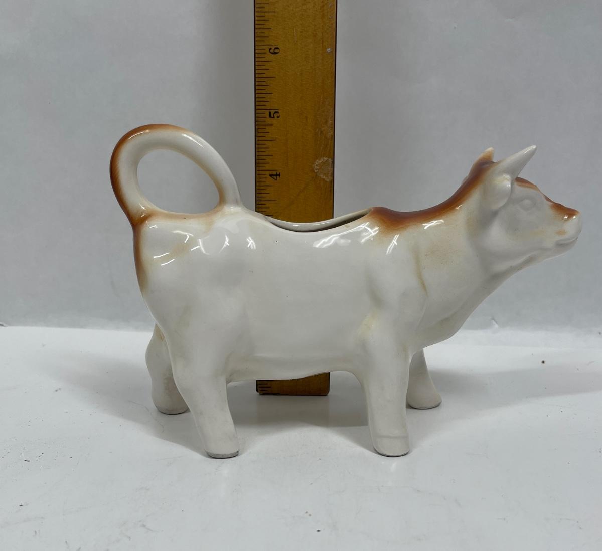 Silvertone foil sticker on the bottom is unreadable, but style and size matches the vintage cow creamer made in Germany.. In very good condition, no chips, cracks or crazing. Approx. 7" long.