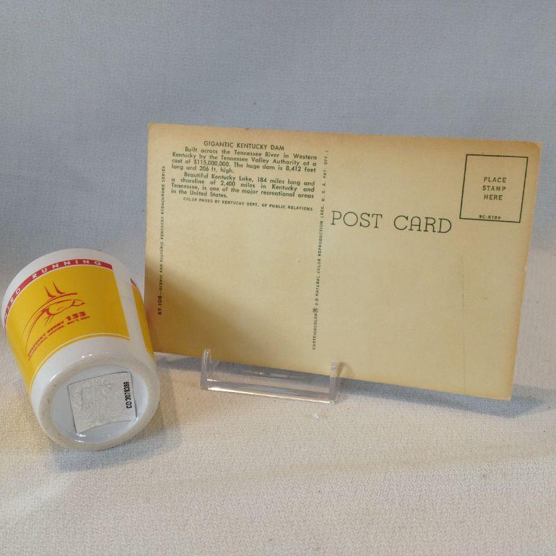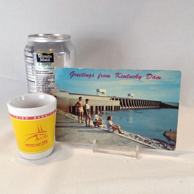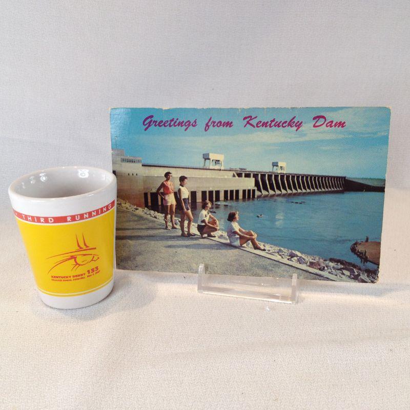 If you win this lot, you will get a 2007 Kentucky Derby Jigger and a vintage Kentucky Dam Post Card. Post card has yellowed with age but has never been used. Jigger is like new.