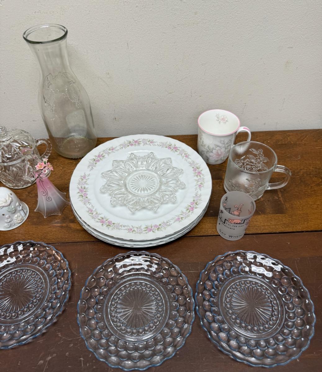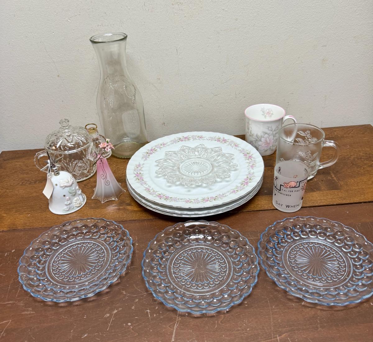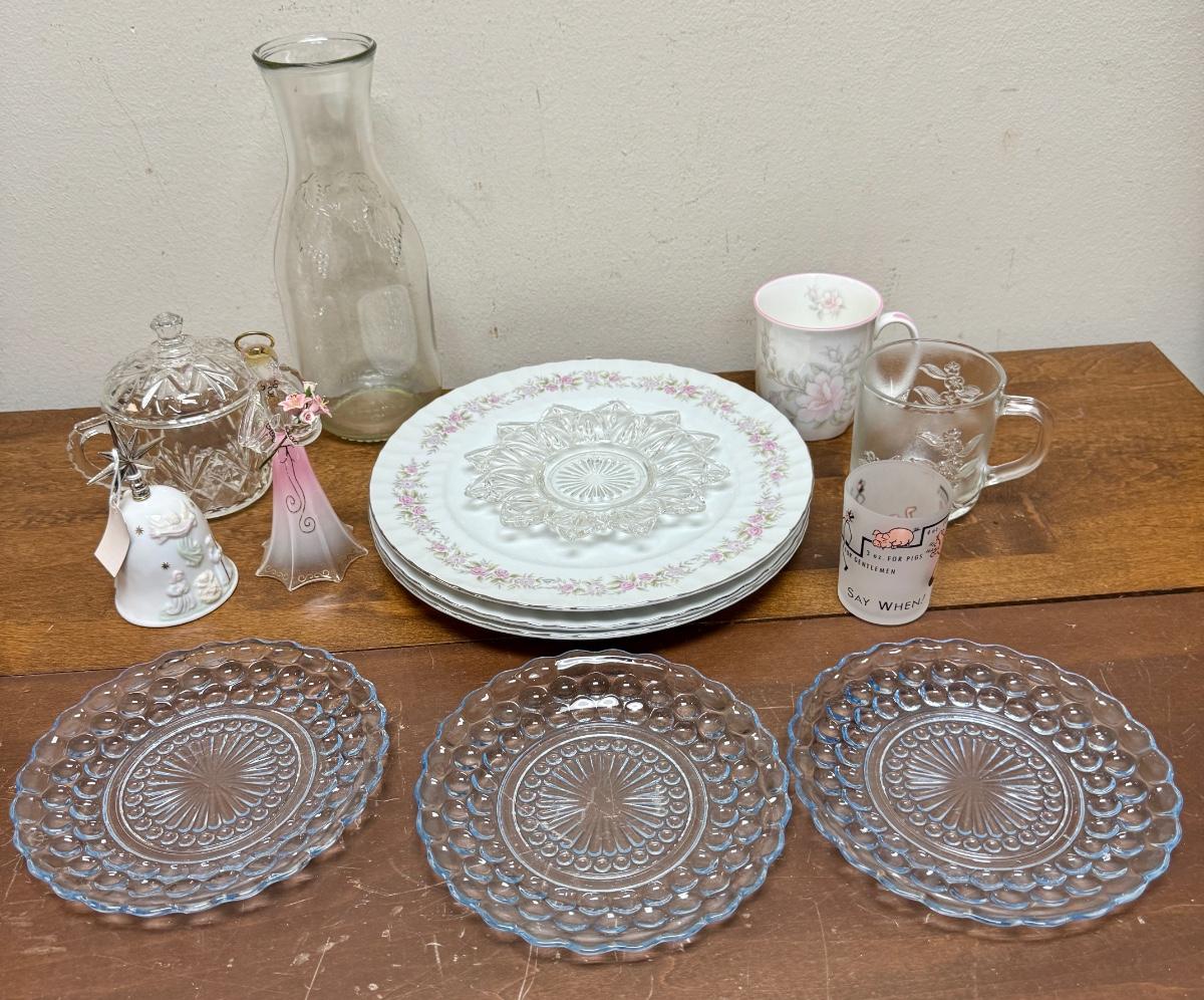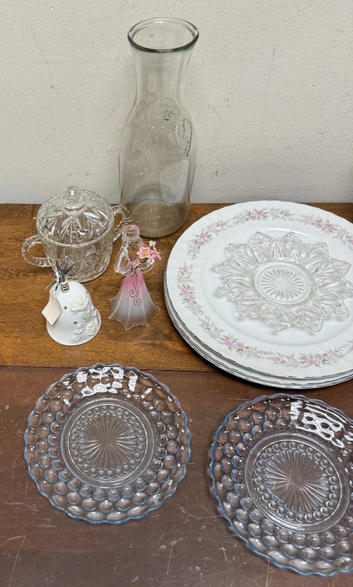 Bric Brac Lot - glass, ceramic, plates, cups, figurines, bells, Carafe, etc