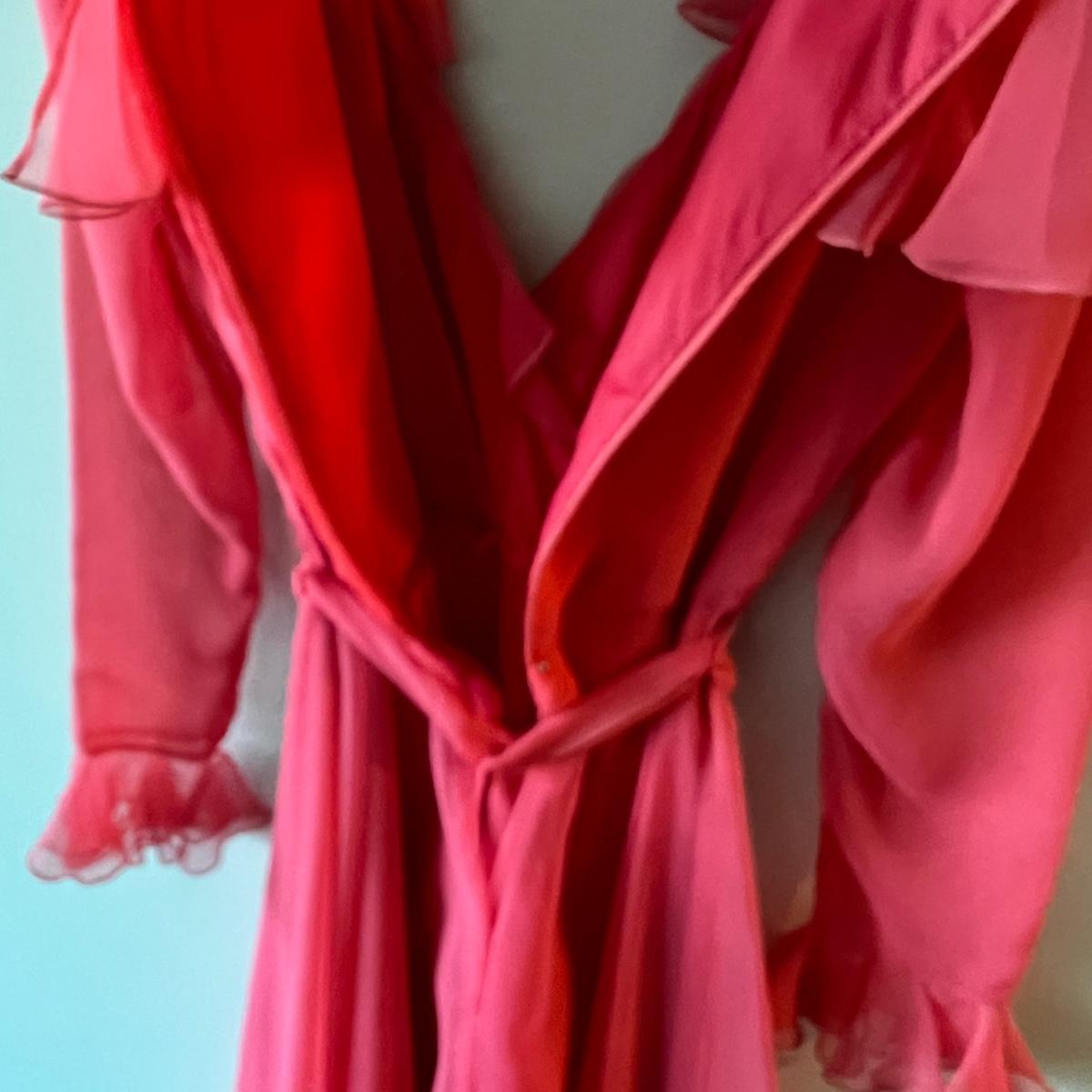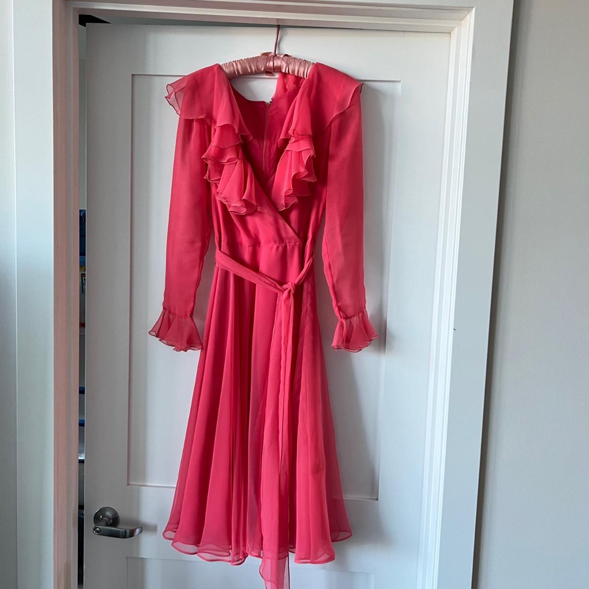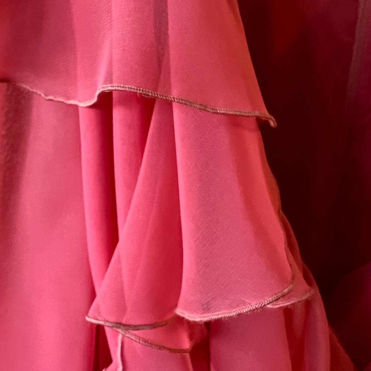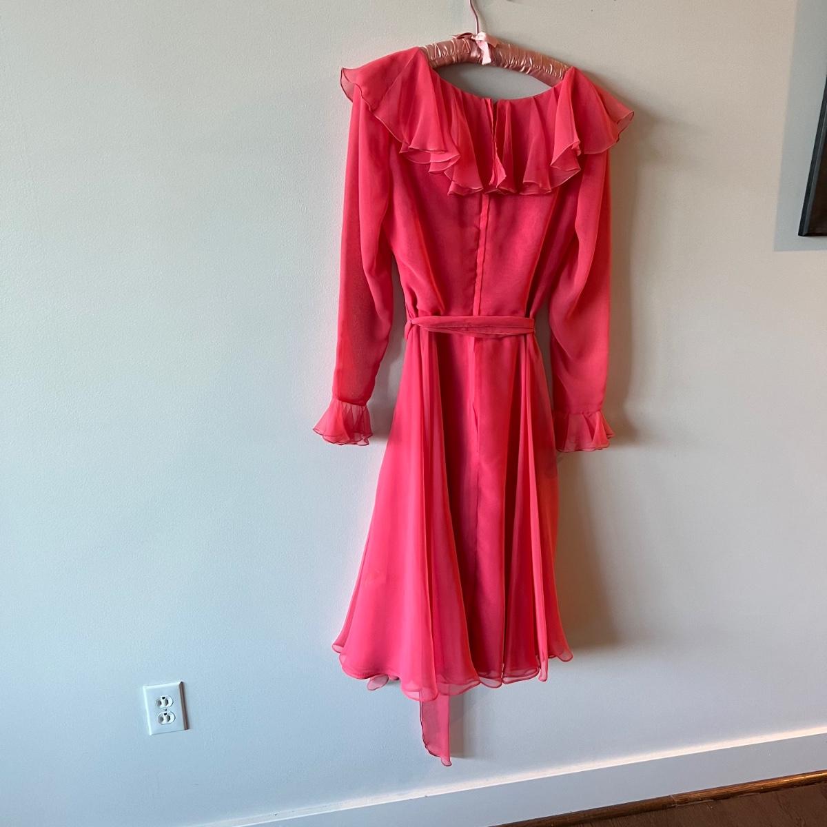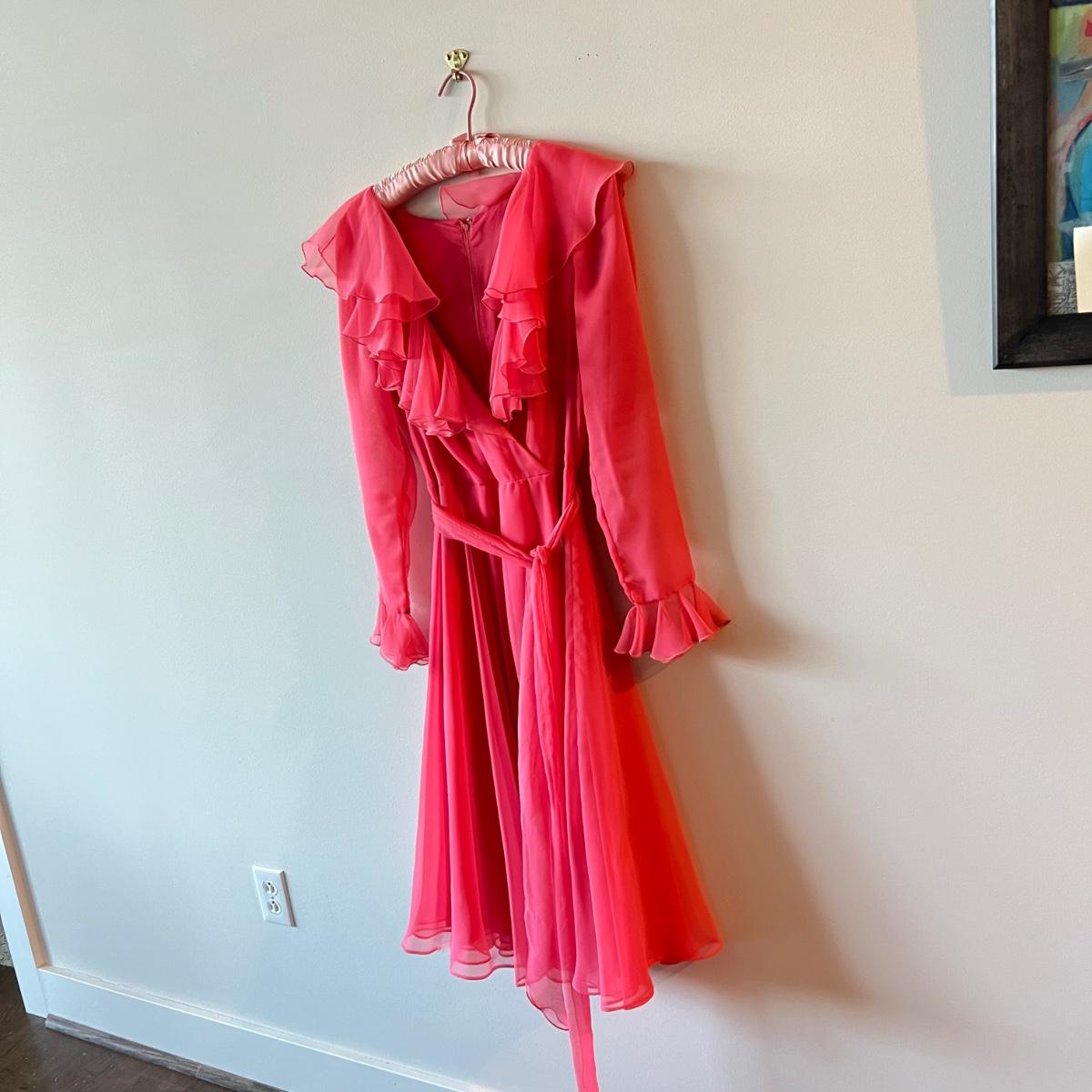 This vintage dress is size 10 and pink with multi layered skirt and a ruffled neckline. It has a zipper that ends just below the waist and a matching belt. Dress is in excellent condition. Dress falls below the knee at 28” long from the waist with a total length of 44” (shoulder to hem). Silk like padded hanger included.