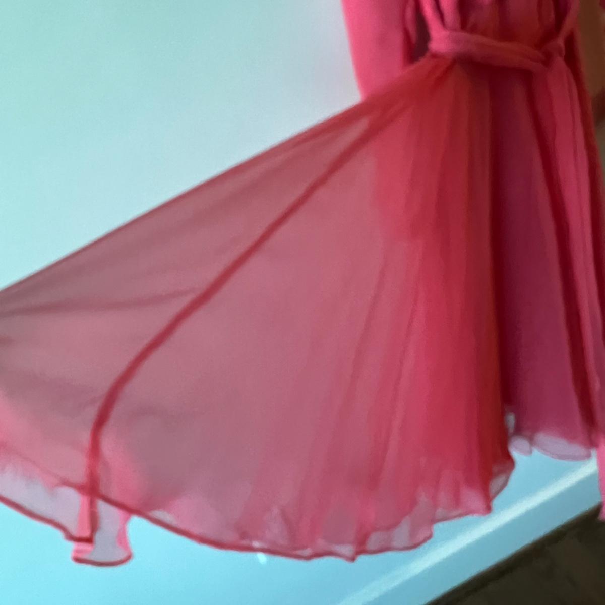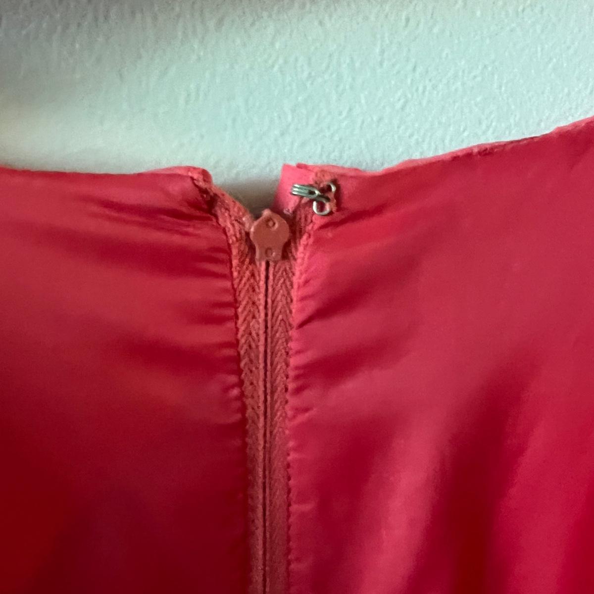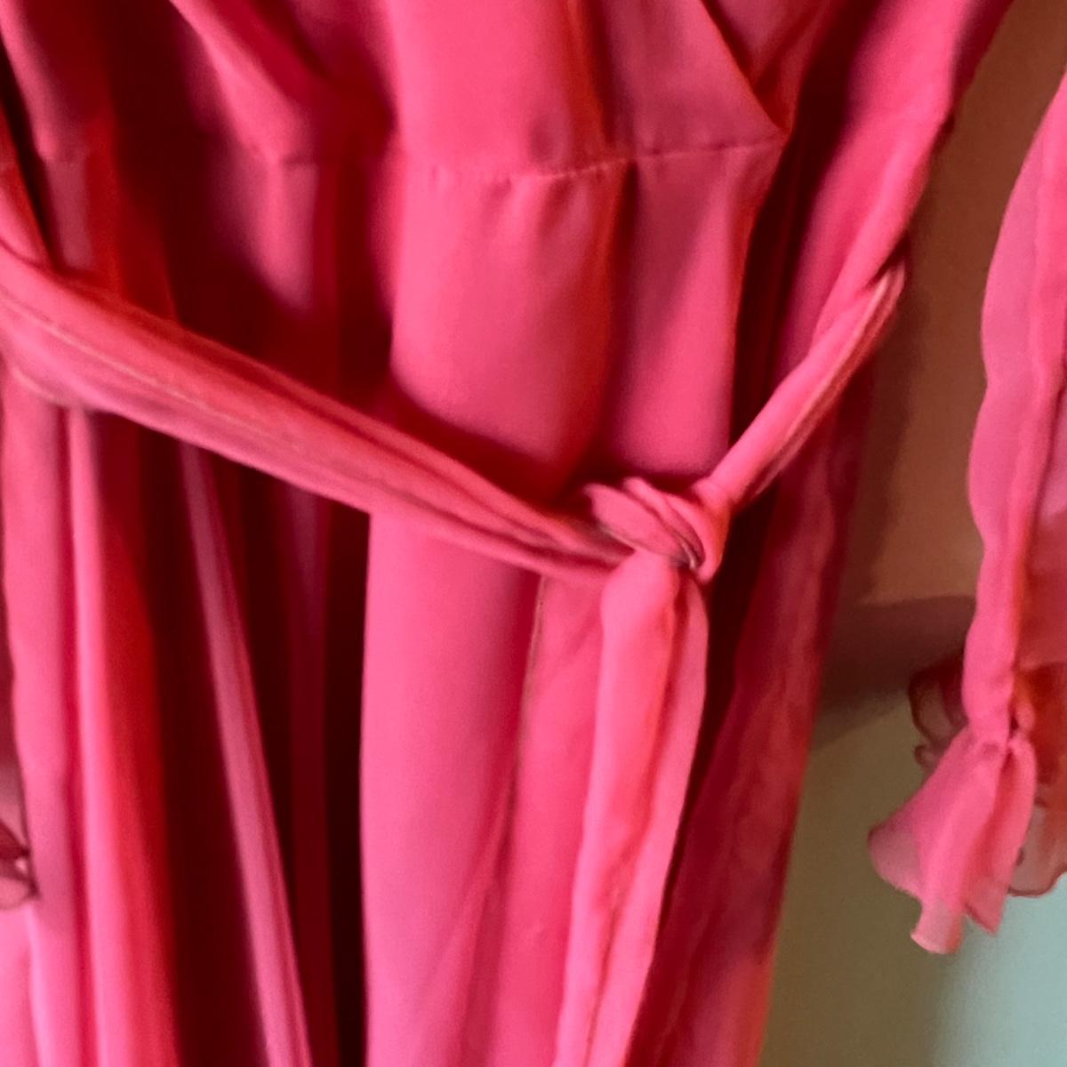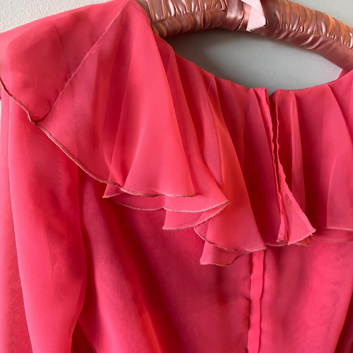 This vintage dress is size 10 and pink with multi layered skirt and a ruffled neckline. It has a zipper that ends just below the waist and a matching belt. Dress is in excellent condition. Dress falls below the knee at 28” long from the waist with a total length of 44” (shoulder to hem). Silk like padded hanger included.