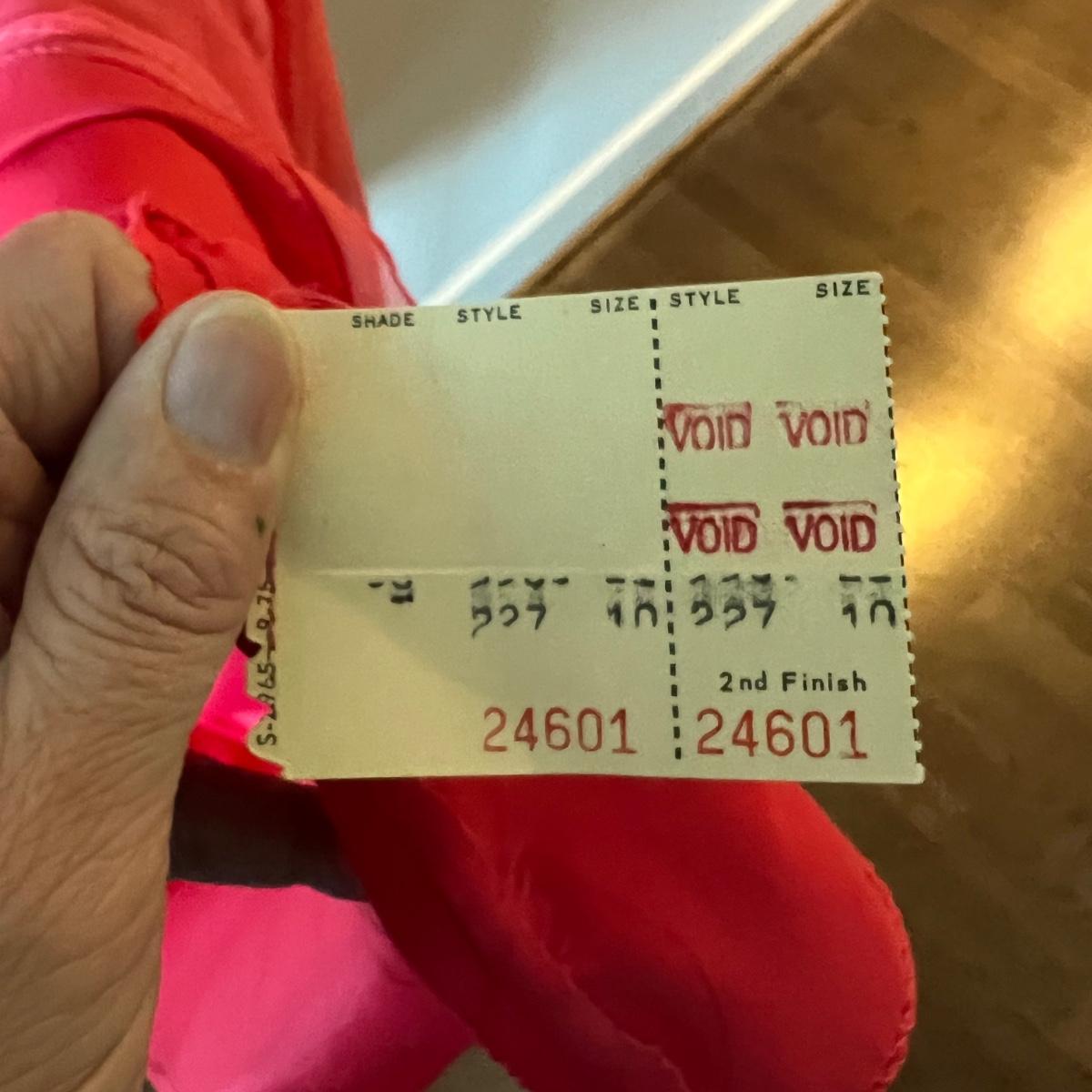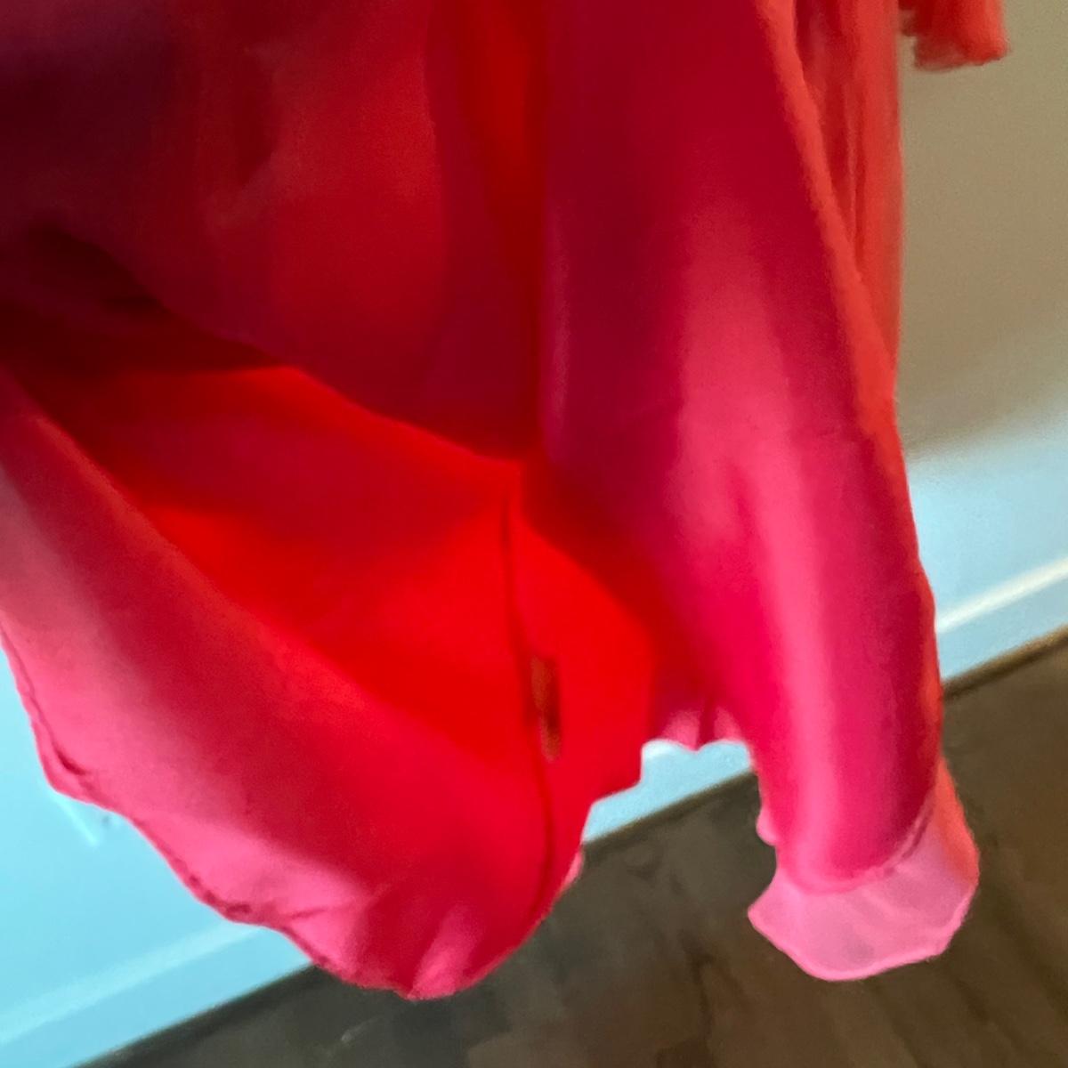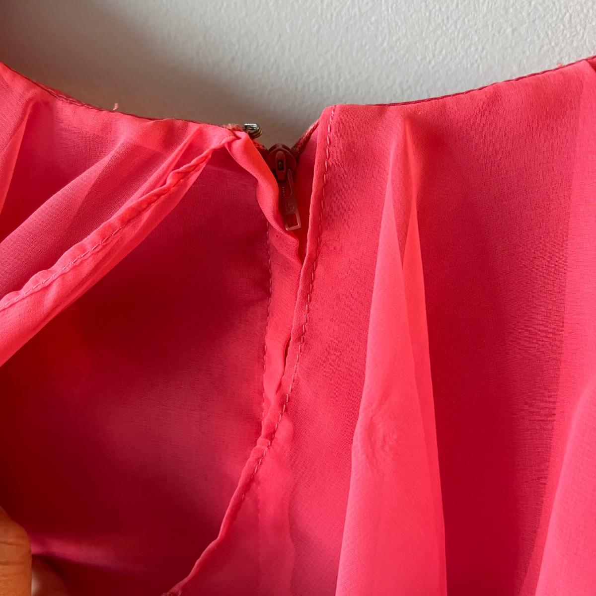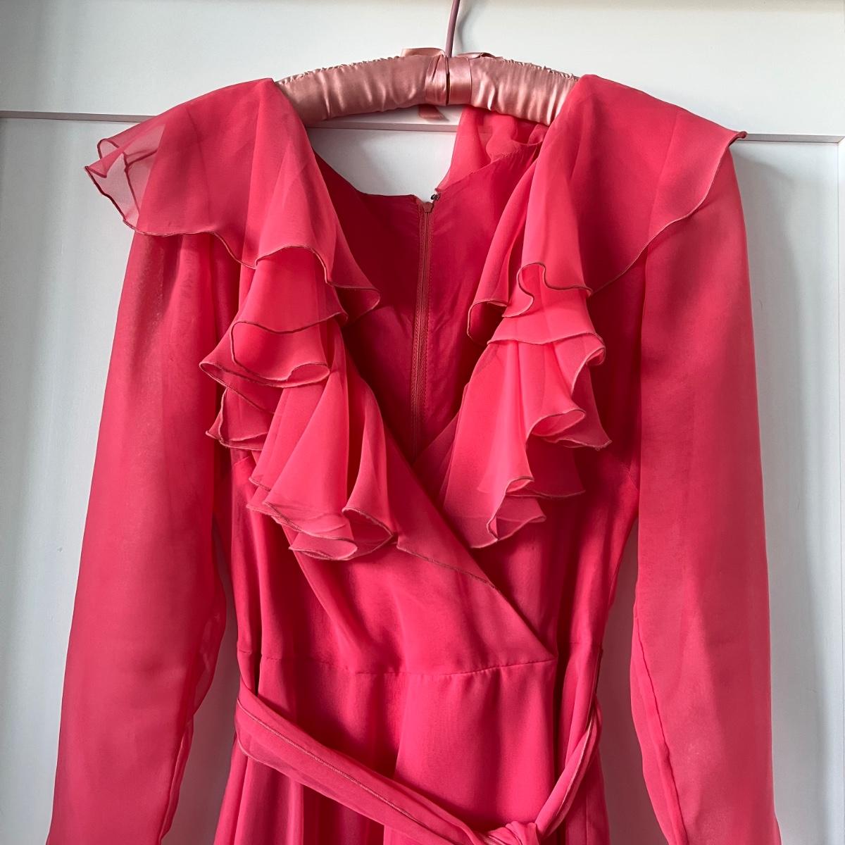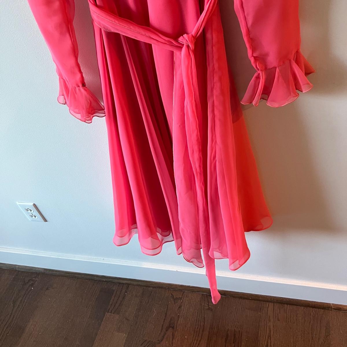 This vintage dress is size 10 and pink with multi layered skirt and a ruffled neckline. It has a zipper that ends just below the waist and a matching belt. Dress is in excellent condition. Dress falls below the knee at 28” long from the waist with a total length of 44” (shoulder to hem). Silk like padded hanger included.
