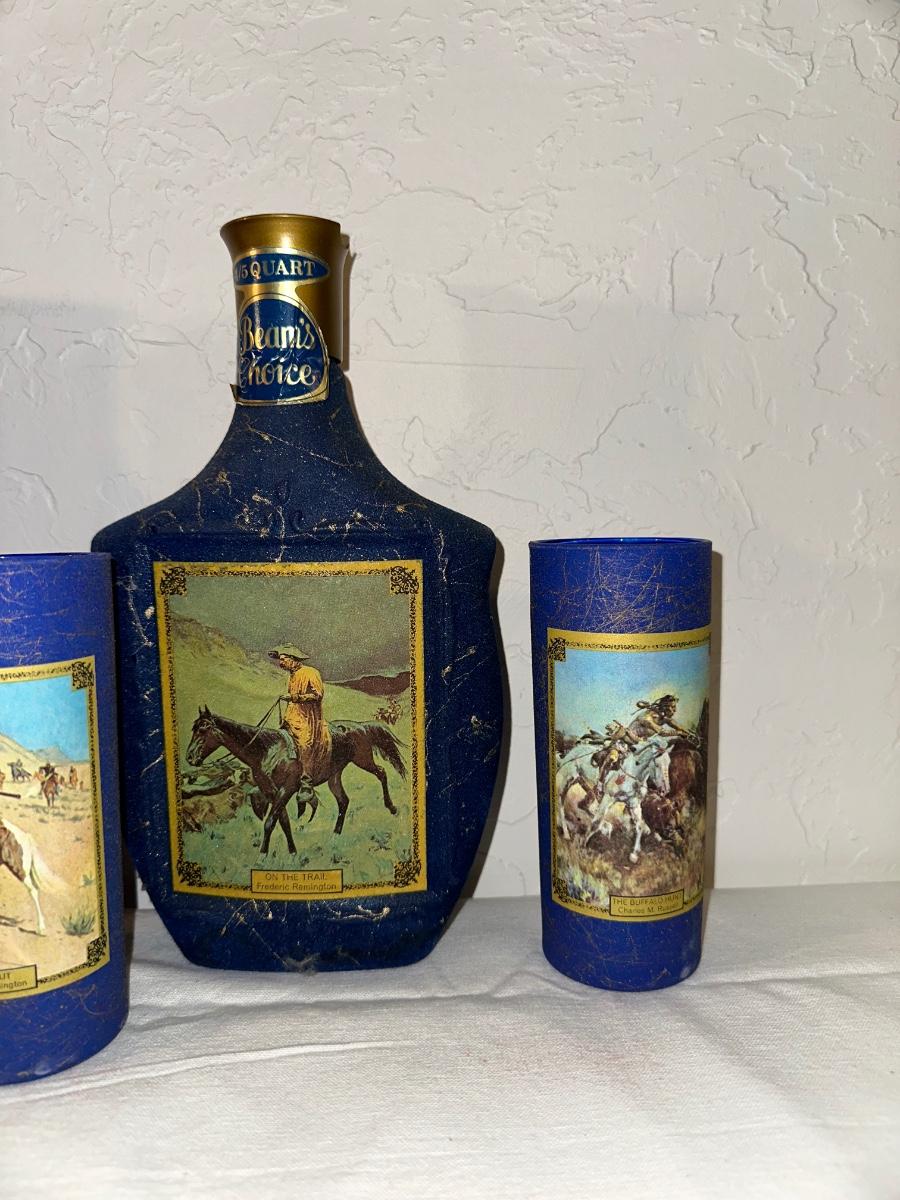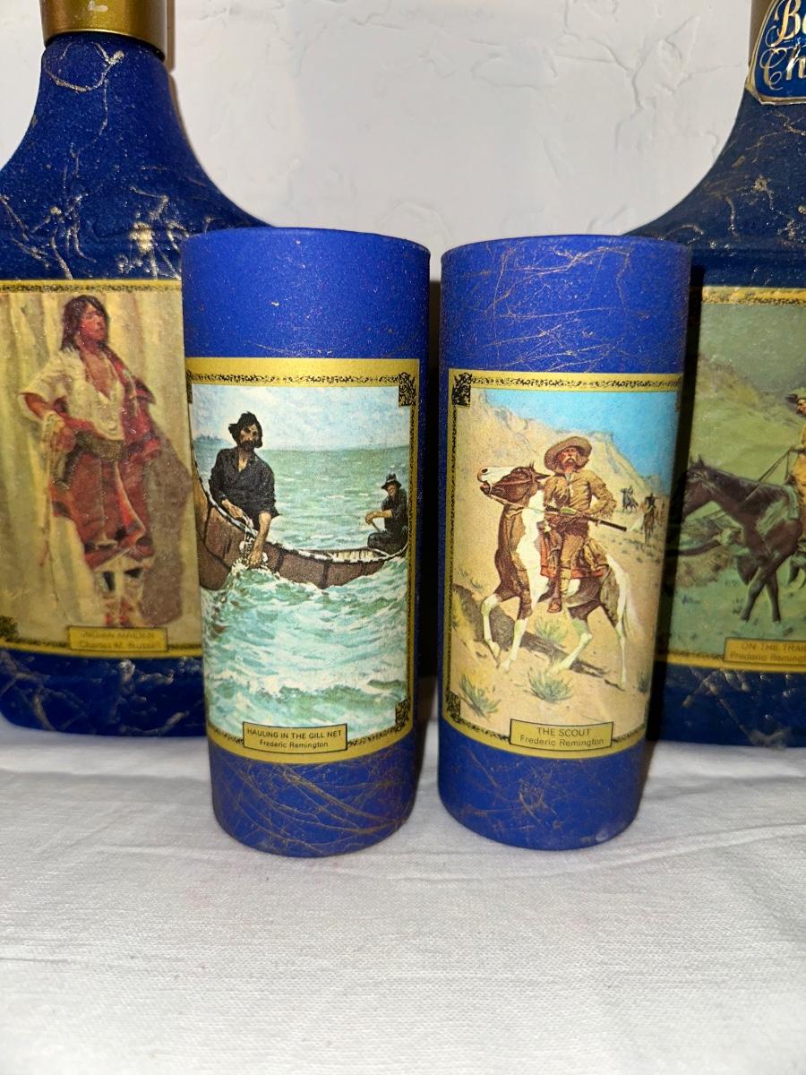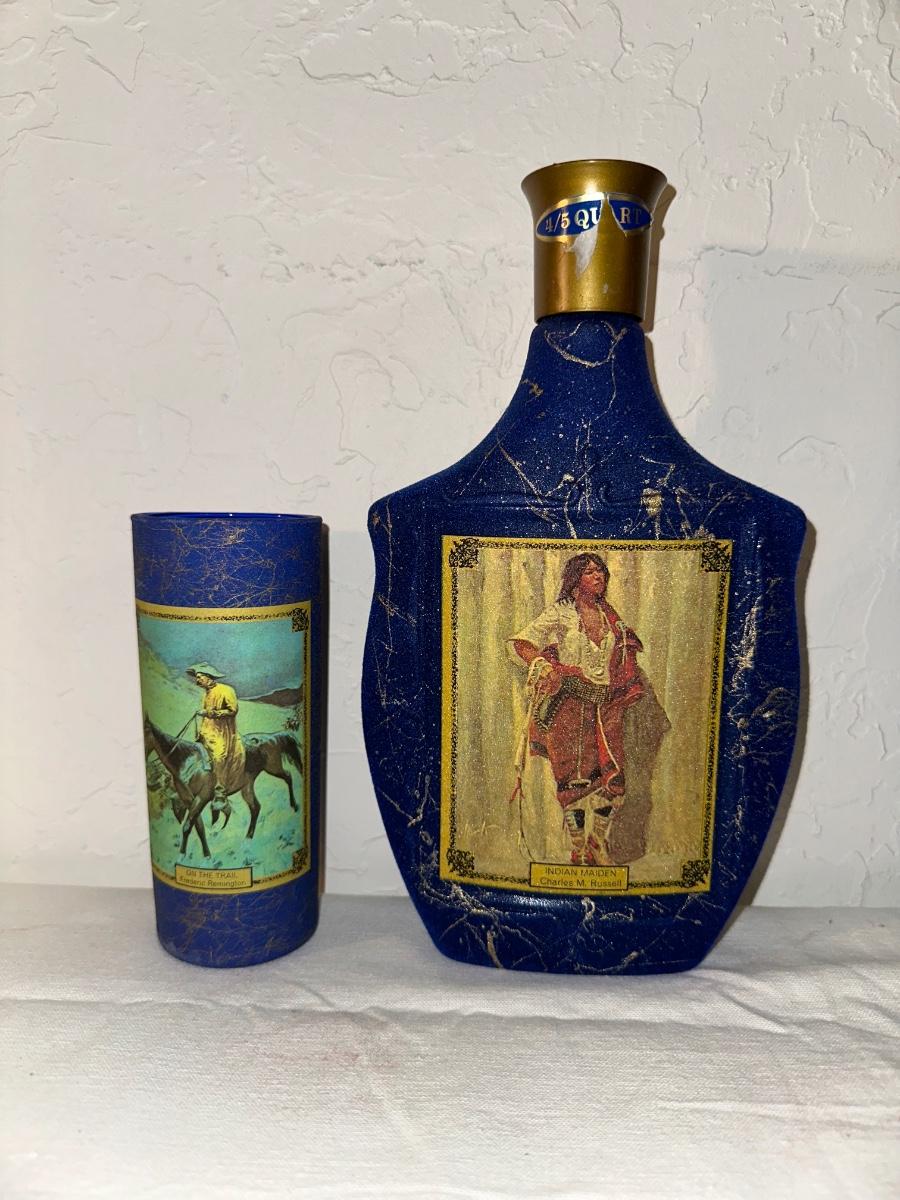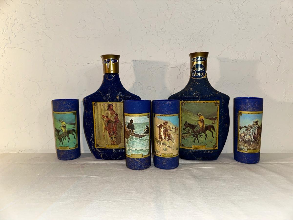 JIM BEAM "ON THE TRAIL" AND "INDIAN MAIDEN" 1 SEALED PLUS 4 GLASSES