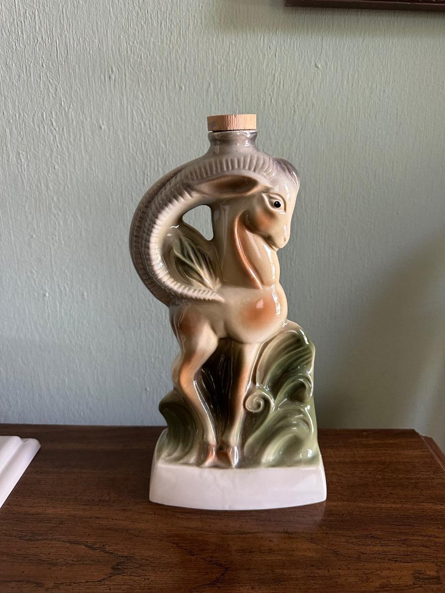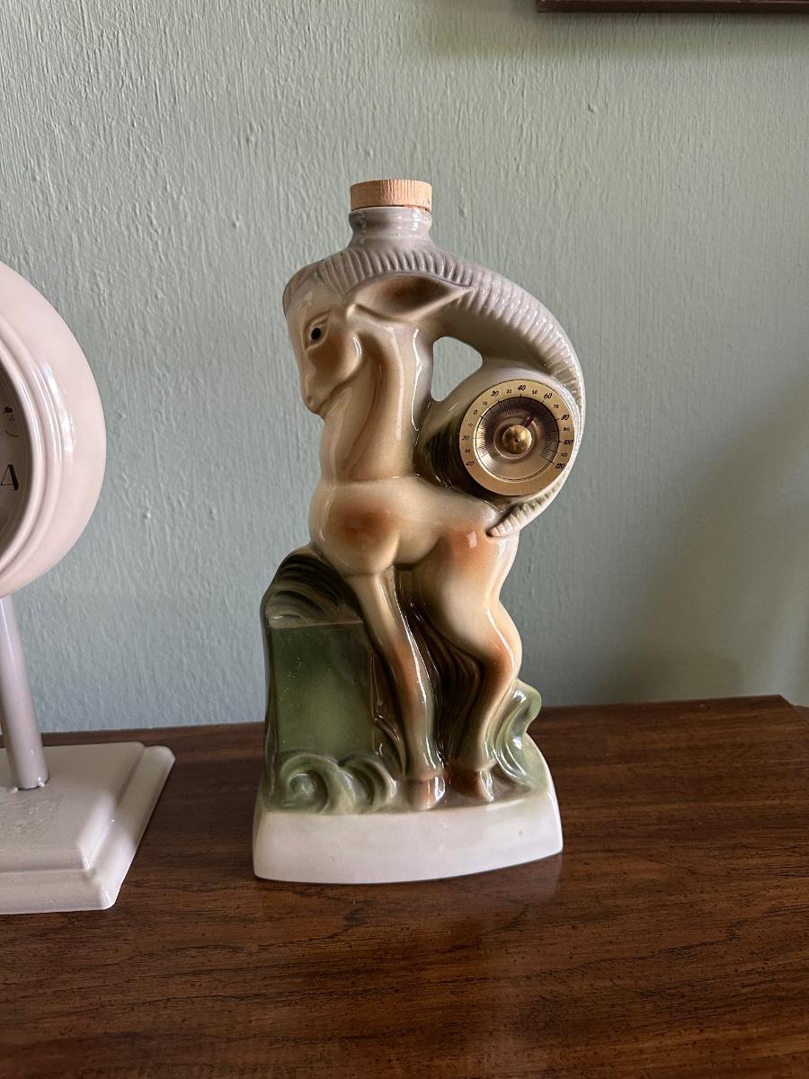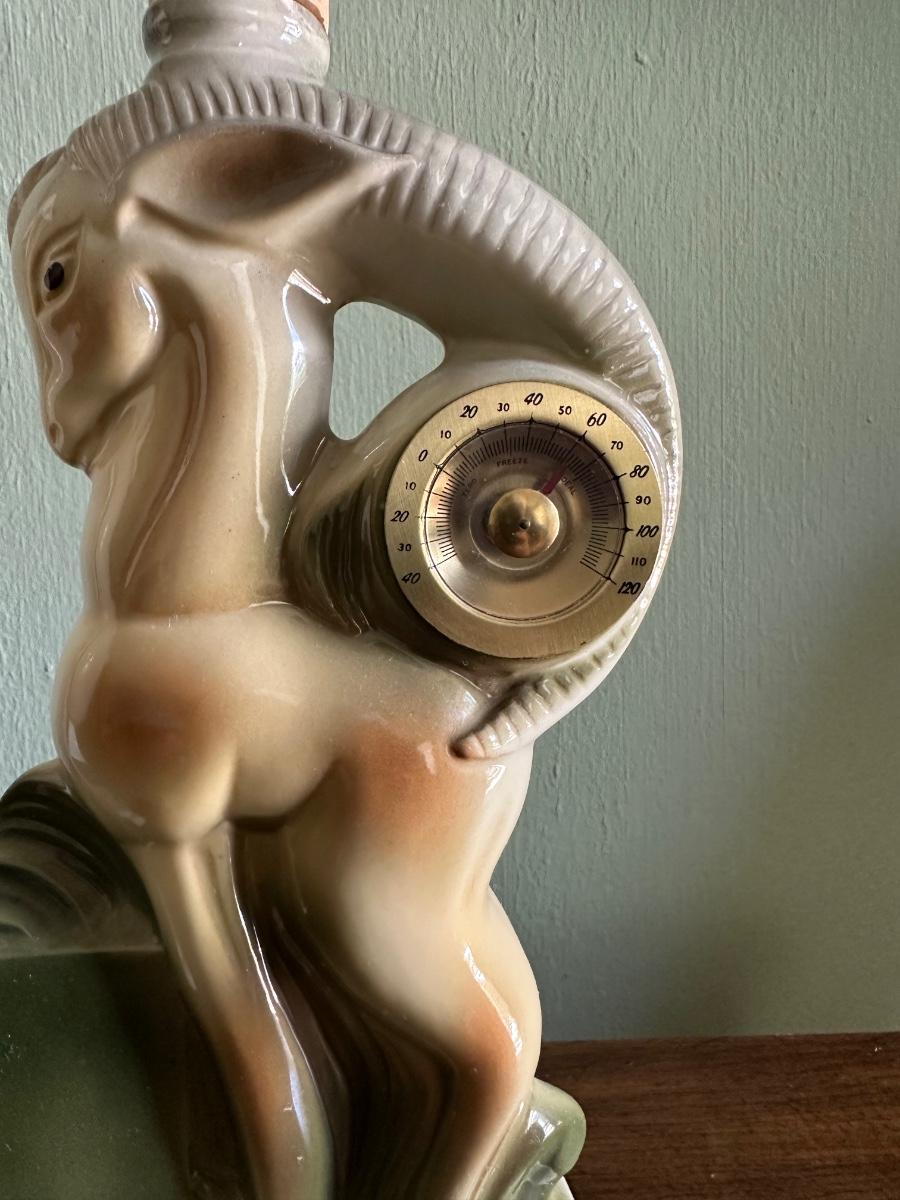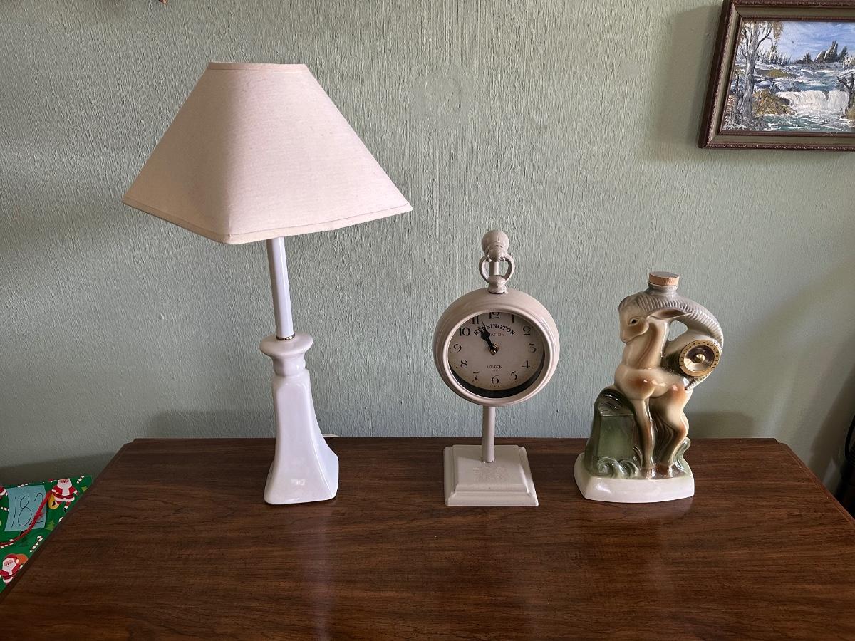 JIM BEAM RAM WITH THERMOMETER, KENSINGTON STATION CLOCK AND A TABLE LAMP