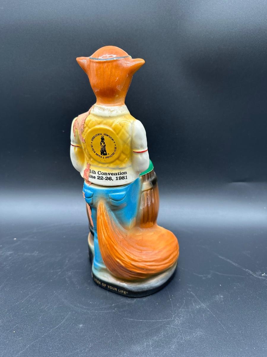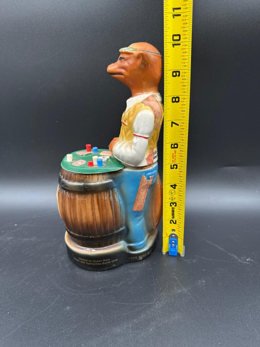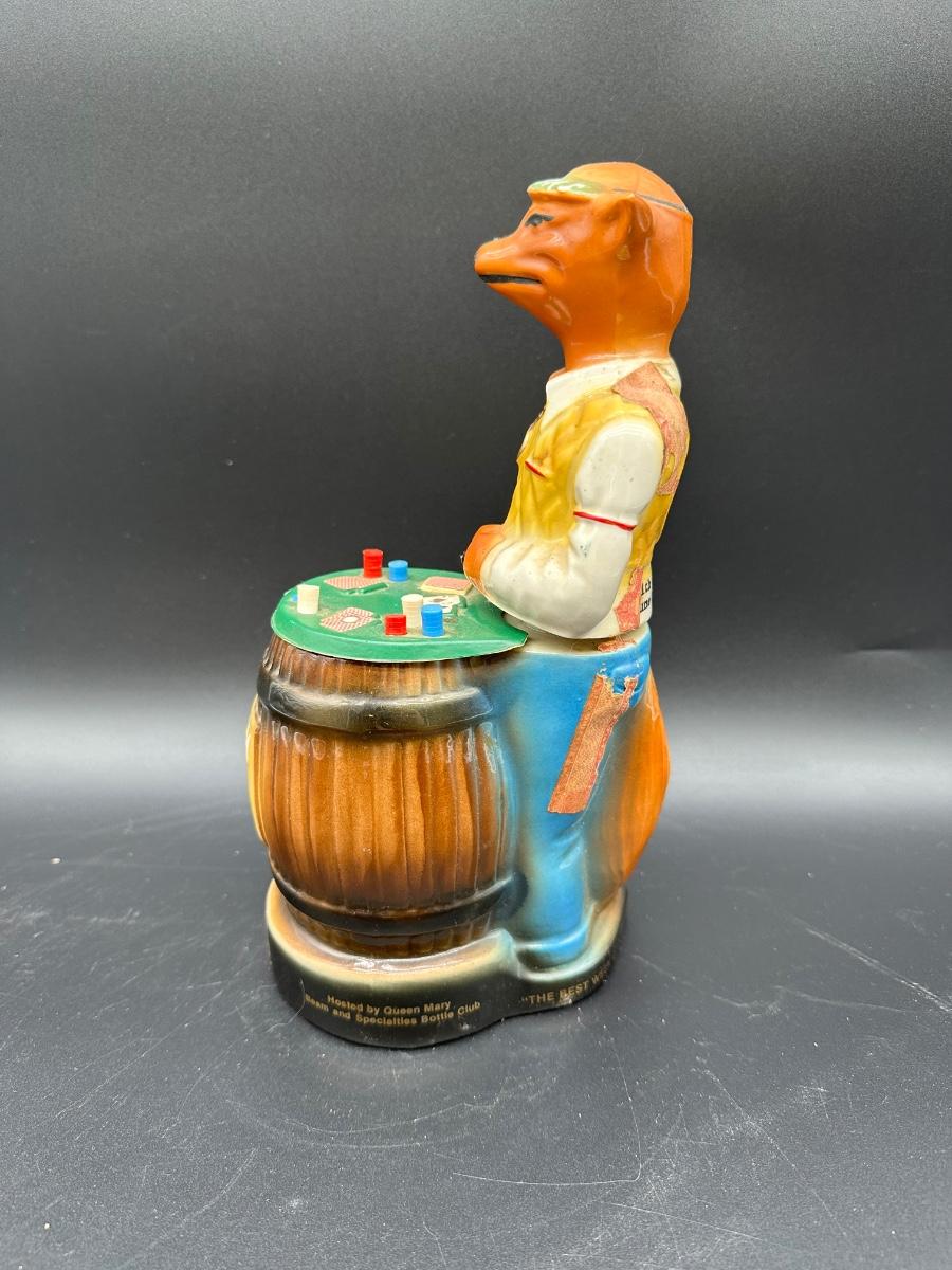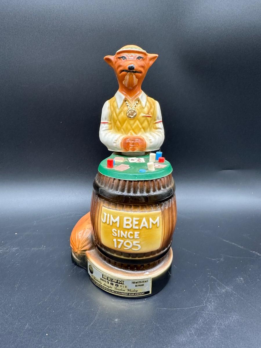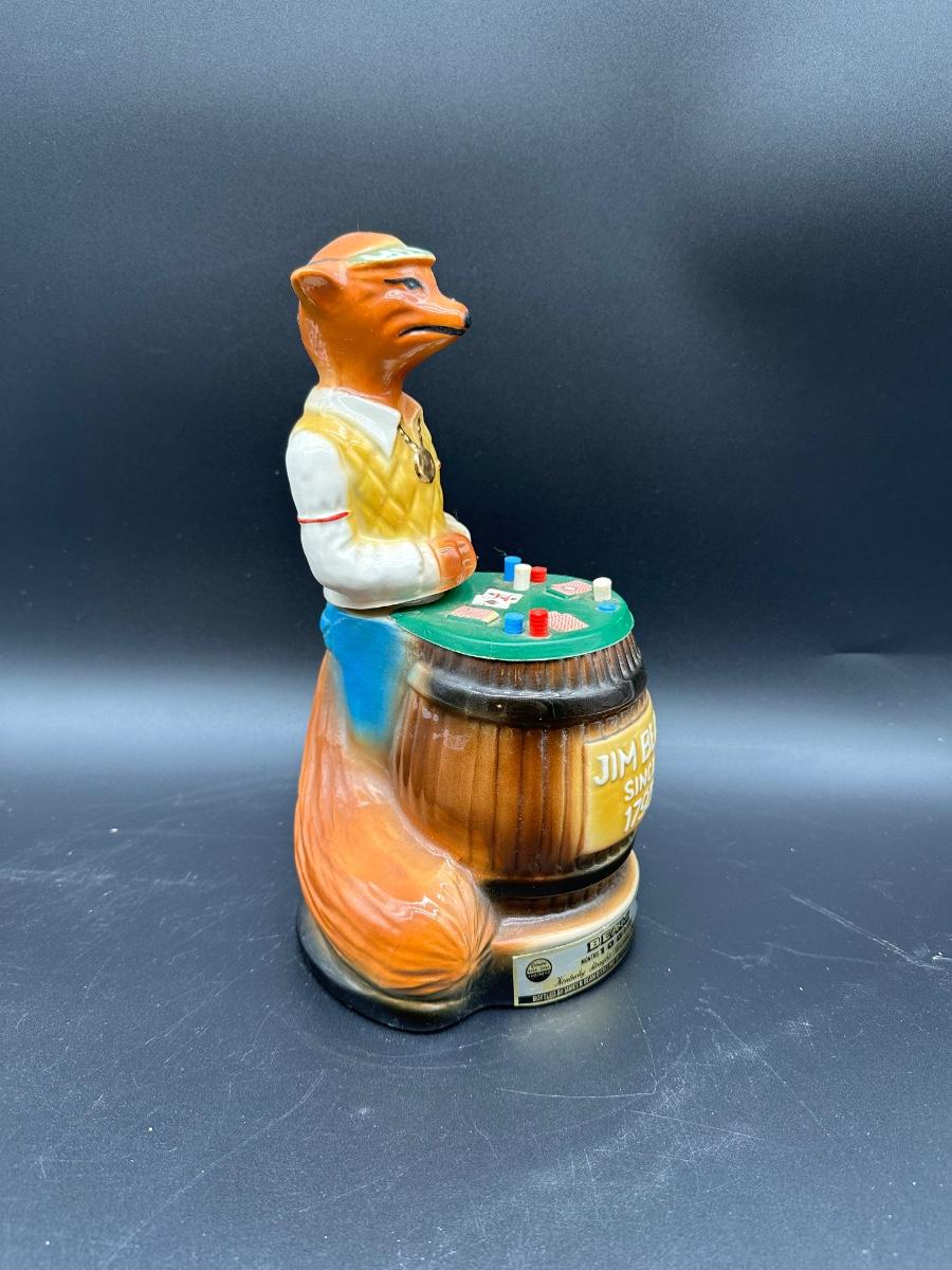 Vintage Jim Beam ceramic whiskey decanter featuring a fox character playing cards at a poker table, leaning against a Jim Beam barrel marked “Jim Beam Since 1795.” Produced in Decatur (as noted), this figural decanter stands approximately 10–11 inches tall.