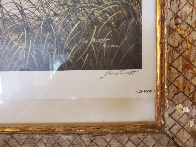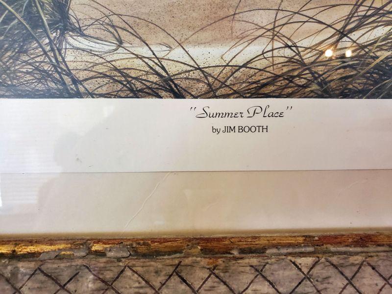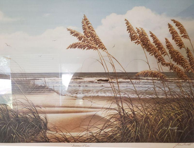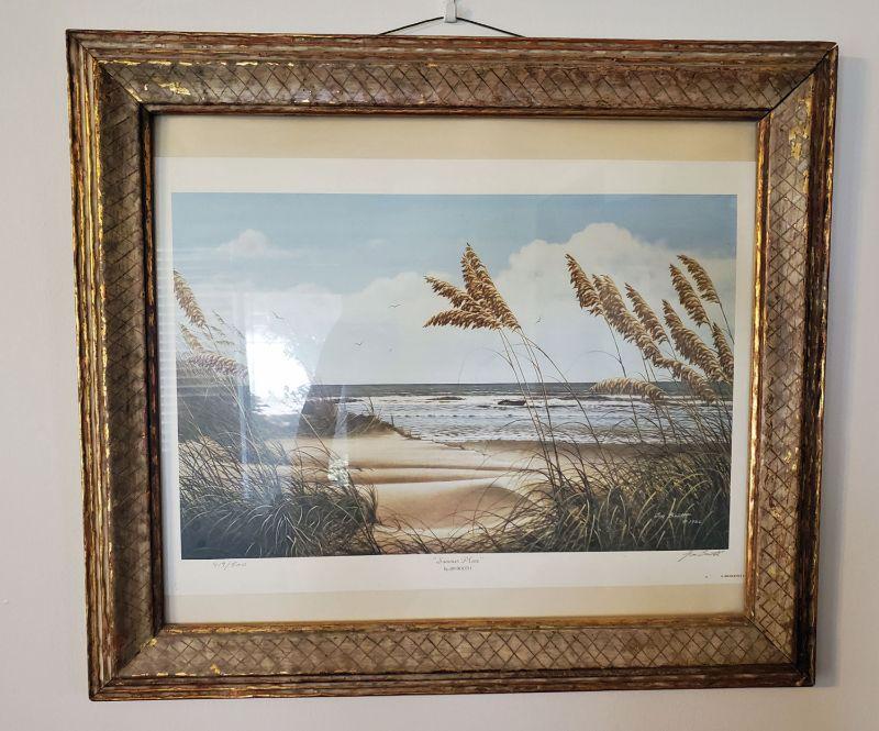Title "Summer Place", the print is numbered 419/500. It is double signed by the artist. and dated 1982. The print is in overall good condition, behind glass in a carved wood frame. The frame measures 28 1/2" x 22 1/2" on the outside.
